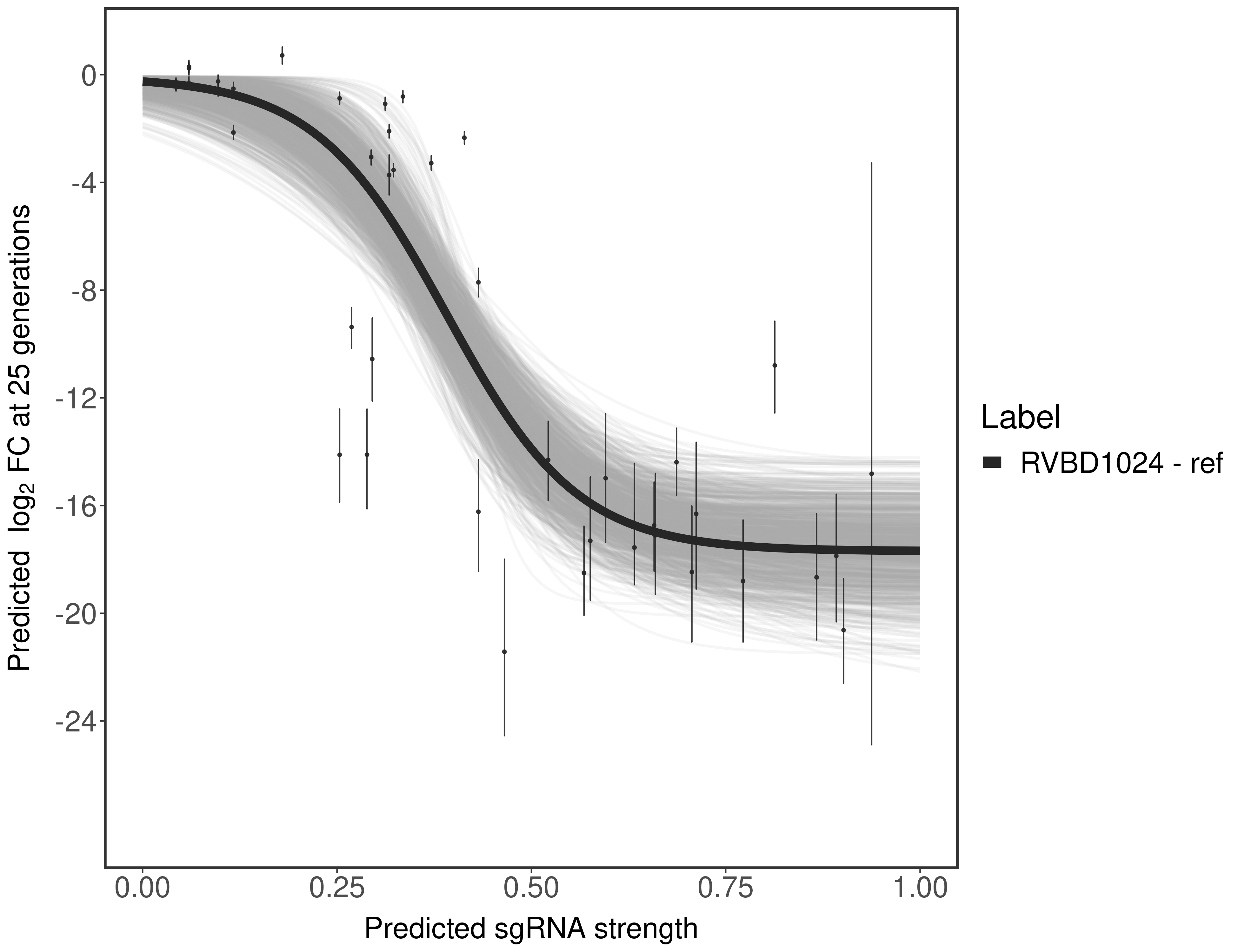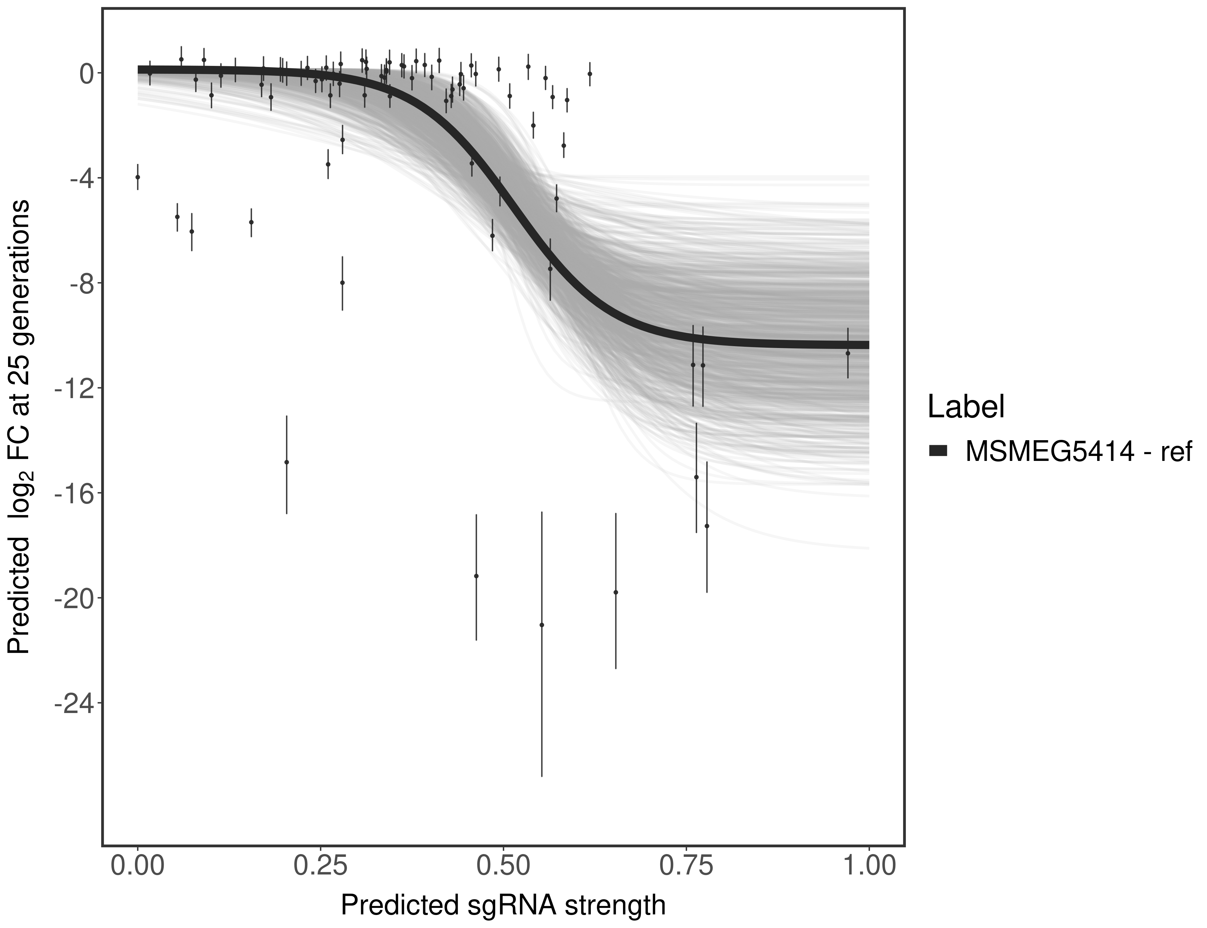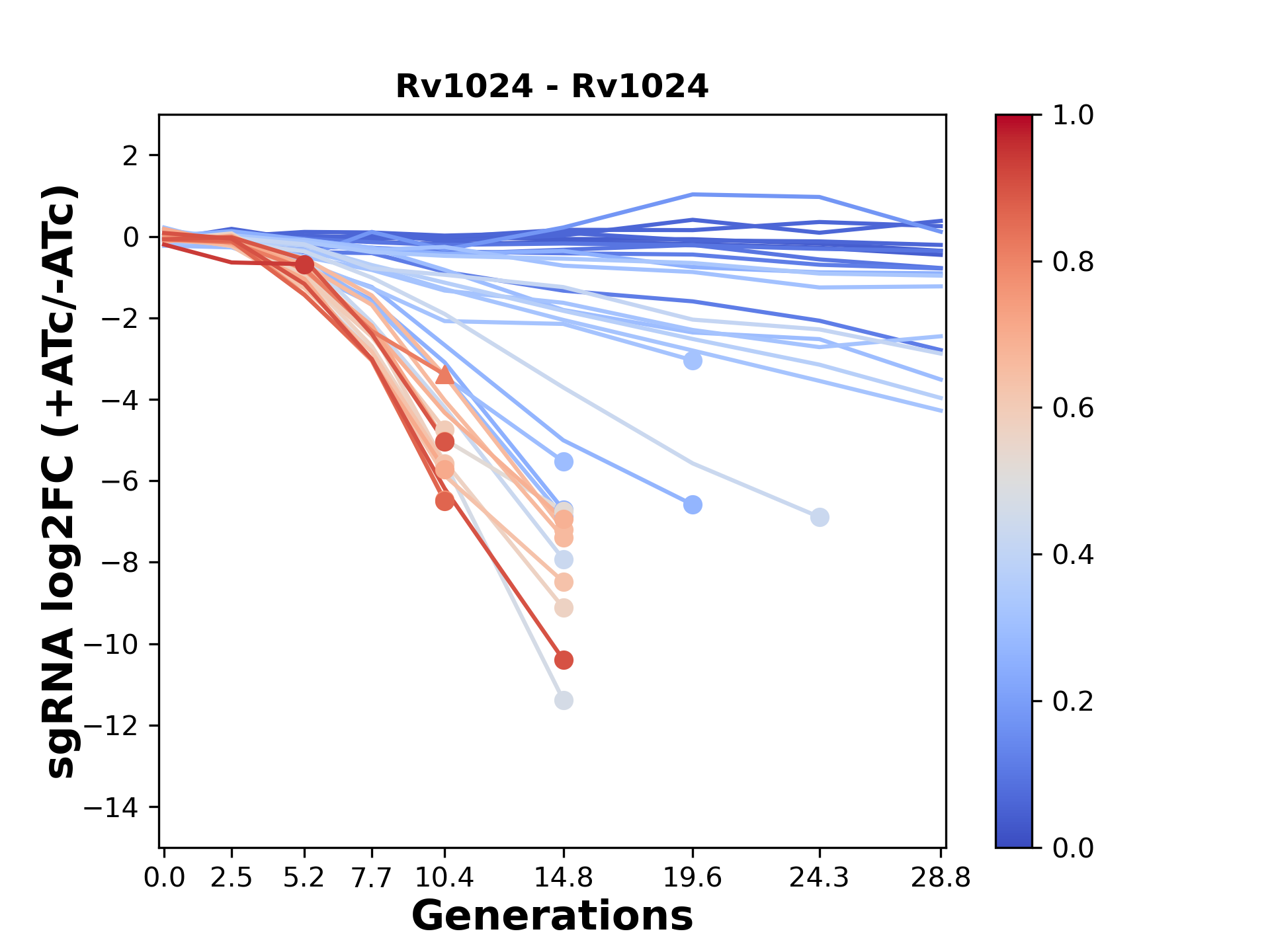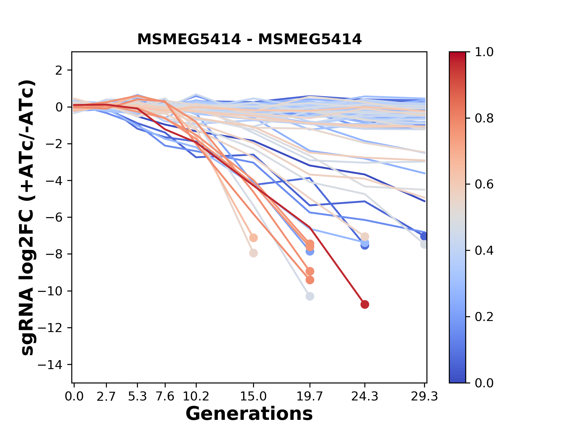 Experiment: We designed an M. tuberculosis CRISPRi library (RLC12) to target all annotated Mtb genes with single guide RNAs (sgRNAs) of varying predicted knockdown efficiencies. In parallel, we constructed a M. smegmatis CRISPRi library (RLC11) to target all annotated Msmeg genes, similar to the Mtb sgRNA library. RLC12 was transformed into M. tuberculosis H37Rv; RLC11 into M. smegmatis mc2-155. We passaged both CRISPRi libraries for nearly 30 generations in the presence or absence of the CRISPRi-inducer anhydrotetracycline (ATc). At the indicated timepoints, genomic DNA was harvested and the representation of individual sgRNAs was counted using Illumina sequencing. Here, we show sgRNA log2 fold-change values (L2FC) (plus versus minus ATc) over consecutive generations for sgRNAs targeting the gene you selected. sgRNAs are color-coded based on their predicted strength from blue (strength=0; weak) to red (strength=1; strong).