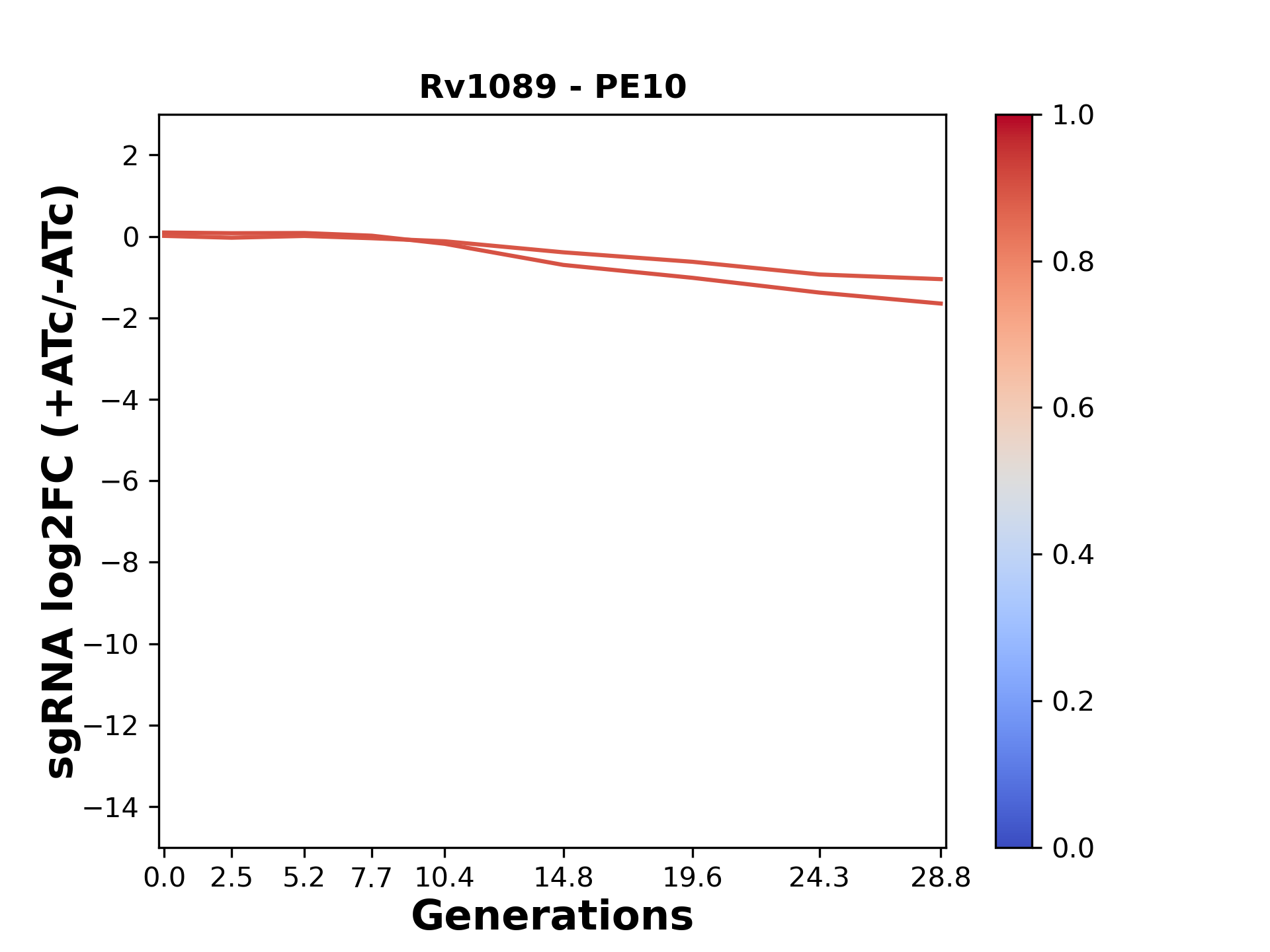 Here, we show sgRNA log2 fold-change values (L2FC) (plus versus minus ATc) over consecutive generations for sgRNAs targeting the gene you selected.