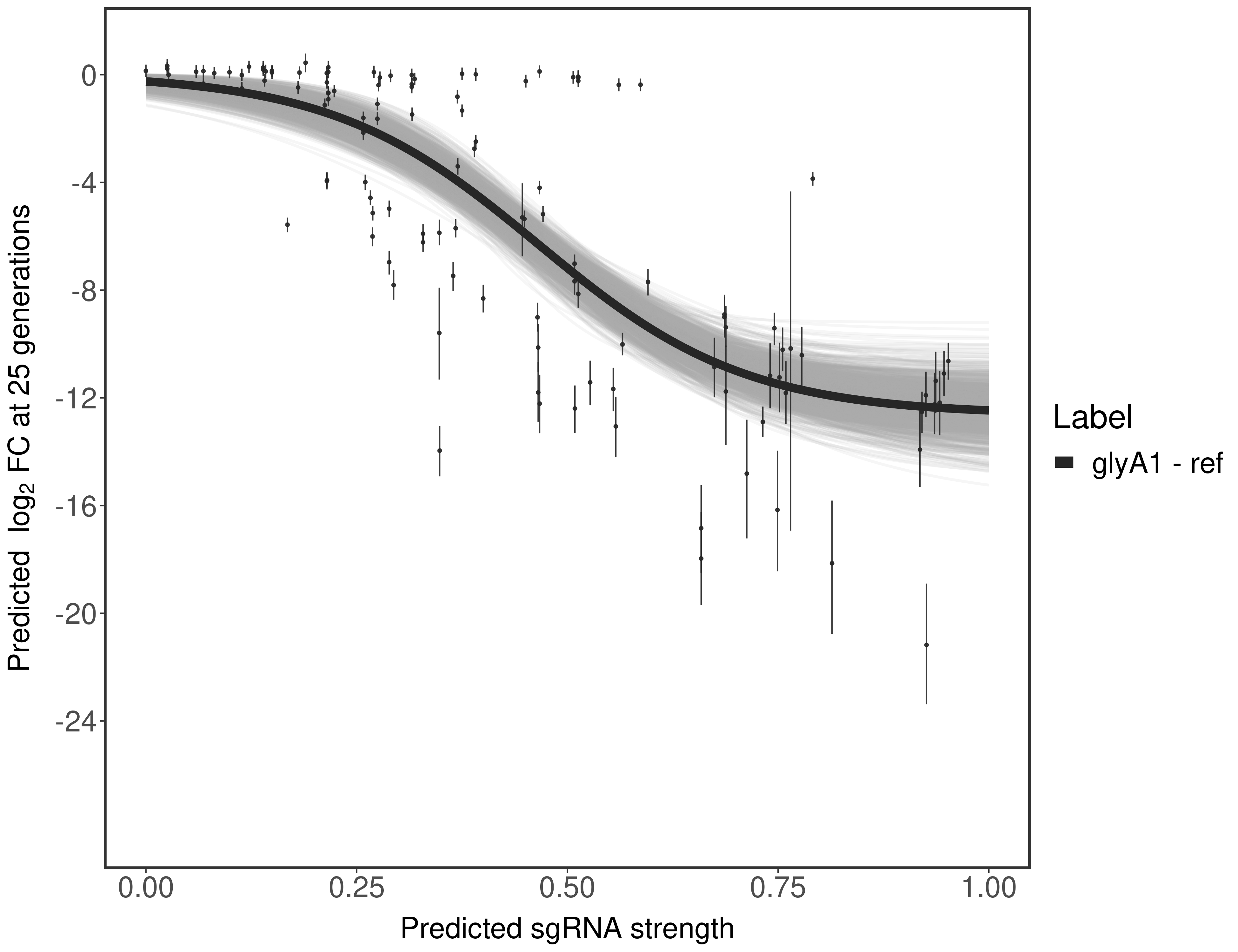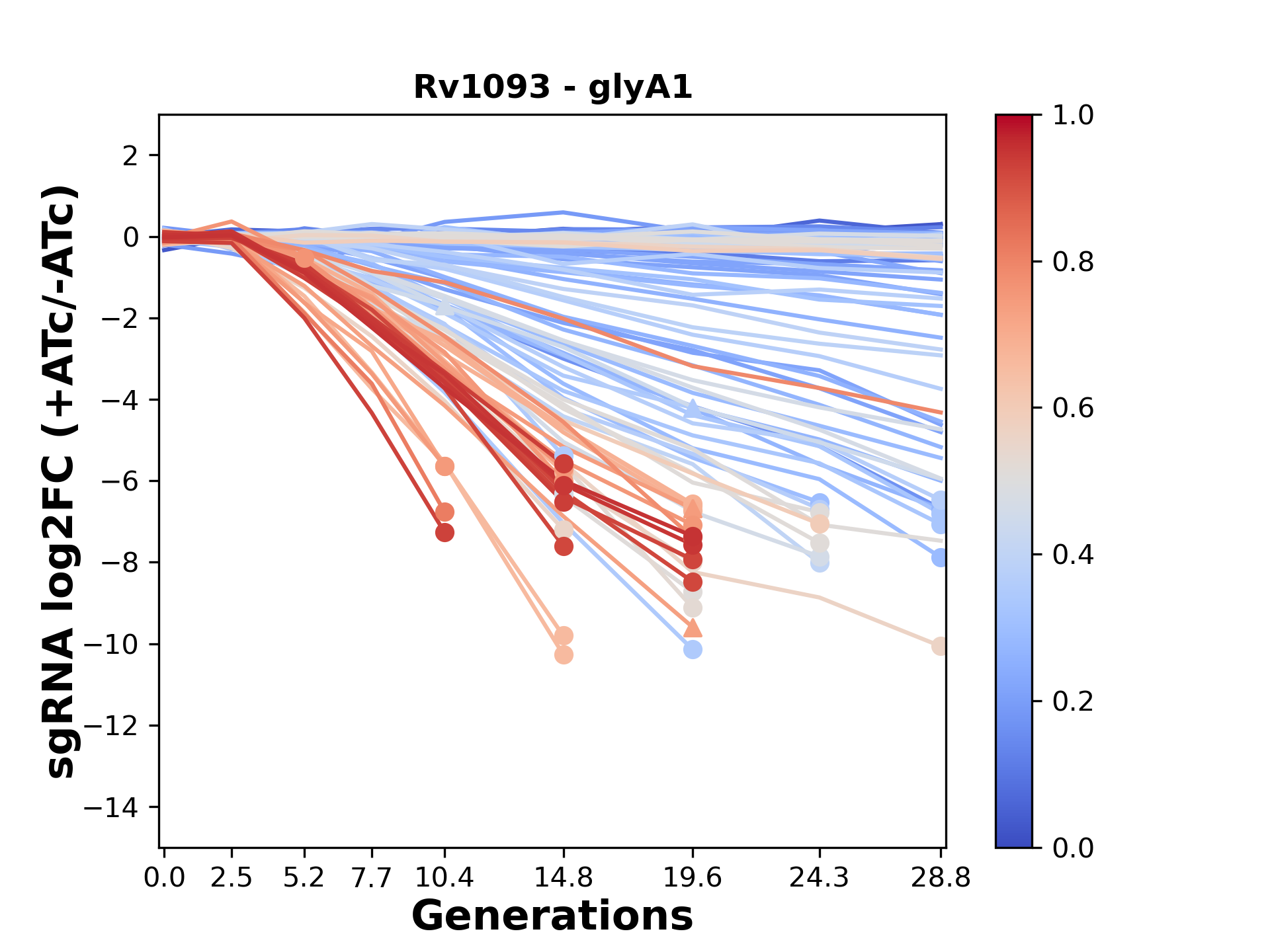 Here, we show sgRNA log2 fold-change values (L2FC) (plus versus minus ATc) over consecutive generations for sgRNAs targeting the gene you selected.