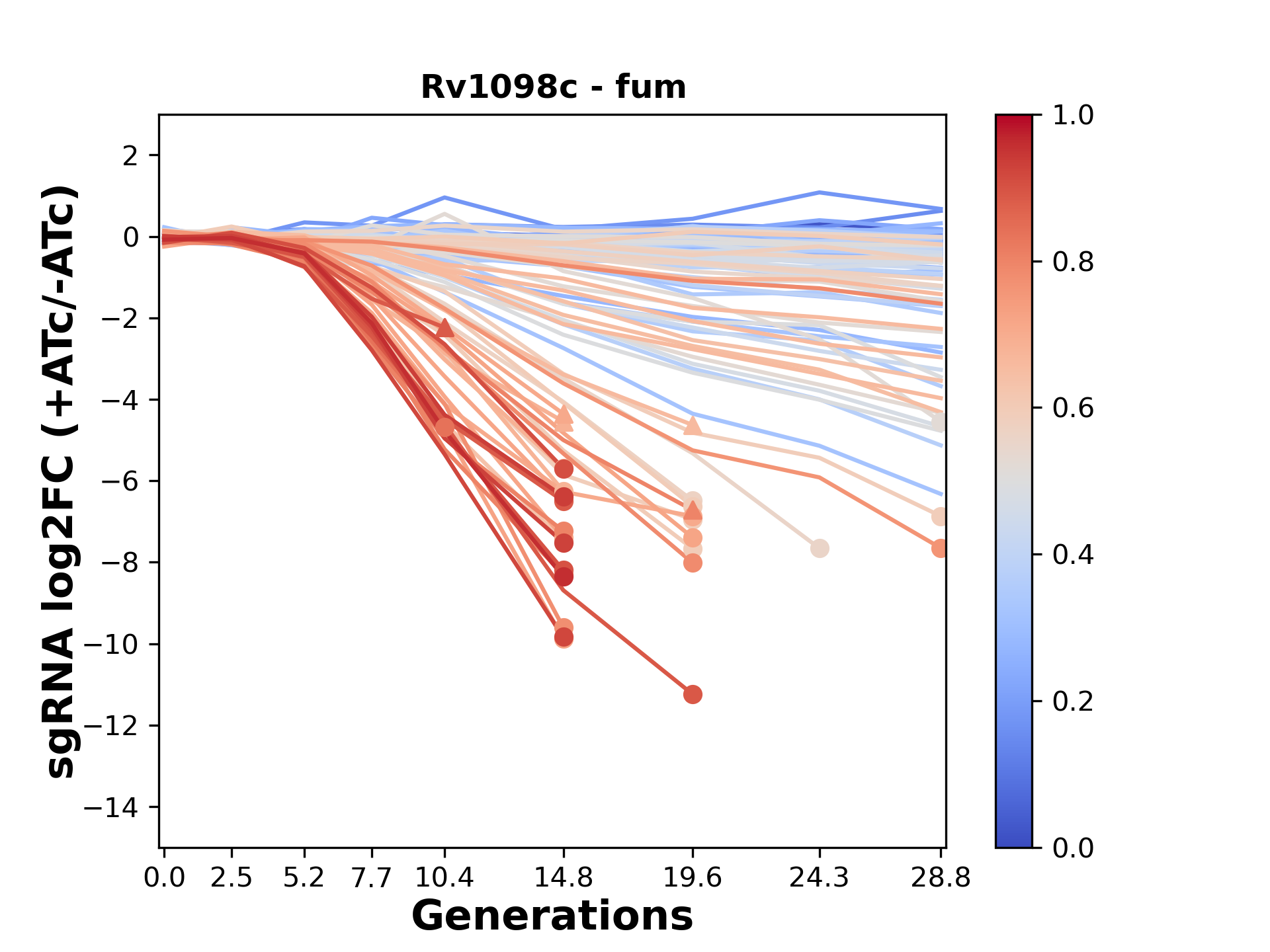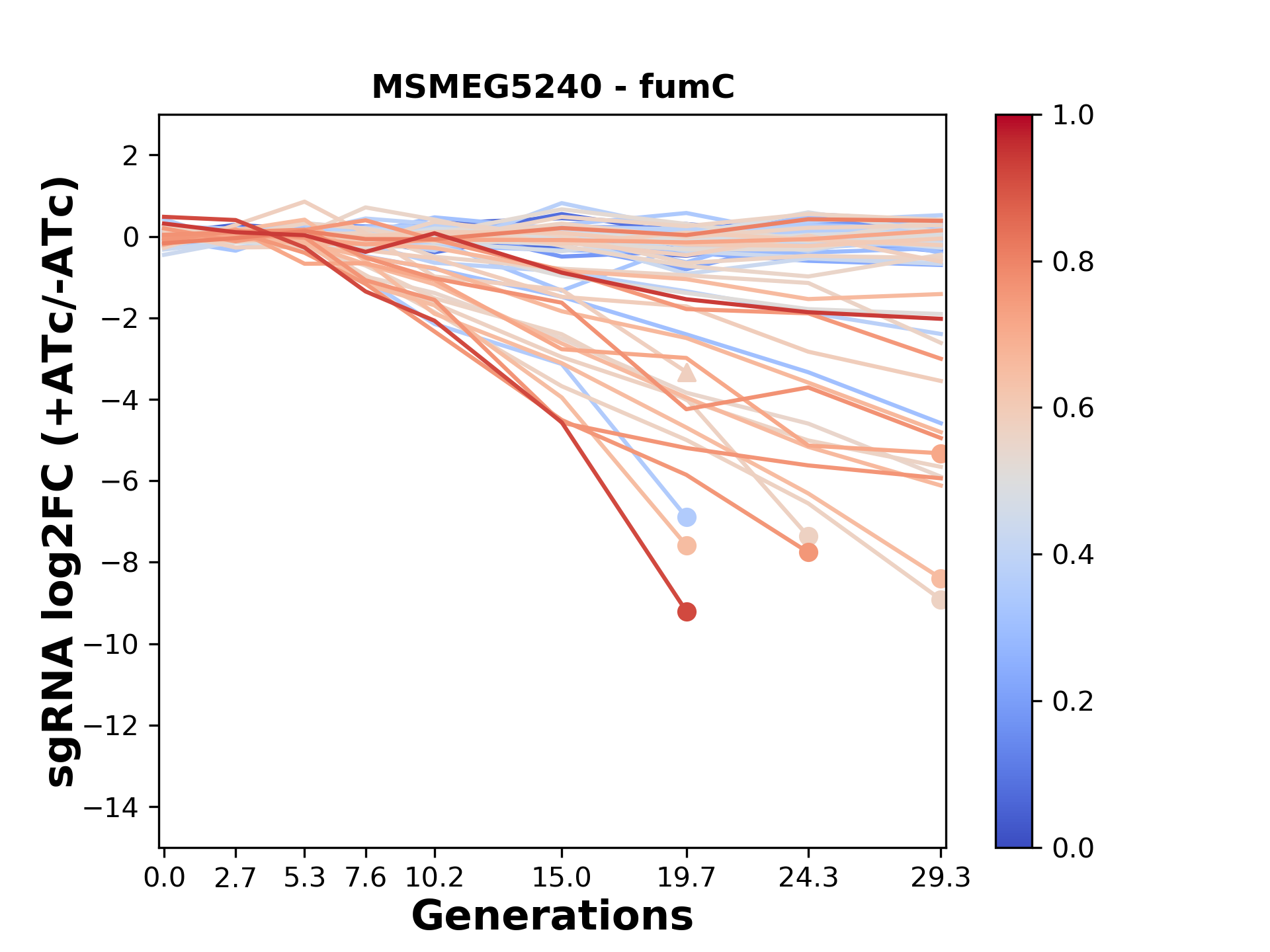 Experiment: We designed an M. tuberculosis CRISPRi library (RLC12) to target all annotated Mtb genes with single guide RNAs (sgRNAs) of varying predicted knockdown efficiencies. In parallel, we constructed a M. smegmatis CRISPRi library (RLC11) to target all annotated Msmeg genes, similar to the Mtb sgRNA library. RLC12 was transformed into M. tuberculosis H37Rv; RLC11 into M. smegmatis mc2-155. We passaged both CRISPRi libraries for nearly 30 generations in the presence or absence of the CRISPRi-inducer anhydrotetracycline (ATc). At the indicated timepoints, genomic DNA was harvested and the representation of individual sgRNAs was counted using Illumina sequencing. Here, we show sgRNA log2 fold-change values (L2FC) (plus versus minus ATc) over consecutive generations for sgRNAs targeting the gene you selected. sgRNAs are color-coded based on their predicted strength from blue (strength=0; weak) to red (strength=1; strong).