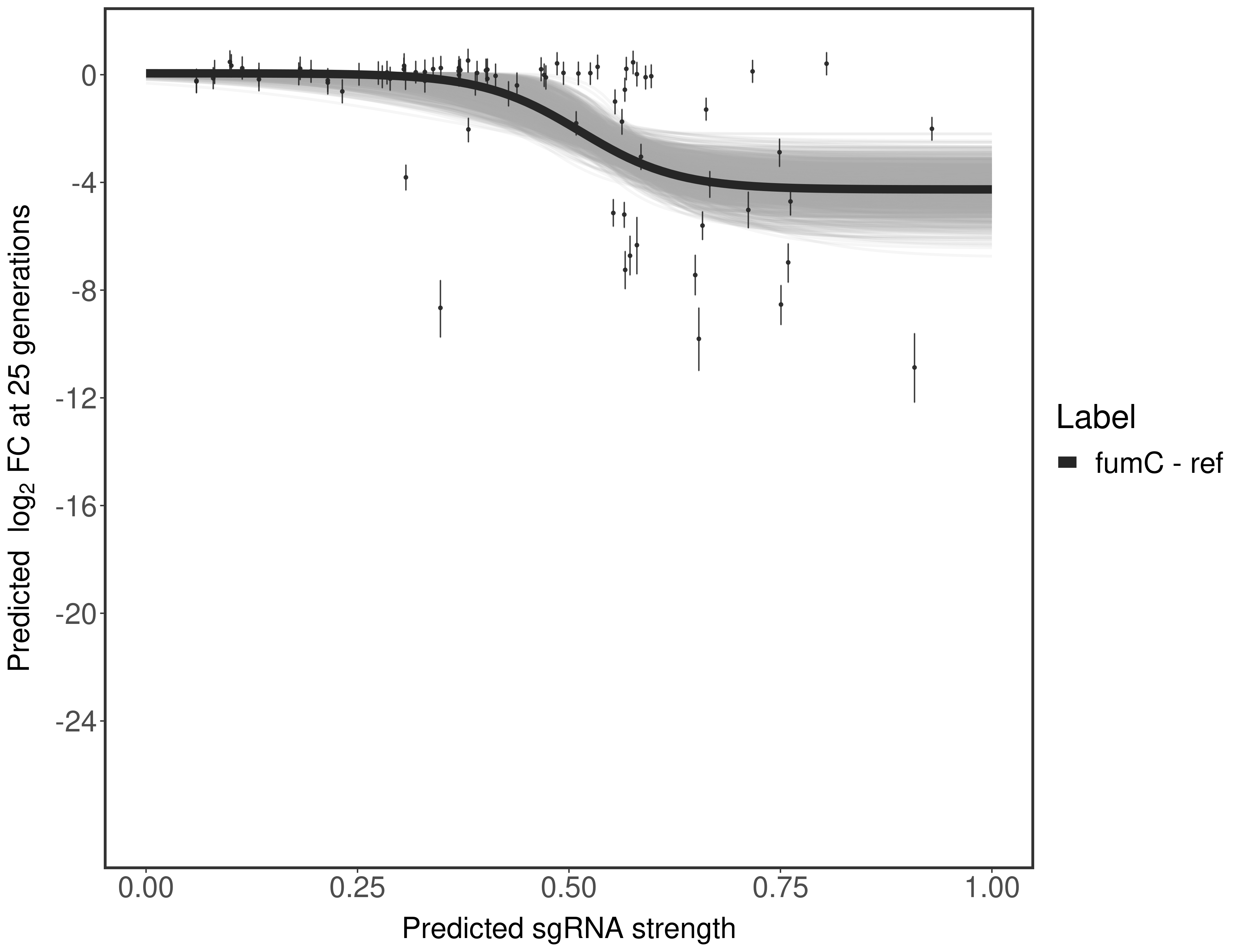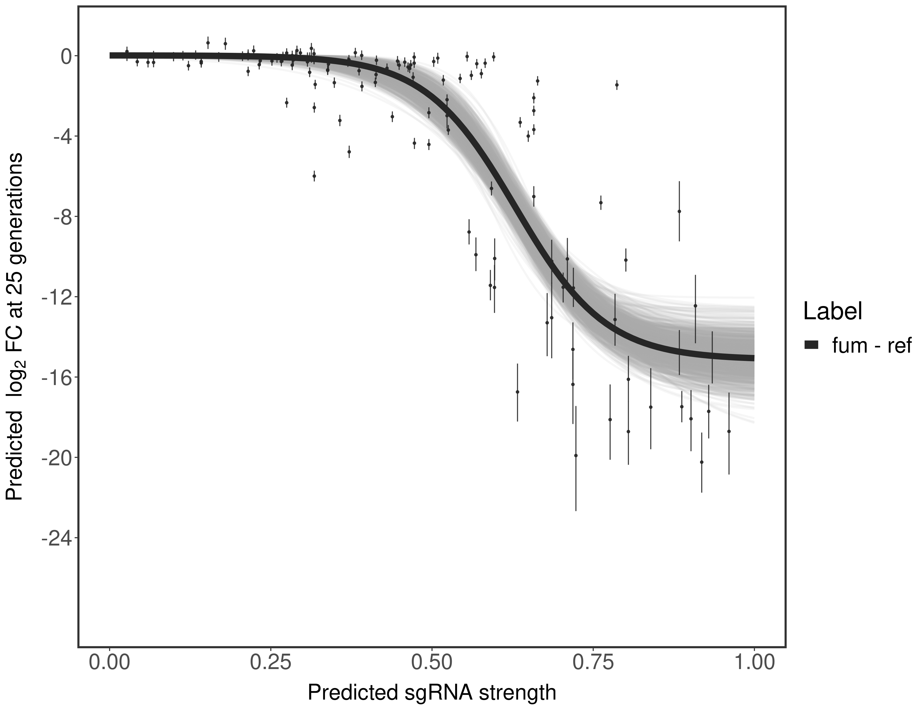In order to quantify gene vulnerability, data were subsequently analyzed with a hierarchical model at the sgRNA level (two-line model) and gene level (Hill curve). The vulnerability quantification is shown below. [More information]