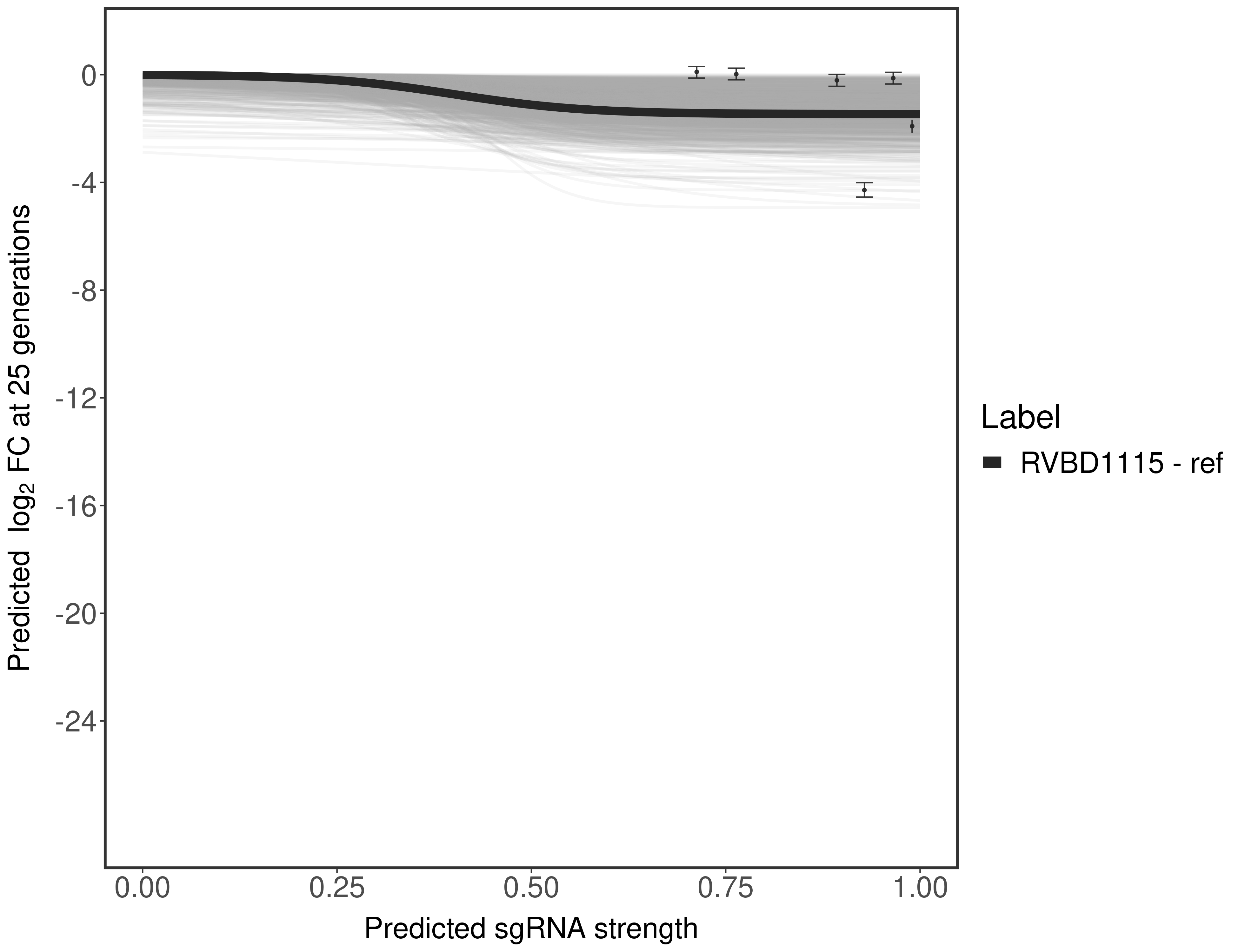 Experiment: We designed an M. tuberculosis CRISPRi library (RLC12) to target all annotated Mtb genes with single guide RNAs (sgRNAs) of varying predicted knockdown efficiencies. In parallel, we constructed a M. smegmatis CRISPRi library (RLC11) to target all annotated Msmeg genes, similar to the Mtb sgRNA library. RLC12 was transformed into M. tuberculosis H37Rv; RLC11 into M. smegmatis mc2-155. We passaged both CRISPRi libraries for nearly 30 generations in the presence or absence of the CRISPRi-inducer anhydrotetracycline (ATc). At the indicated timepoints, genomic DNA was harvested and the representation of individual sgRNAs was counted using Illumina sequencing. Here, we show sgRNA log2 fold-change values (L2FC) (plus versus minus ATc) over consecutive generations for sgRNAs targeting the gene you selected. sgRNAs are color-coded based on their predicted strength from blue (strength=0; weak) to red (strength=1; strong).