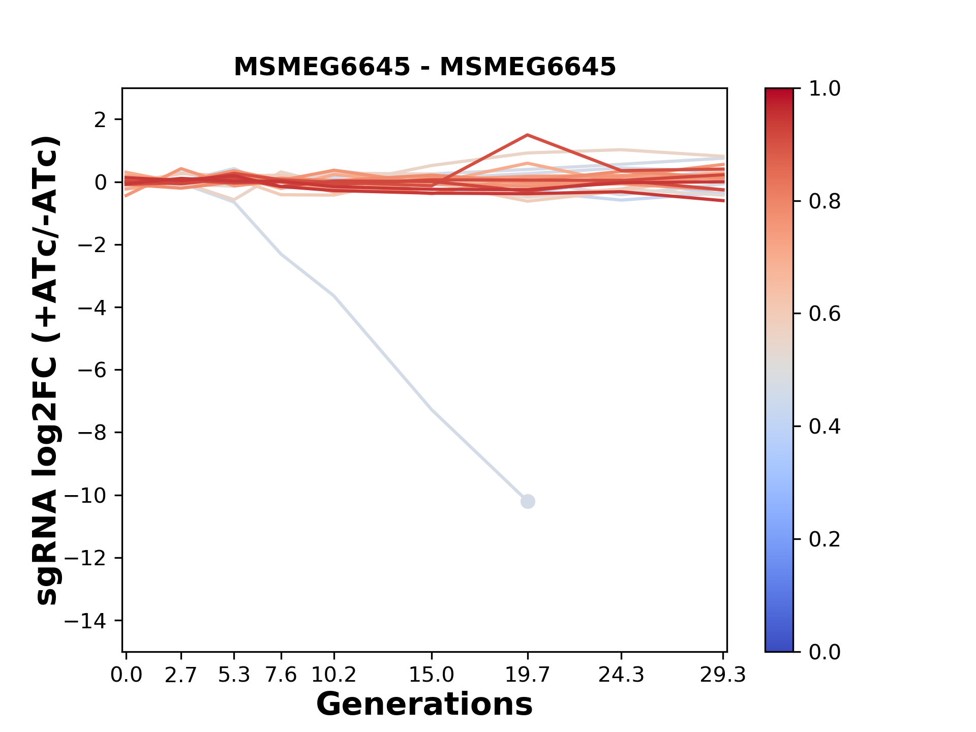 Experiment: We designed an M. tuberculosis CRISPRi library (RLC12) to target all annotated Mtb genes with single guide RNAs (sgRNAs) of varying predicted knockdown efficiencies. In parallel, we constructed a M. smegmatis CRISPRi library (RLC11) to target all annotated Msmeg genes, similar to the Mtb sgRNA library. RLC12 was transformed into M. tuberculosis H37Rv; RLC11 into M. smegmatis mc2-155. We passaged both CRISPRi libraries for nearly 30 generations in the presence or absence of the CRISPRi-inducer anhydrotetracycline (ATc). At the indicated timepoints, genomic DNA was harvested and the representation of individual sgRNAs was counted using Illumina sequencing. Here, we show sgRNA log2 fold-change values (L2FC) (plus versus minus ATc) over consecutive generations for sgRNAs targeting the gene you selected. sgRNAs are color-coded based on their predicted strength from blue (strength=0; weak) to red (strength=1; strong).