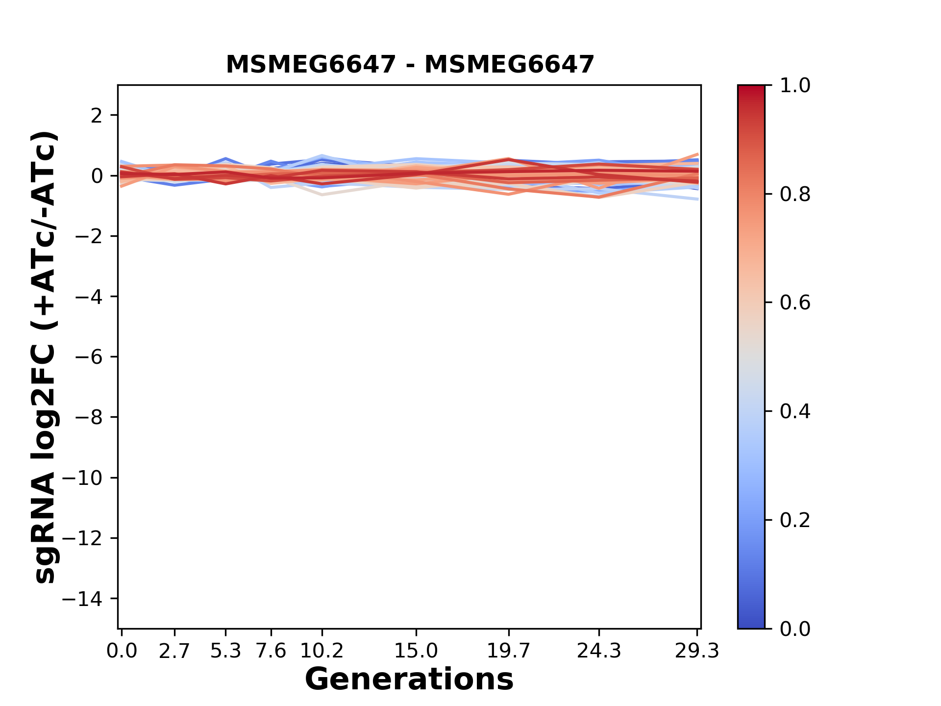 Here, we show sgRNA log2 fold-change values (L2FC) (plus versus minus ATc) over consecutive generations for sgRNAs targeting the gene you selected.