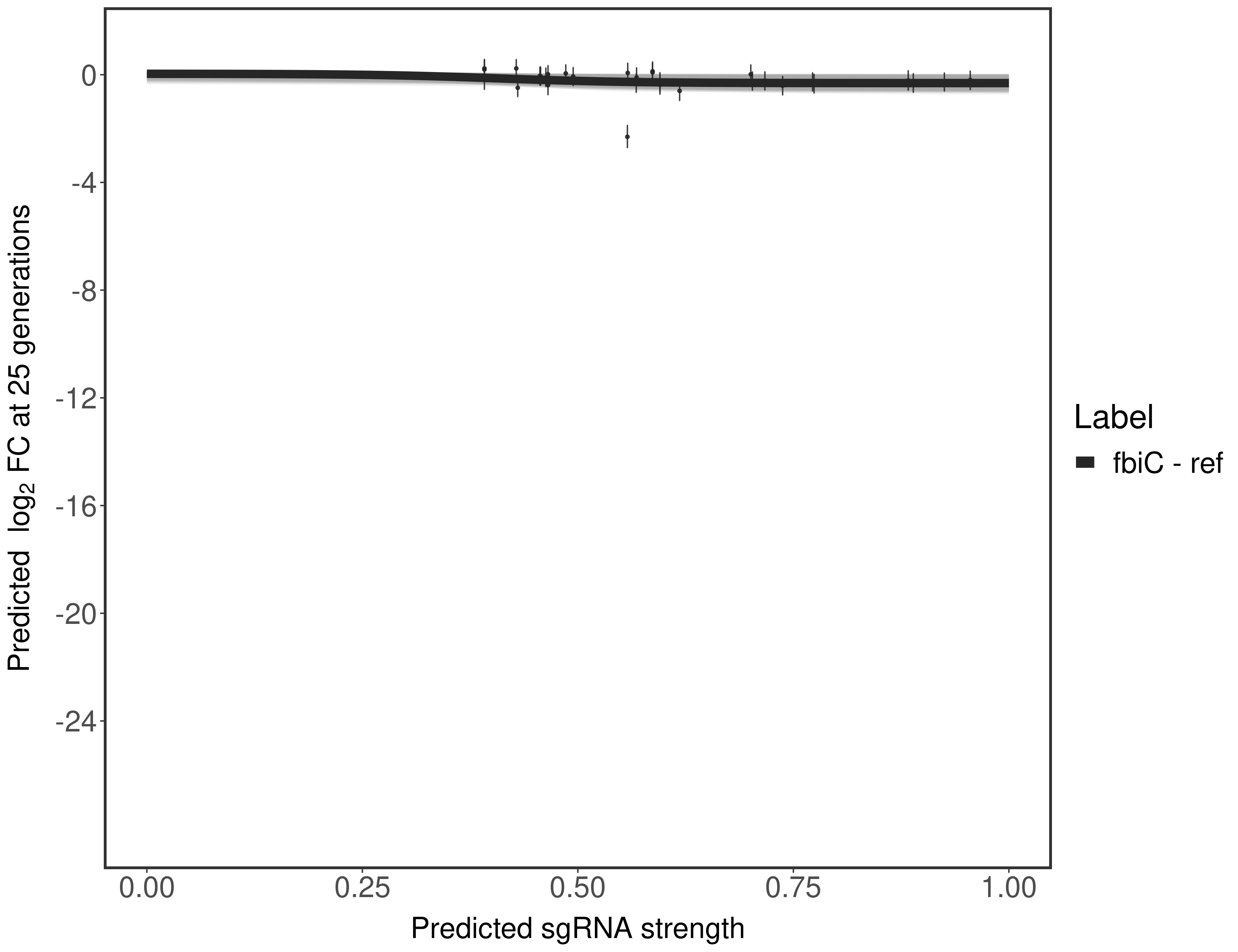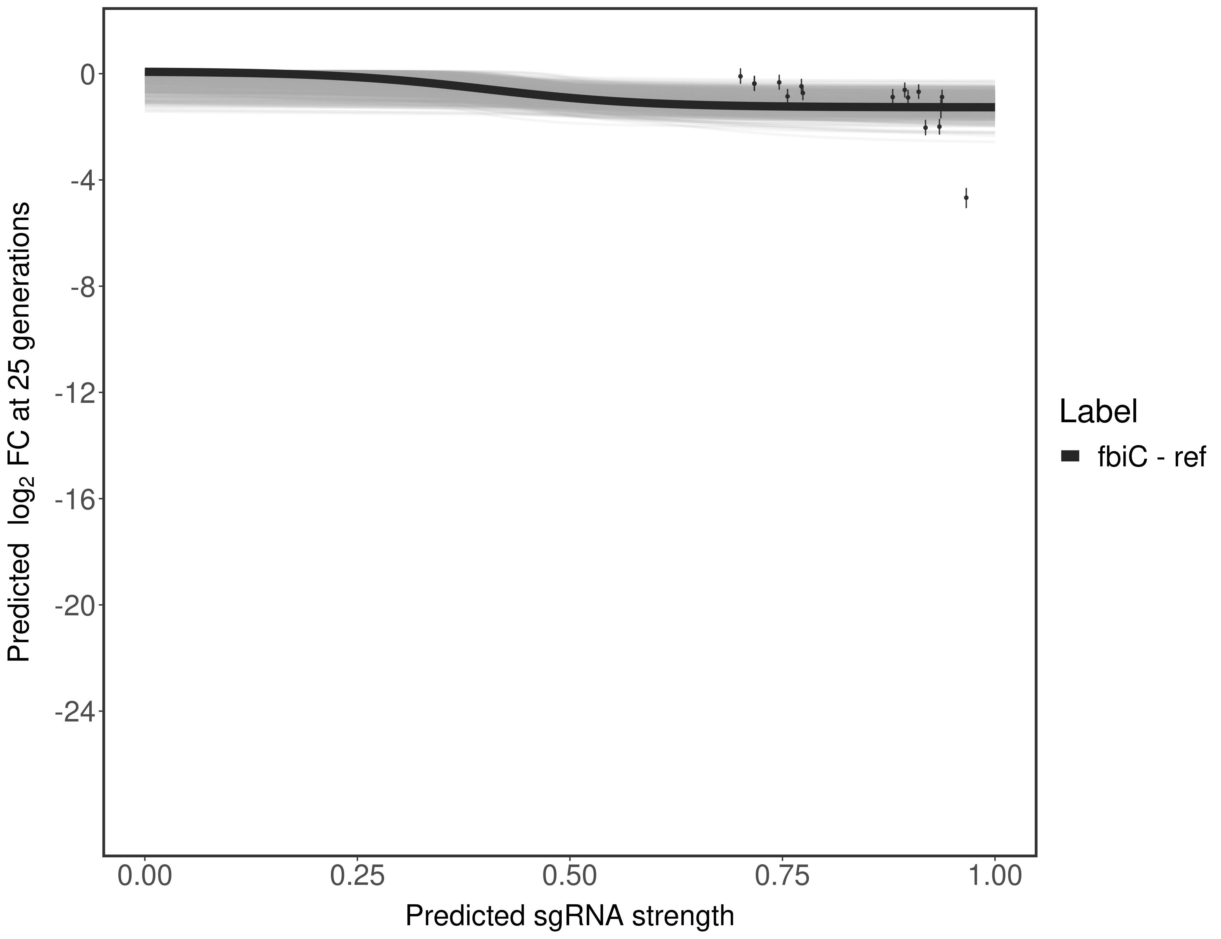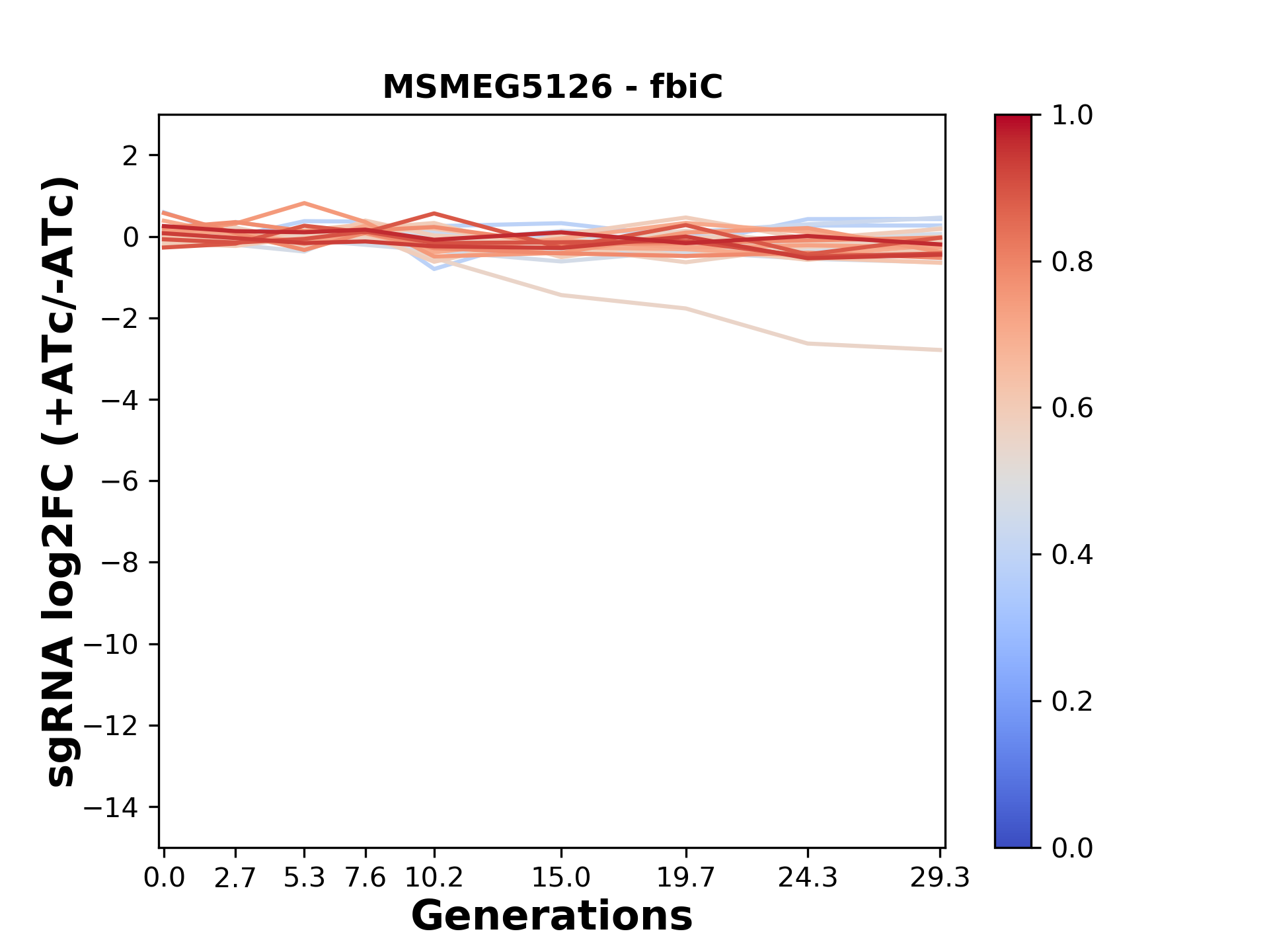 Here, we show sgRNA log2 fold-change values (L2FC) (plus versus minus ATc) over consecutive generations for sgRNAs targeting the gene you selected.