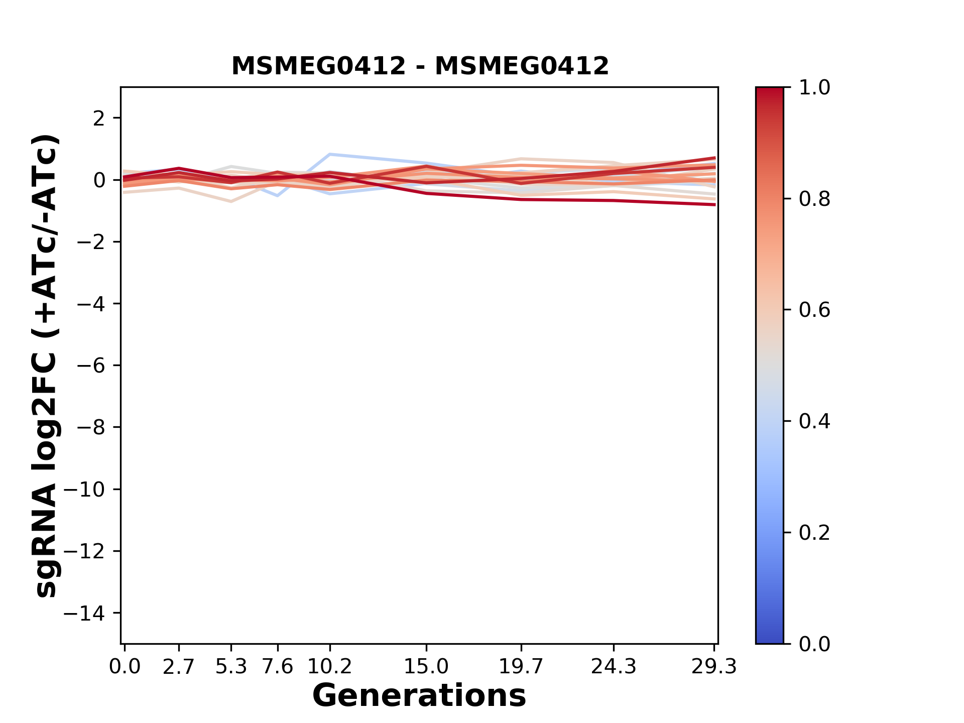 Here, we show sgRNA log2 fold-change values (L2FC) (plus versus minus ATc) over consecutive generations for sgRNAs targeting the gene you selected.