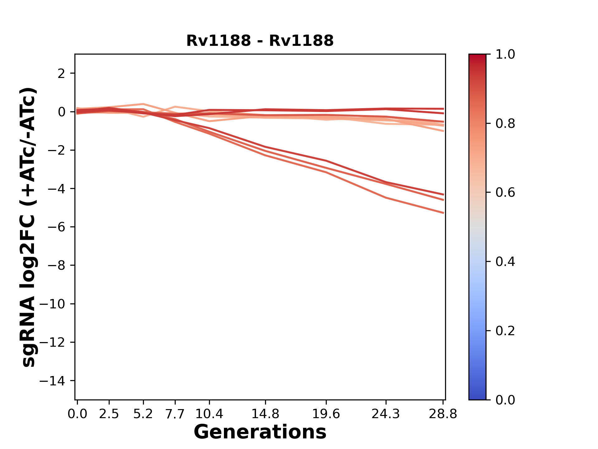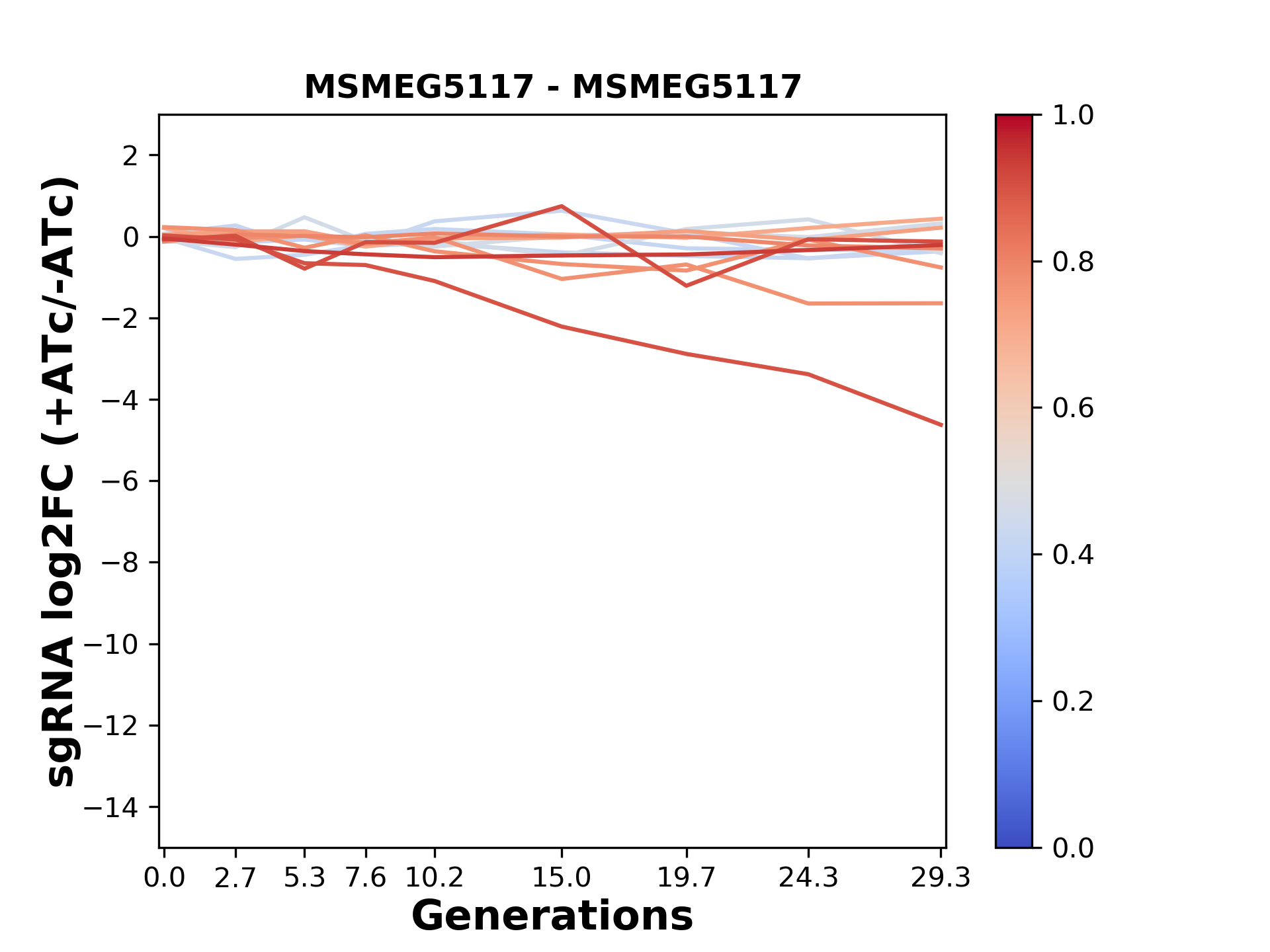 Experiment: We designed an M. tuberculosis CRISPRi library (RLC12) to target all annotated Mtb genes with single guide RNAs (sgRNAs) of varying predicted knockdown efficiencies. In parallel, we constructed a M. smegmatis CRISPRi library (RLC11) to target all annotated Msmeg genes, similar to the Mtb sgRNA library. RLC12 was transformed into M. tuberculosis H37Rv; RLC11 into M. smegmatis mc2-155. We passaged both CRISPRi libraries for nearly 30 generations in the presence or absence of the CRISPRi-inducer anhydrotetracycline (ATc). At the indicated timepoints, genomic DNA was harvested and the representation of individual sgRNAs was counted using Illumina sequencing. Here, we show sgRNA log2 fold-change values (L2FC) (plus versus minus ATc) over consecutive generations for sgRNAs targeting the gene you selected. sgRNAs are color-coded based on their predicted strength from blue (strength=0; weak) to red (strength=1; strong).