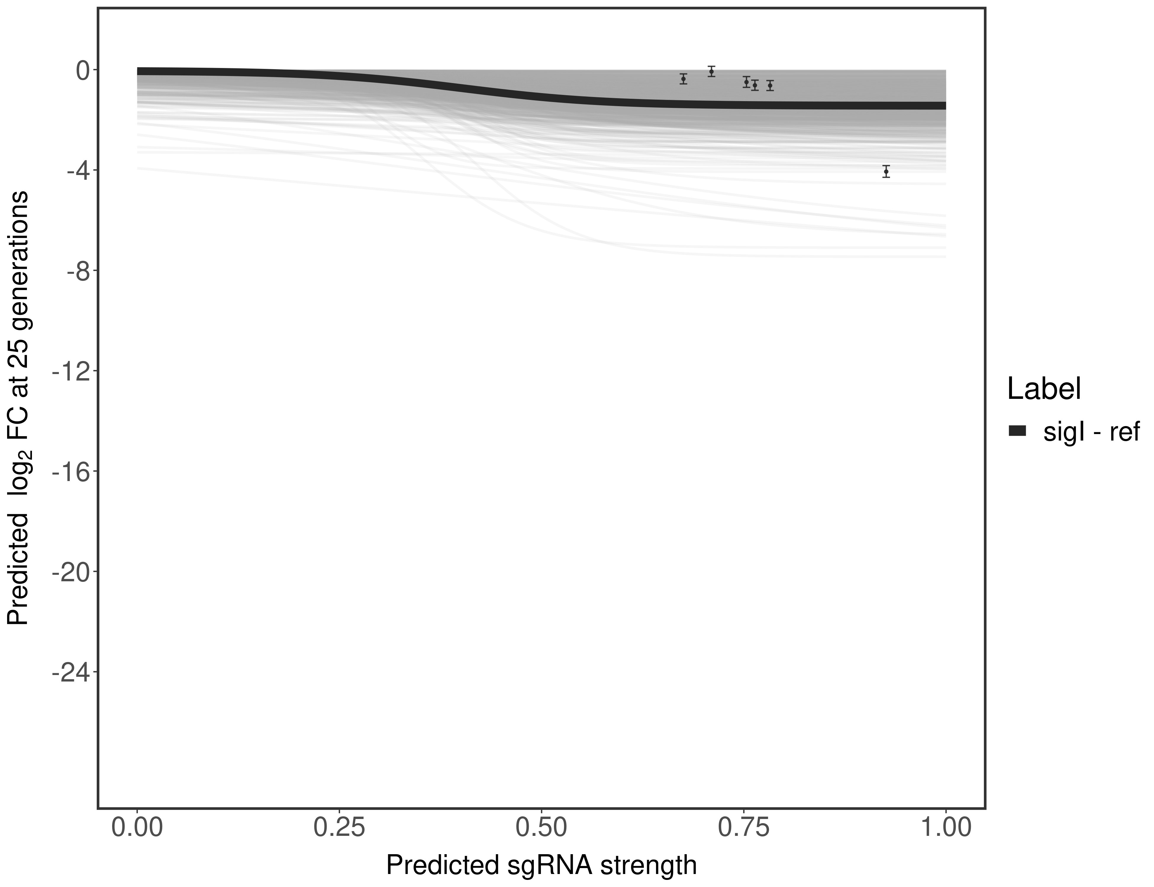 Here, we show sgRNA log2 fold-change values (L2FC) (plus versus minus ATc) over consecutive generations for sgRNAs targeting the gene you selected.