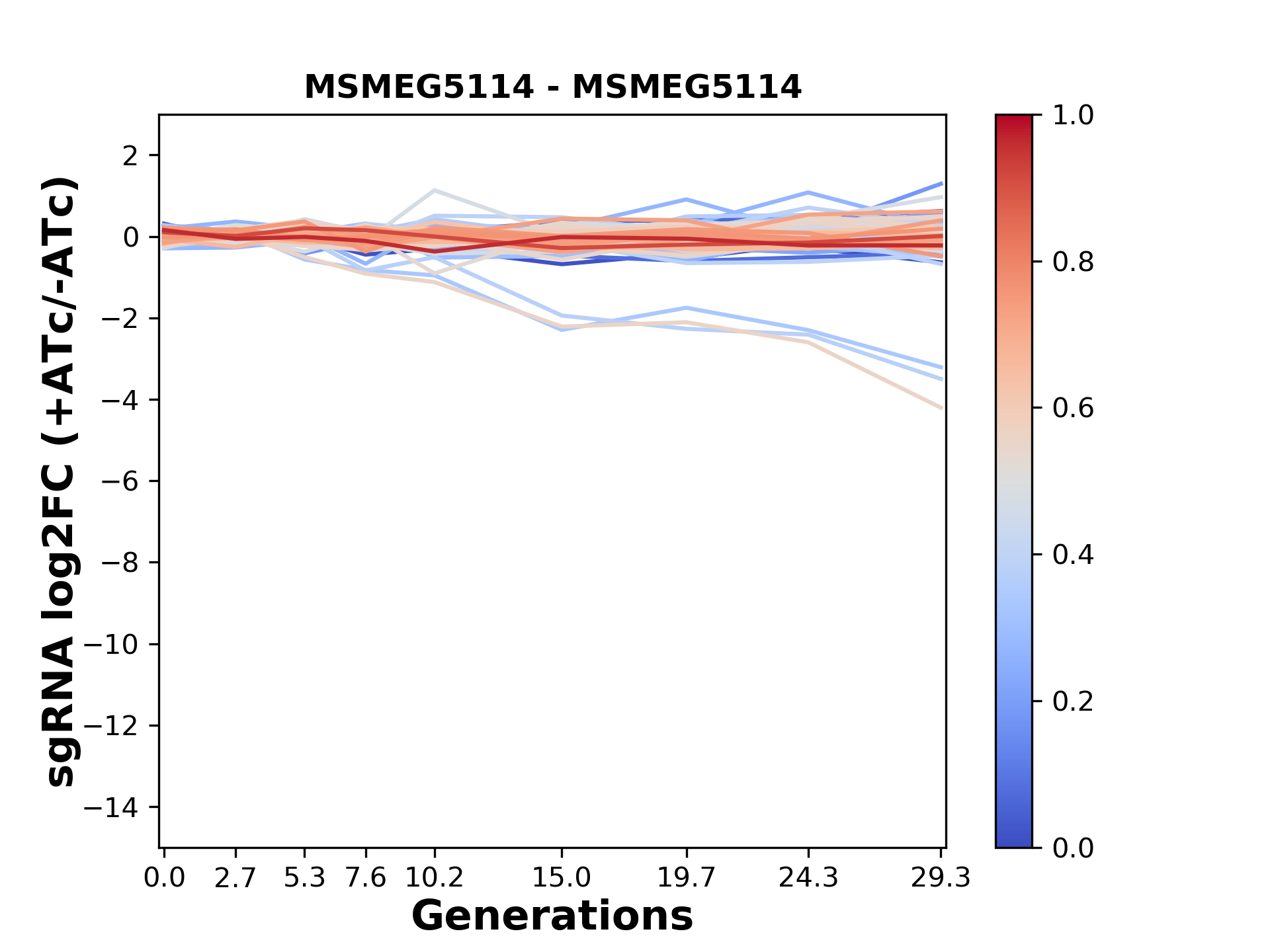 Here, we show sgRNA log2 fold-change values (L2FC) (plus versus minus ATc) over consecutive generations for sgRNAs targeting the gene you selected.