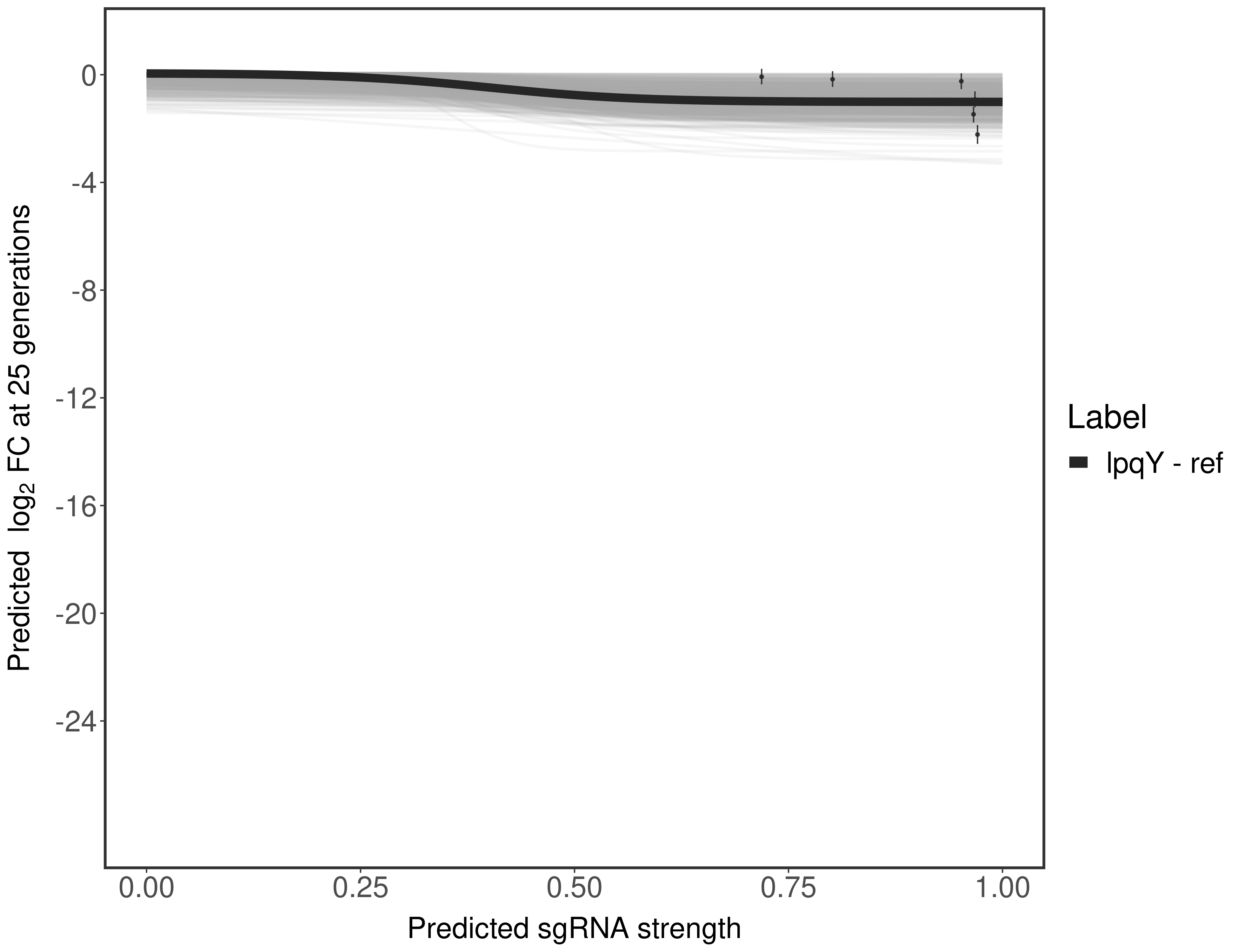 Experiment: We designed an M. tuberculosis CRISPRi library (RLC12) to target all annotated Mtb genes with single guide RNAs (sgRNAs) of varying predicted knockdown efficiencies. In parallel, we constructed a M. smegmatis CRISPRi library (RLC11) to target all annotated Msmeg genes, similar to the Mtb sgRNA library. RLC12 was transformed into M. tuberculosis H37Rv; RLC11 into M. smegmatis mc2-155. We passaged both CRISPRi libraries for nearly 30 generations in the presence or absence of the CRISPRi-inducer anhydrotetracycline (ATc). At the indicated timepoints, genomic DNA was harvested and the representation of individual sgRNAs was counted using Illumina sequencing. Here, we show sgRNA log2 fold-change values (L2FC) (plus versus minus ATc) over consecutive generations for sgRNAs targeting the gene you selected. sgRNAs are color-coded based on their predicted strength from blue (strength=0; weak) to red (strength=1; strong).