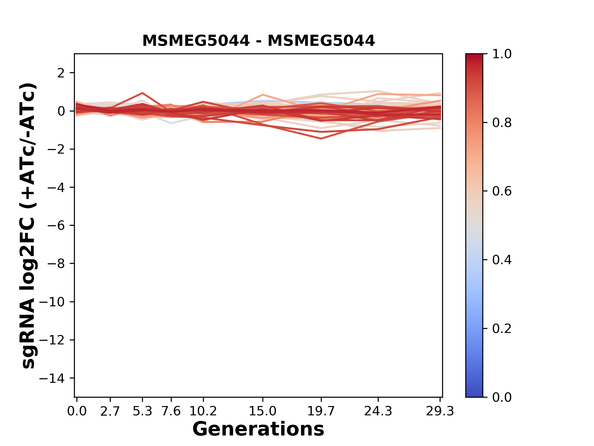 Here, we show sgRNA log2 fold-change values (L2FC) (plus versus minus ATc) over consecutive generations for sgRNAs targeting the gene you selected.