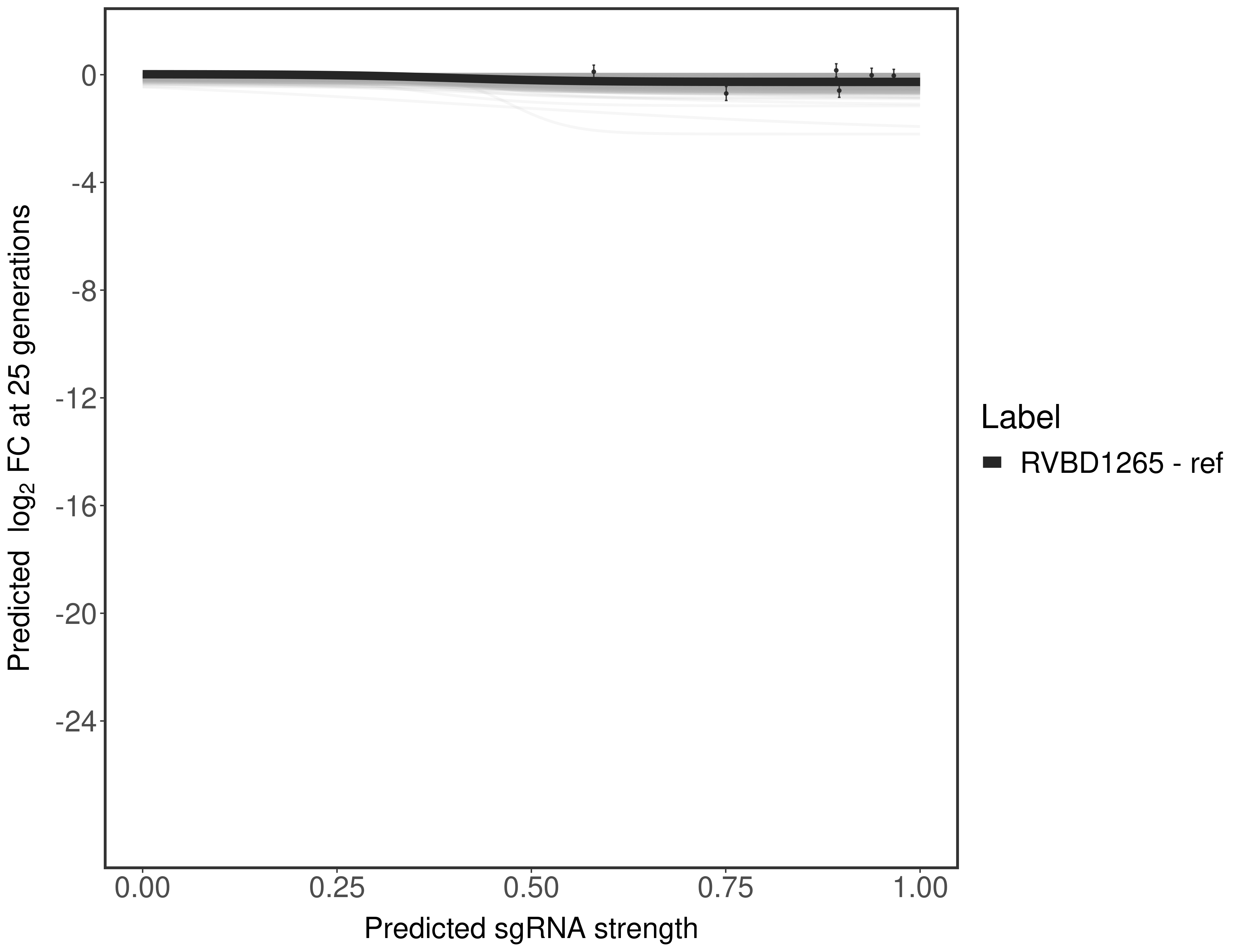 Experiment: We designed an M. tuberculosis CRISPRi library (RLC12) to target all annotated Mtb genes with single guide RNAs (sgRNAs) of varying predicted knockdown efficiencies. In parallel, we constructed a M. smegmatis CRISPRi library (RLC11) to target all annotated Msmeg genes, similar to the Mtb sgRNA library. RLC12 was transformed into M. tuberculosis H37Rv; RLC11 into M. smegmatis mc2-155. We passaged both CRISPRi libraries for nearly 30 generations in the presence or absence of the CRISPRi-inducer anhydrotetracycline (ATc). At the indicated timepoints, genomic DNA was harvested and the representation of individual sgRNAs was counted using Illumina sequencing. Here, we show sgRNA log2 fold-change values (L2FC) (plus versus minus ATc) over consecutive generations for sgRNAs targeting the gene you selected. sgRNAs are color-coded based on their predicted strength from blue (strength=0; weak) to red (strength=1; strong).