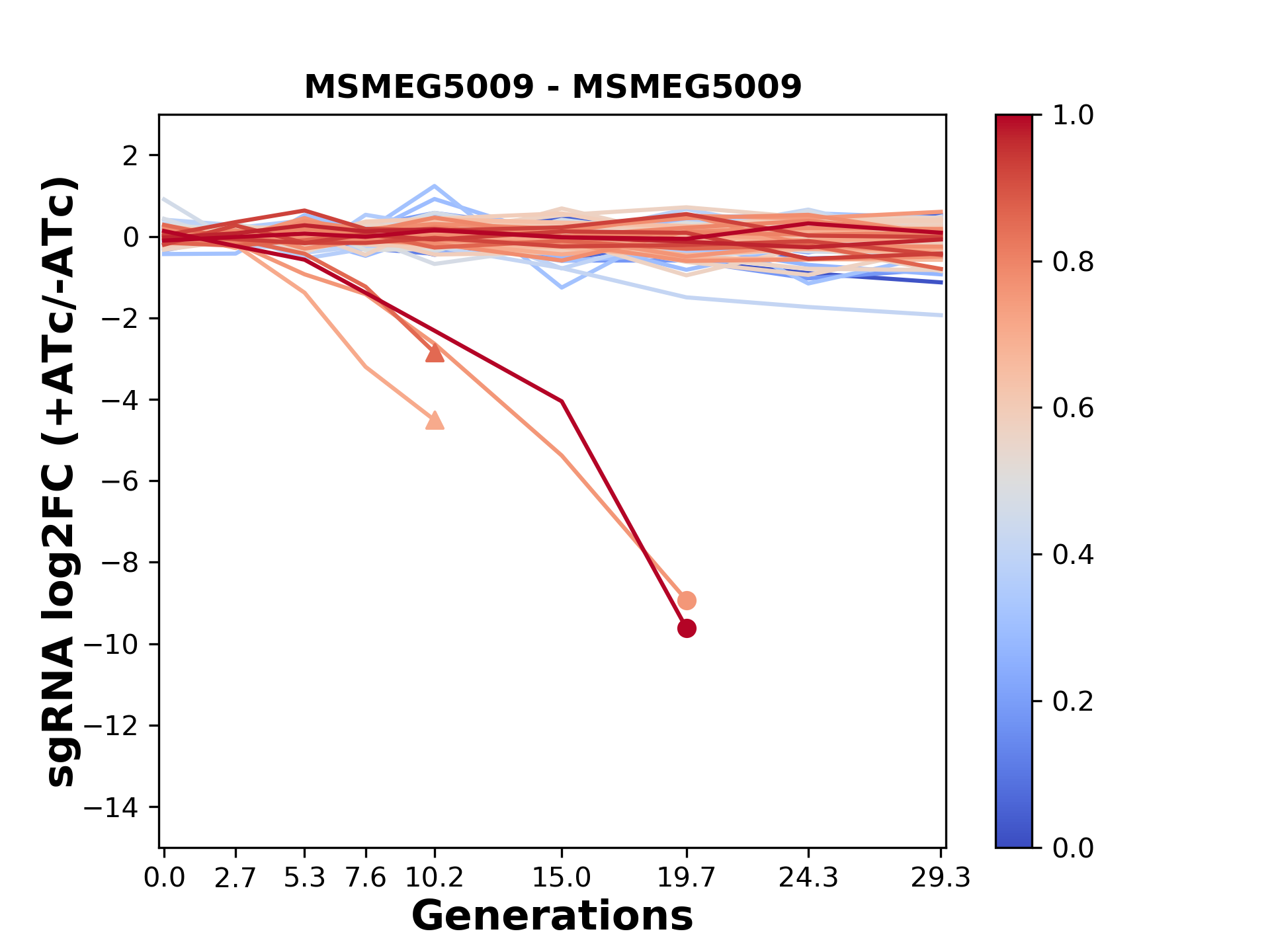 Here, we show sgRNA log2 fold-change values (L2FC) (plus versus minus ATc) over consecutive generations for sgRNAs targeting the gene you selected.