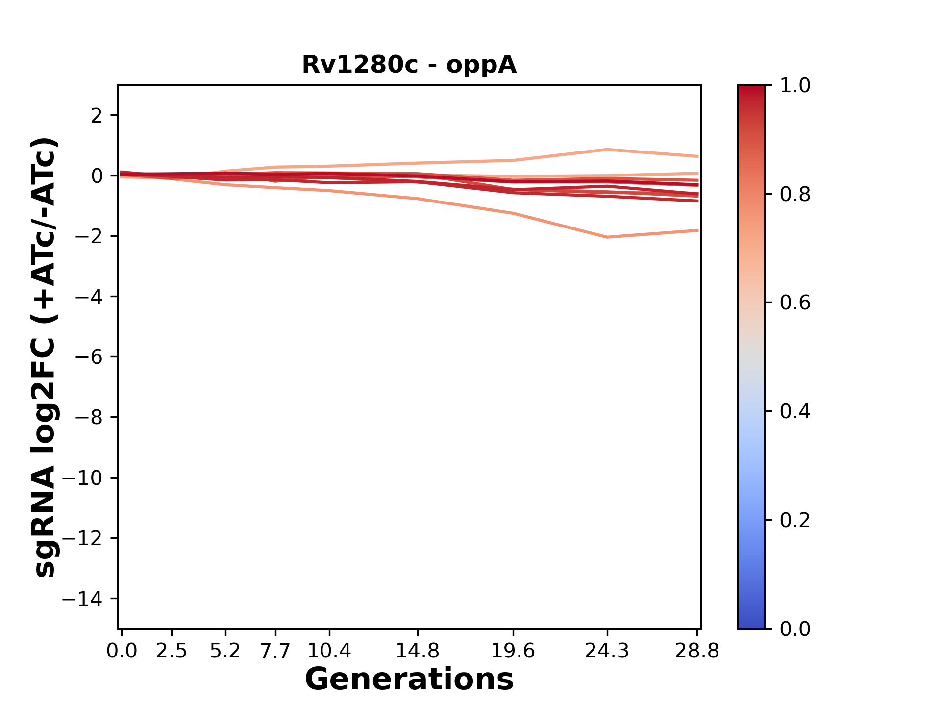Here, we show sgRNA log2 fold-change values (L2FC) (plus versus minus ATc) over consecutive generations for sgRNAs targeting the gene you selected.