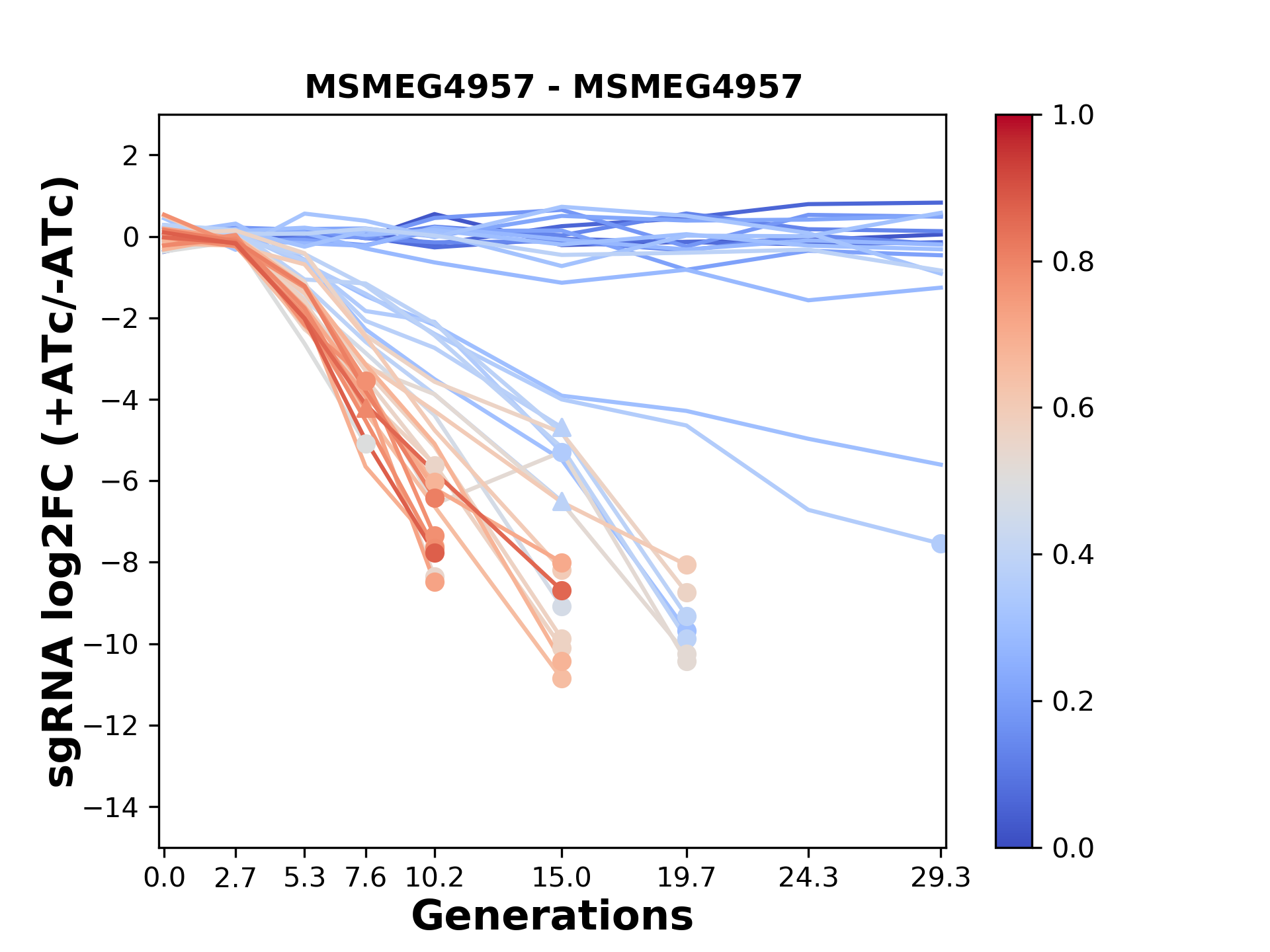 Here, we show sgRNA log2 fold-change values (L2FC) (plus versus minus ATc) over consecutive generations for sgRNAs targeting the gene you selected.