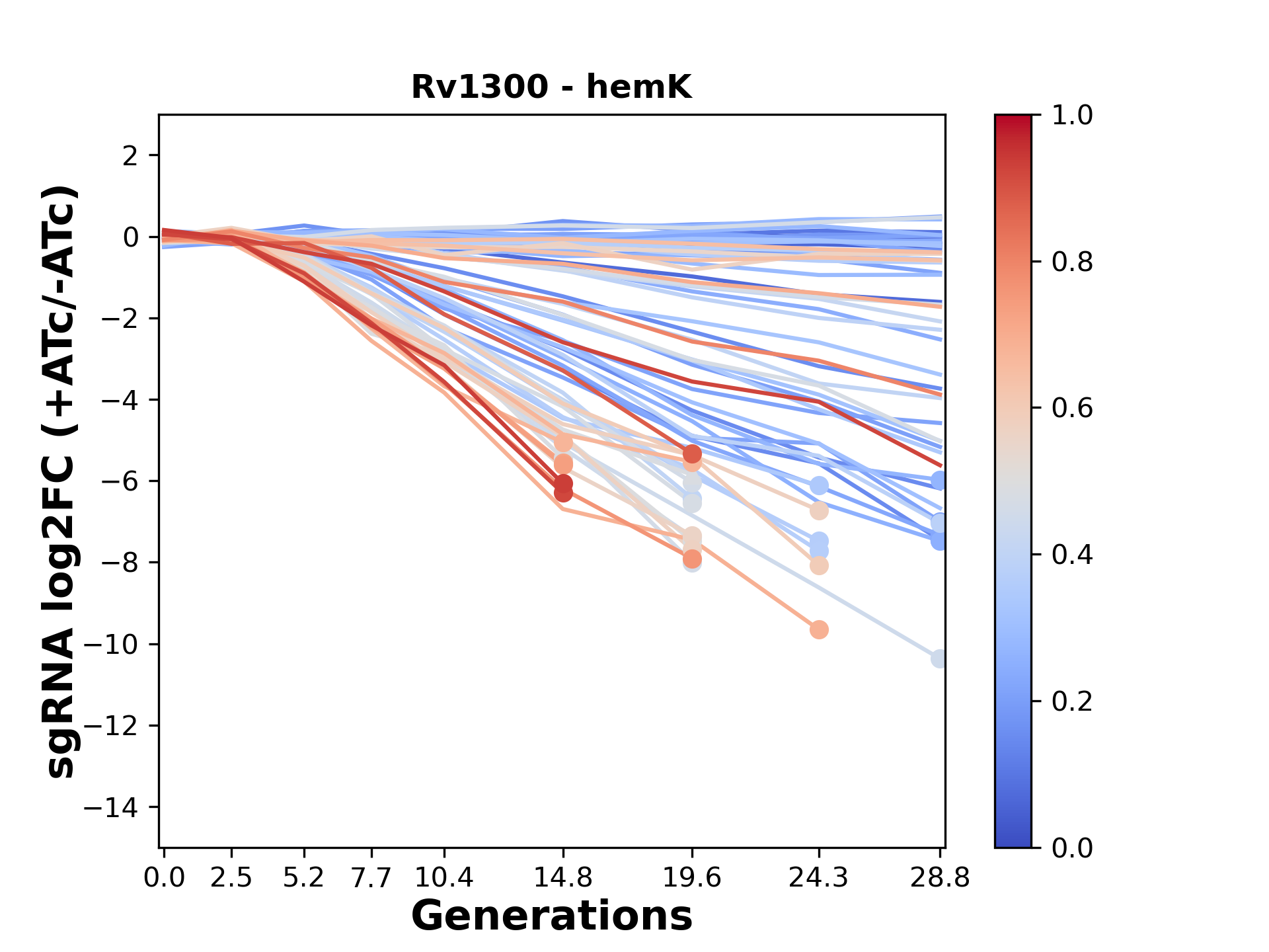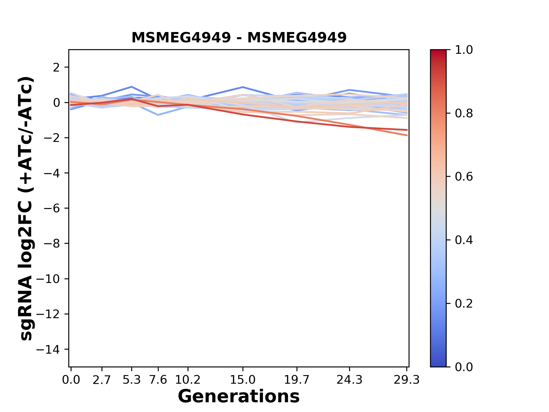 Here, we show sgRNA log2 fold-change values (L2FC) (plus versus minus ATc) over consecutive generations for sgRNAs targeting the gene you selected.