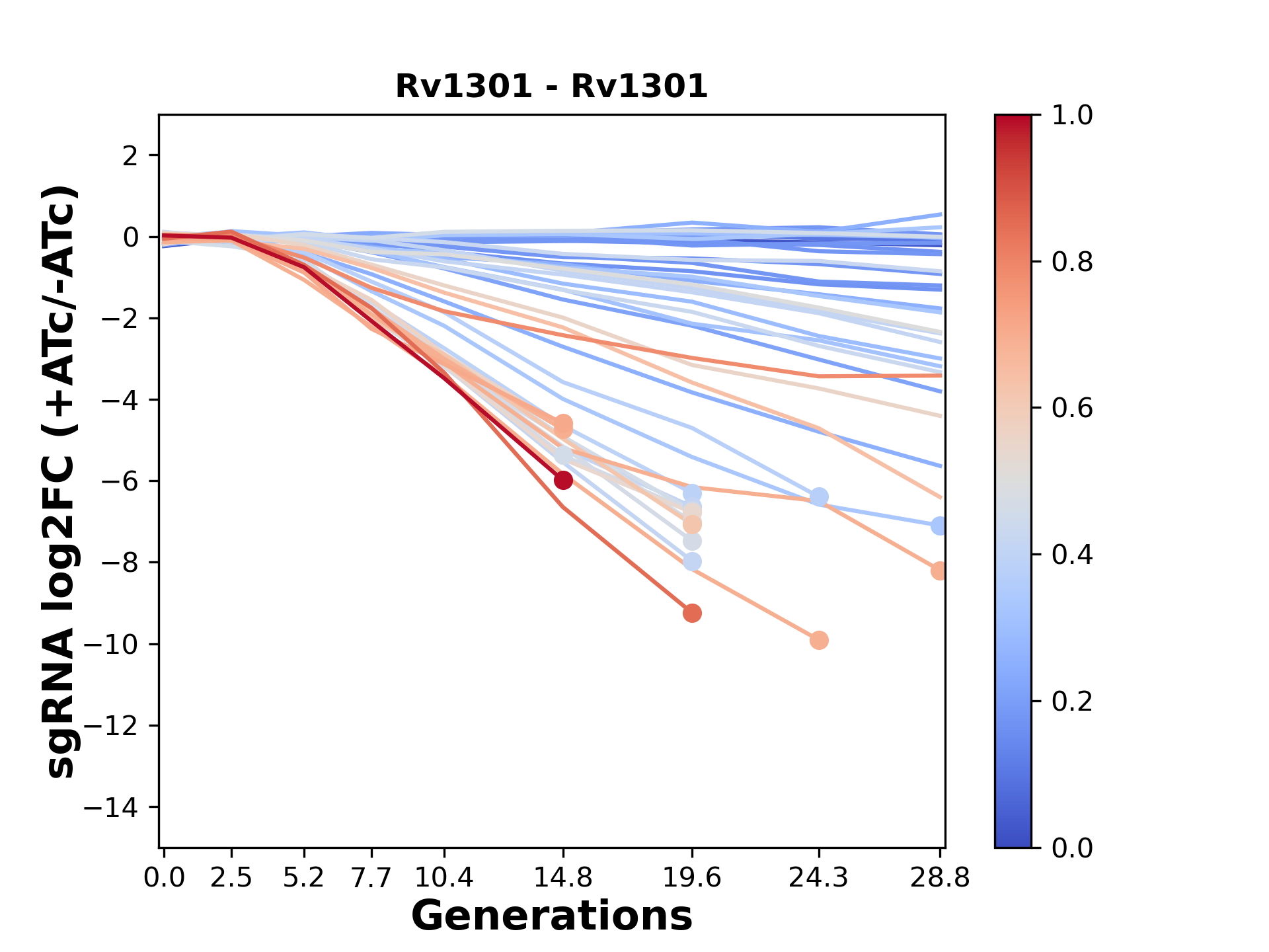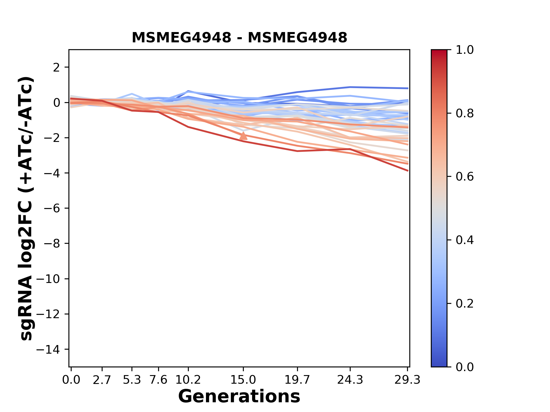 Here, we show sgRNA log2 fold-change values (L2FC) (plus versus minus ATc) over consecutive generations for sgRNAs targeting the gene you selected.