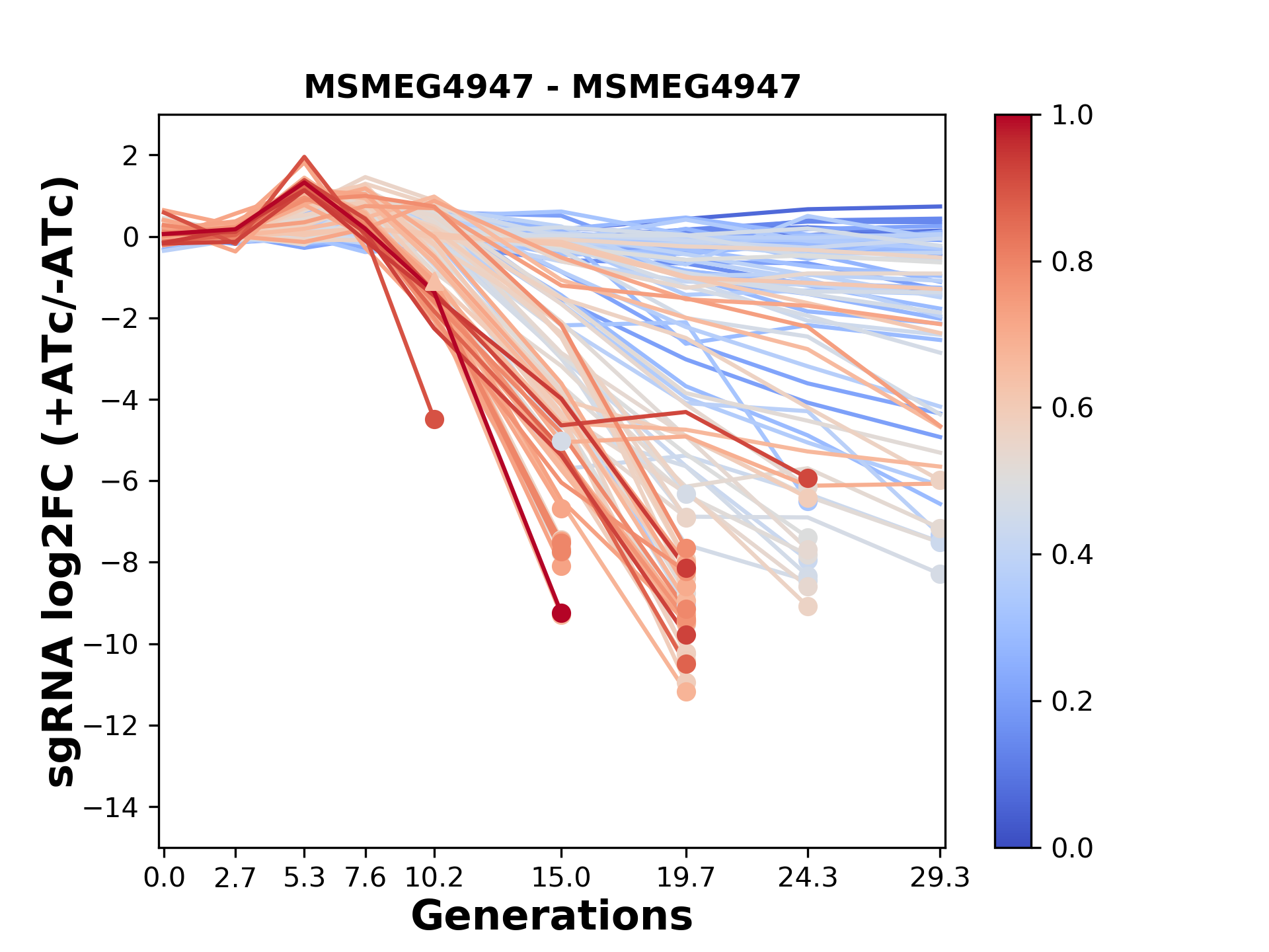 Here, we show sgRNA log2 fold-change values (L2FC) (plus versus minus ATc) over consecutive generations for sgRNAs targeting the gene you selected.