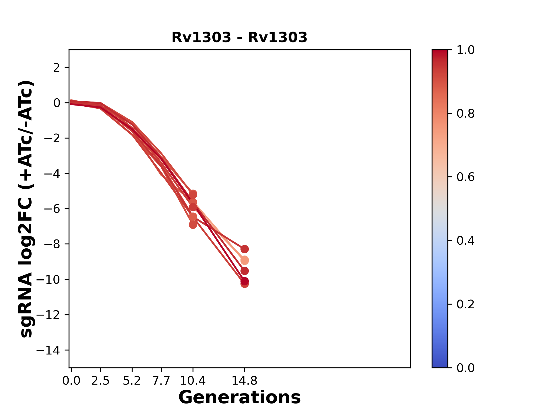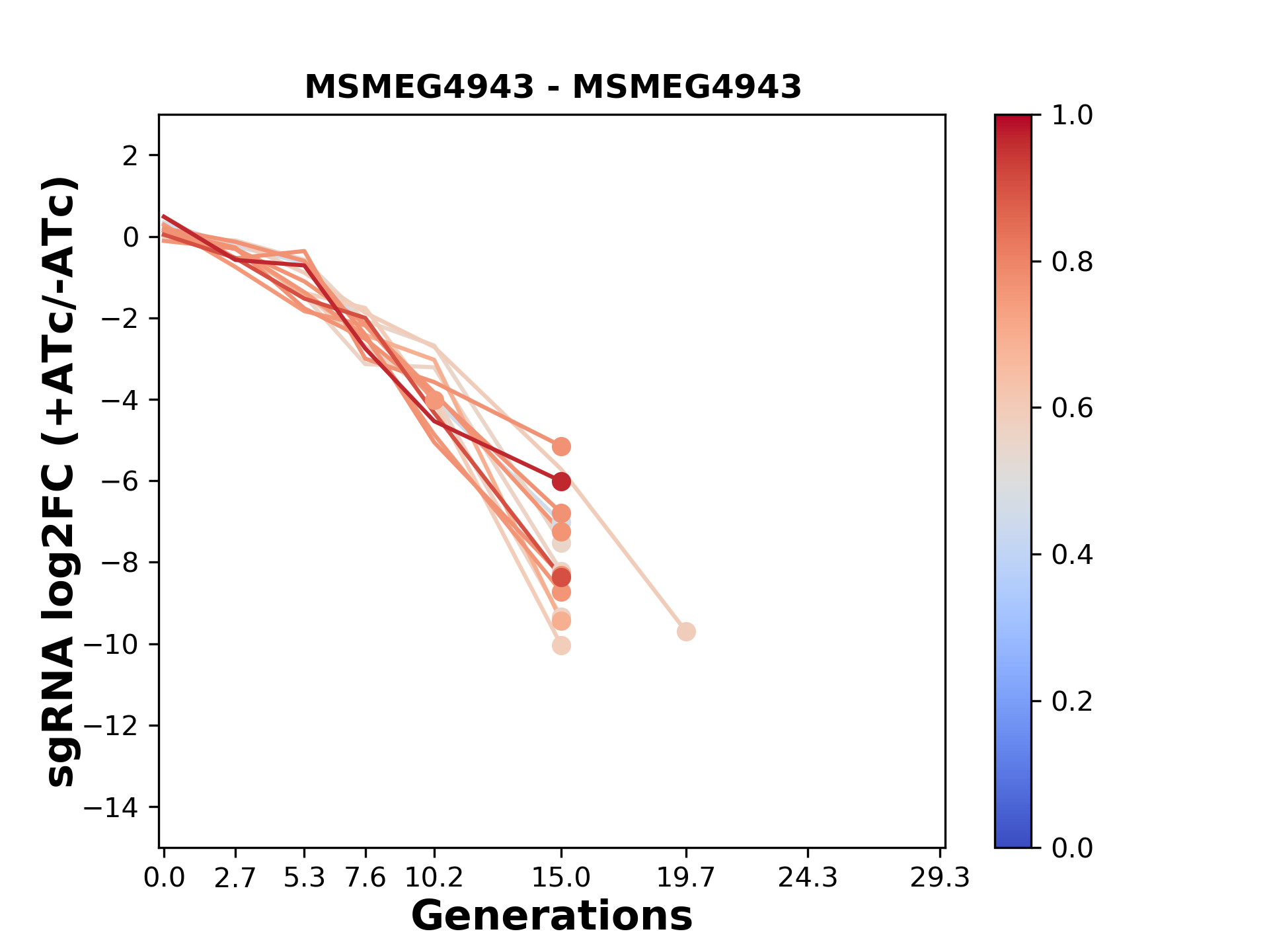 Here, we show sgRNA log2 fold-change values (L2FC) (plus versus minus ATc) over consecutive generations for sgRNAs targeting the gene you selected.