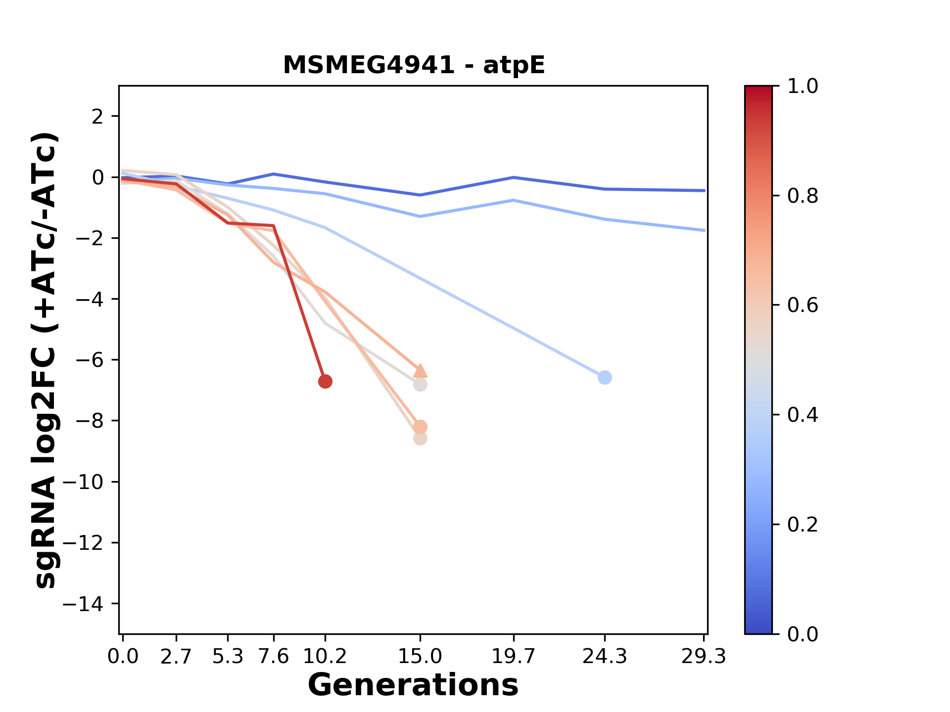 Here, we show sgRNA log2 fold-change values (L2FC) (plus versus minus ATc) over consecutive generations for sgRNAs targeting the gene you selected.