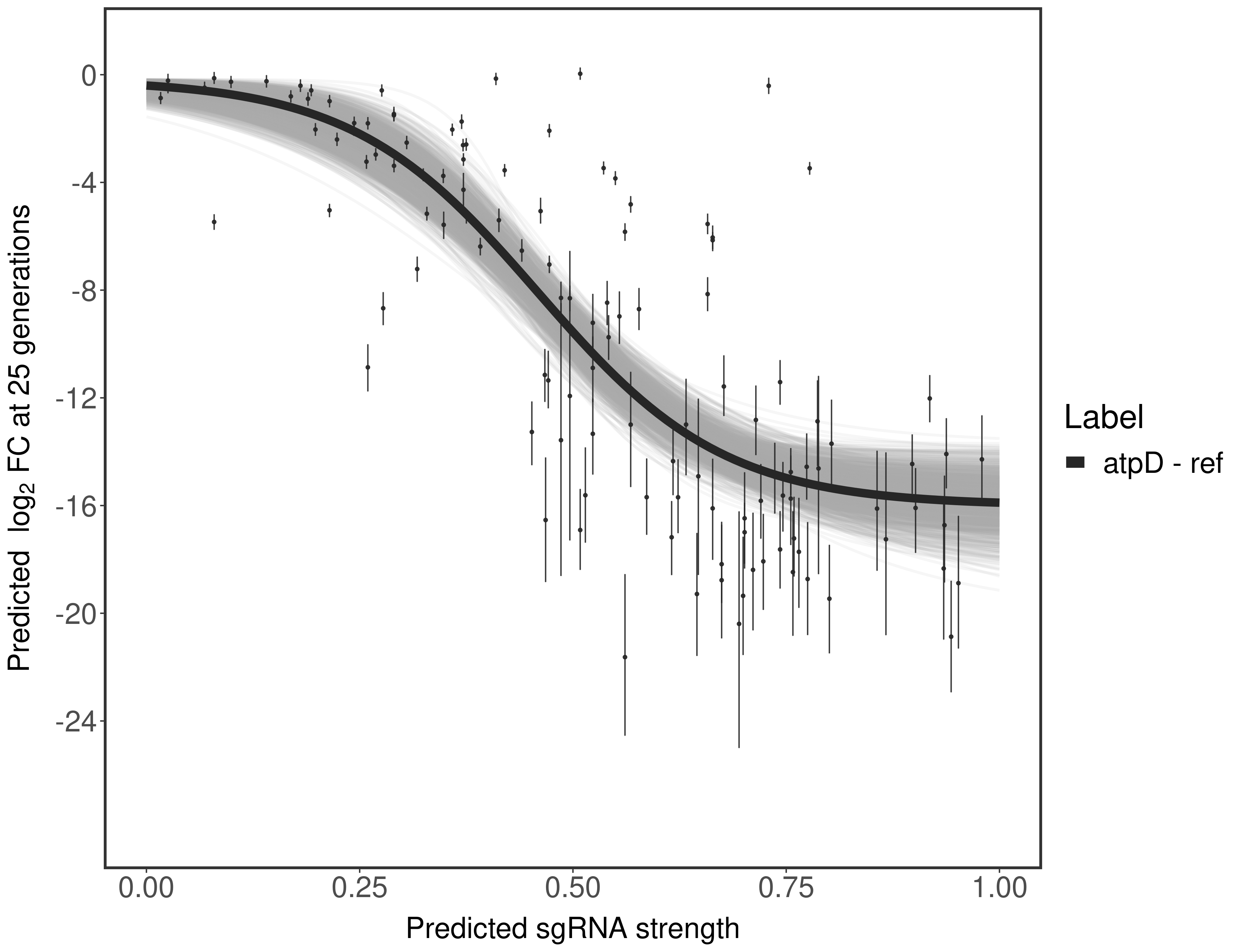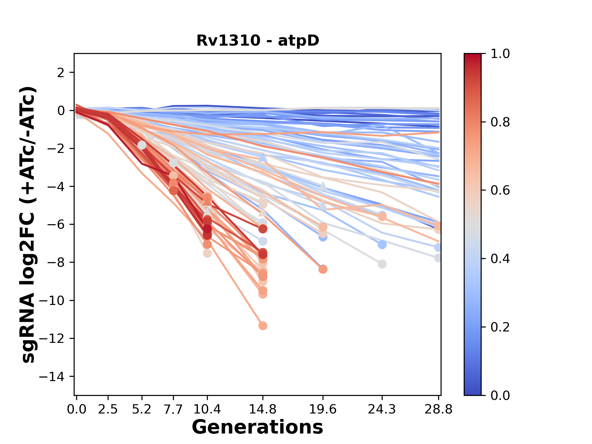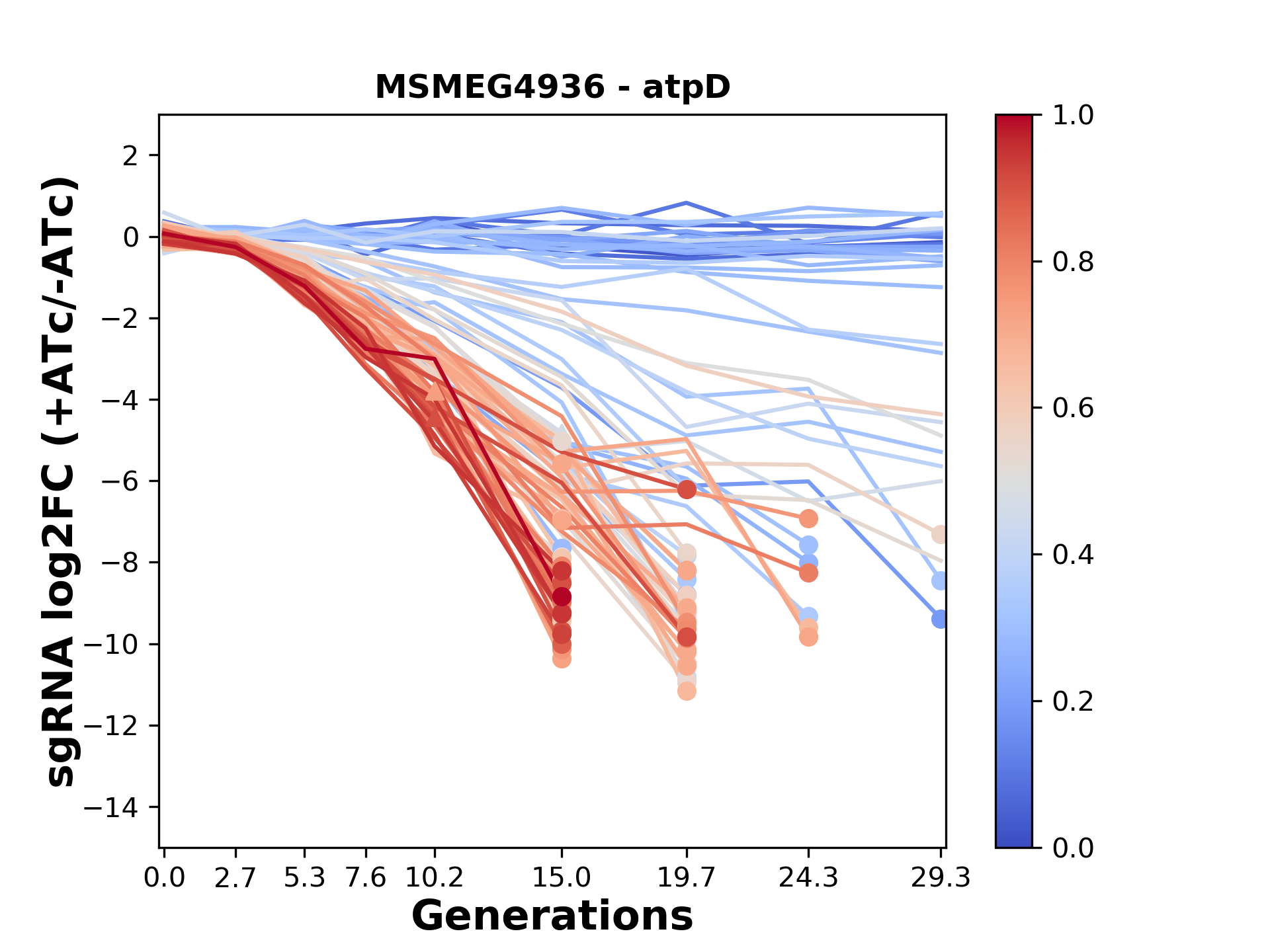 Experiment: We designed an M. tuberculosis CRISPRi library (RLC12) to target all annotated Mtb genes with single guide RNAs (sgRNAs) of varying predicted knockdown efficiencies. In parallel, we constructed a M. smegmatis CRISPRi library (RLC11) to target all annotated Msmeg genes, similar to the Mtb sgRNA library. RLC12 was transformed into M. tuberculosis H37Rv; RLC11 into M. smegmatis mc2-155. We passaged both CRISPRi libraries for nearly 30 generations in the presence or absence of the CRISPRi-inducer anhydrotetracycline (ATc). At the indicated timepoints, genomic DNA was harvested and the representation of individual sgRNAs was counted using Illumina sequencing. Here, we show sgRNA log2 fold-change values (L2FC) (plus versus minus ATc) over consecutive generations for sgRNAs targeting the gene you selected. sgRNAs are color-coded based on their predicted strength from blue (strength=0; weak) to red (strength=1; strong).
