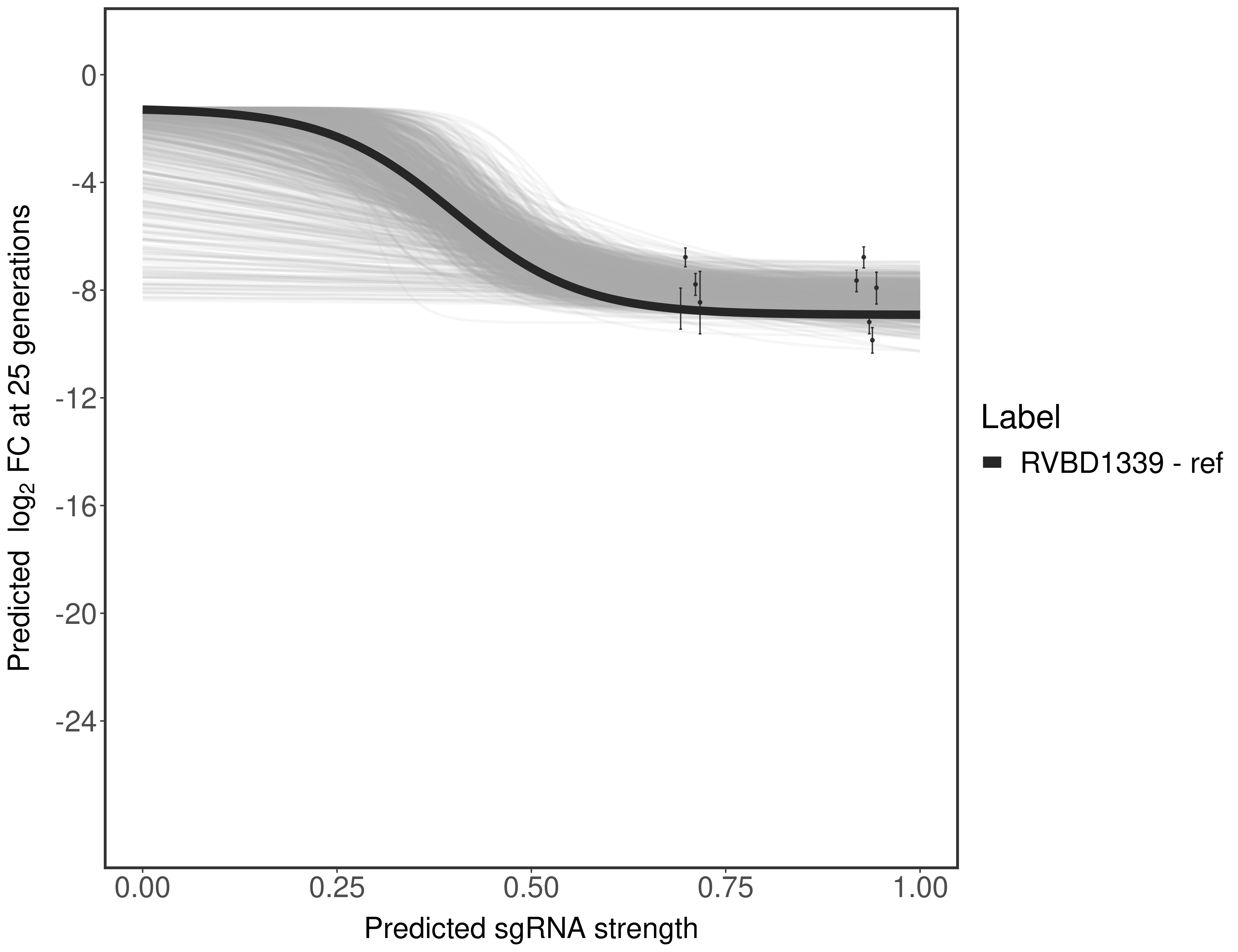 Experiment: We designed an M. tuberculosis CRISPRi library (RLC12) to target all annotated Mtb genes with single guide RNAs (sgRNAs) of varying predicted knockdown efficiencies. In parallel, we constructed a M. smegmatis CRISPRi library (RLC11) to target all annotated Msmeg genes, similar to the Mtb sgRNA library. RLC12 was transformed into M. tuberculosis H37Rv; RLC11 into M. smegmatis mc2-155. We passaged both CRISPRi libraries for nearly 30 generations in the presence or absence of the CRISPRi-inducer anhydrotetracycline (ATc). At the indicated timepoints, genomic DNA was harvested and the representation of individual sgRNAs was counted using Illumina sequencing. Here, we show sgRNA log2 fold-change values (L2FC) (plus versus minus ATc) over consecutive generations for sgRNAs targeting the gene you selected. sgRNAs are color-coded based on their predicted strength from blue (strength=0; weak) to red (strength=1; strong).