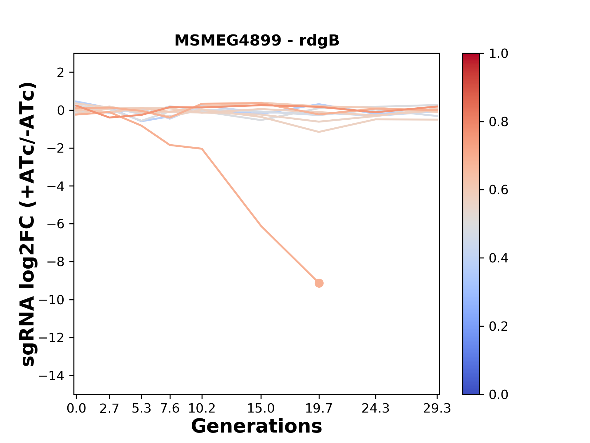 Here, we show sgRNA log2 fold-change values (L2FC) (plus versus minus ATc) over consecutive generations for sgRNAs targeting the gene you selected.