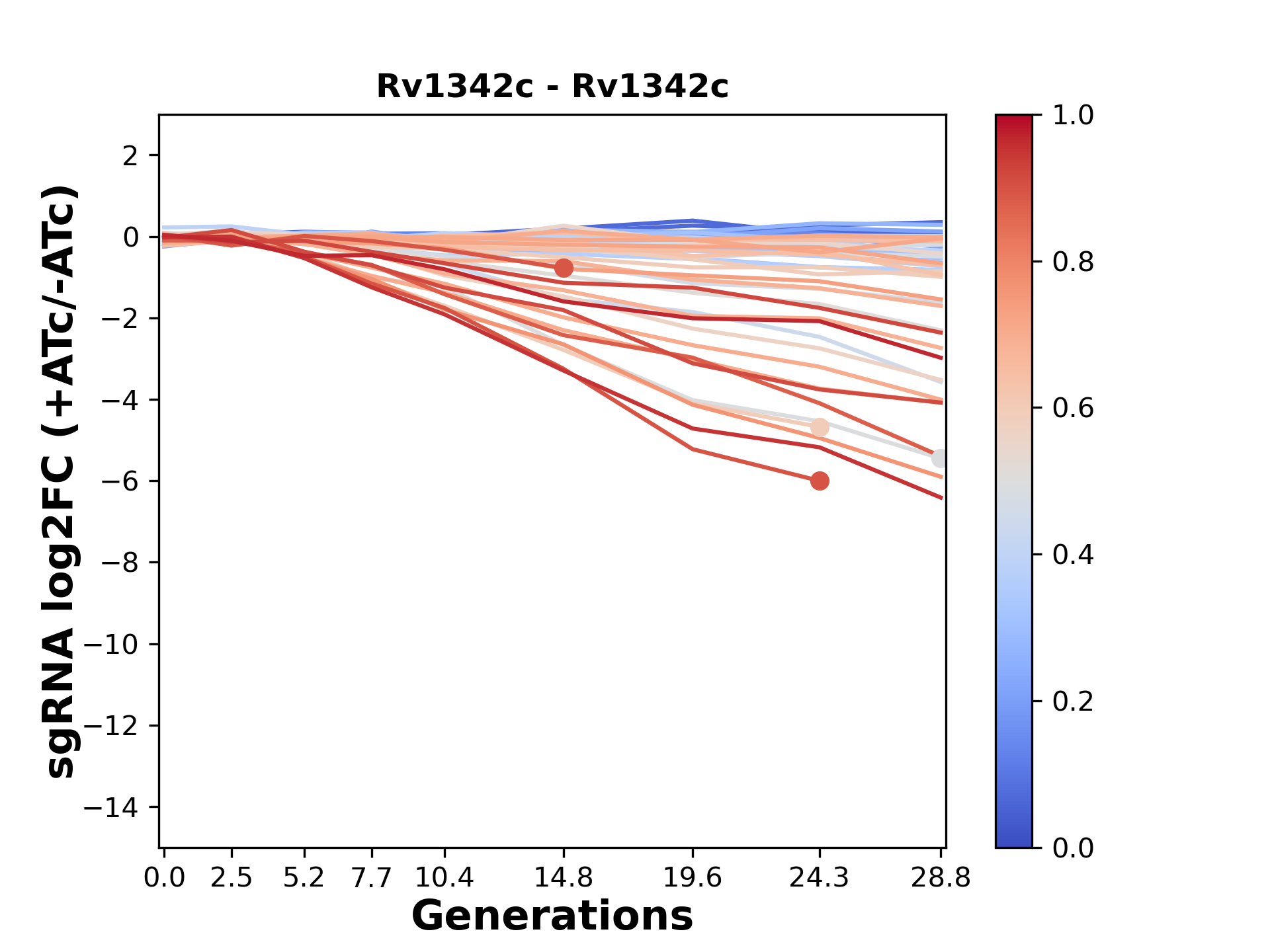Experiment: We designed an M. tuberculosis CRISPRi library (RLC12) to target all annotated Mtb genes with single guide RNAs (sgRNAs) of varying predicted knockdown efficiencies. In parallel, we constructed a M. smegmatis CRISPRi library (RLC11) to target all annotated Msmeg genes, similar to the Mtb sgRNA library. RLC12 was transformed into M. tuberculosis H37Rv; RLC11 into M. smegmatis mc2-155. We passaged both CRISPRi libraries for nearly 30 generations in the presence or absence of the CRISPRi-inducer anhydrotetracycline (ATc). At the indicated timepoints, genomic DNA was harvested and the representation of individual sgRNAs was counted using Illumina sequencing. Here, we show sgRNA log2 fold-change values (L2FC) (plus versus minus ATc) over consecutive generations for sgRNAs targeting the gene you selected. sgRNAs are color-coded based on their predicted strength from blue (strength=0; weak) to red (strength=1; strong).