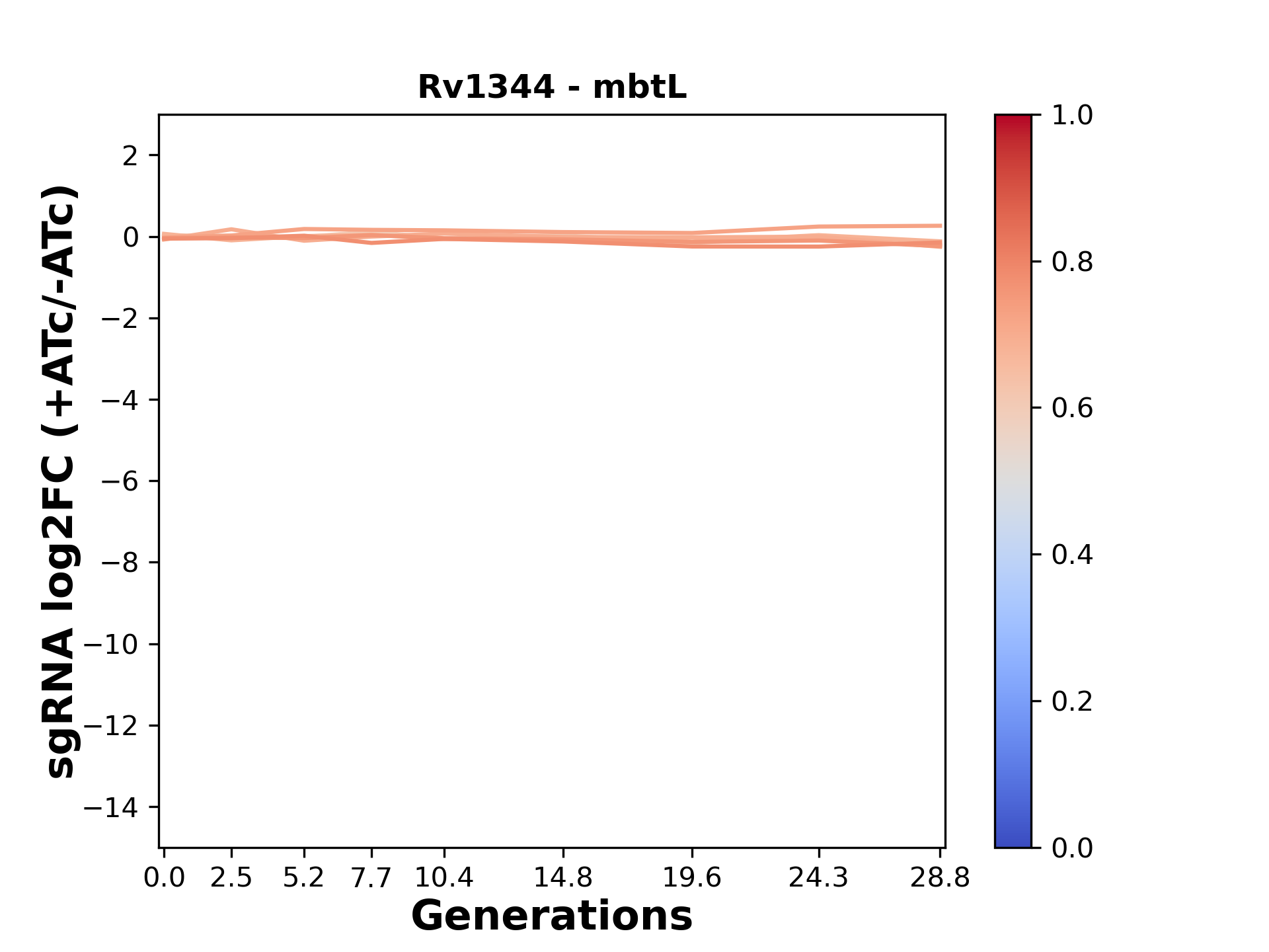 Here, we show sgRNA log2 fold-change values (L2FC) (plus versus minus ATc) over consecutive generations for sgRNAs targeting the gene you selected.