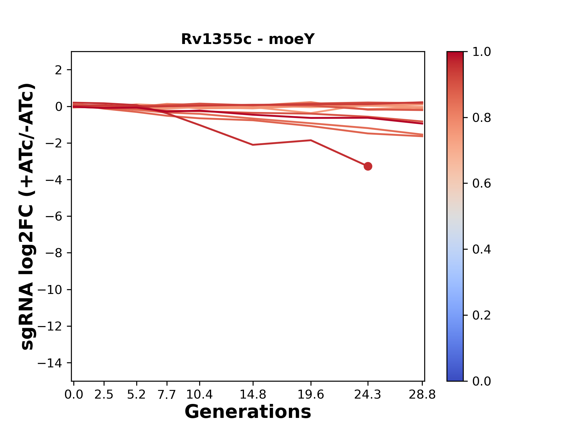 Here, we show sgRNA log2 fold-change values (L2FC) (plus versus minus ATc) over consecutive generations for sgRNAs targeting the gene you selected.