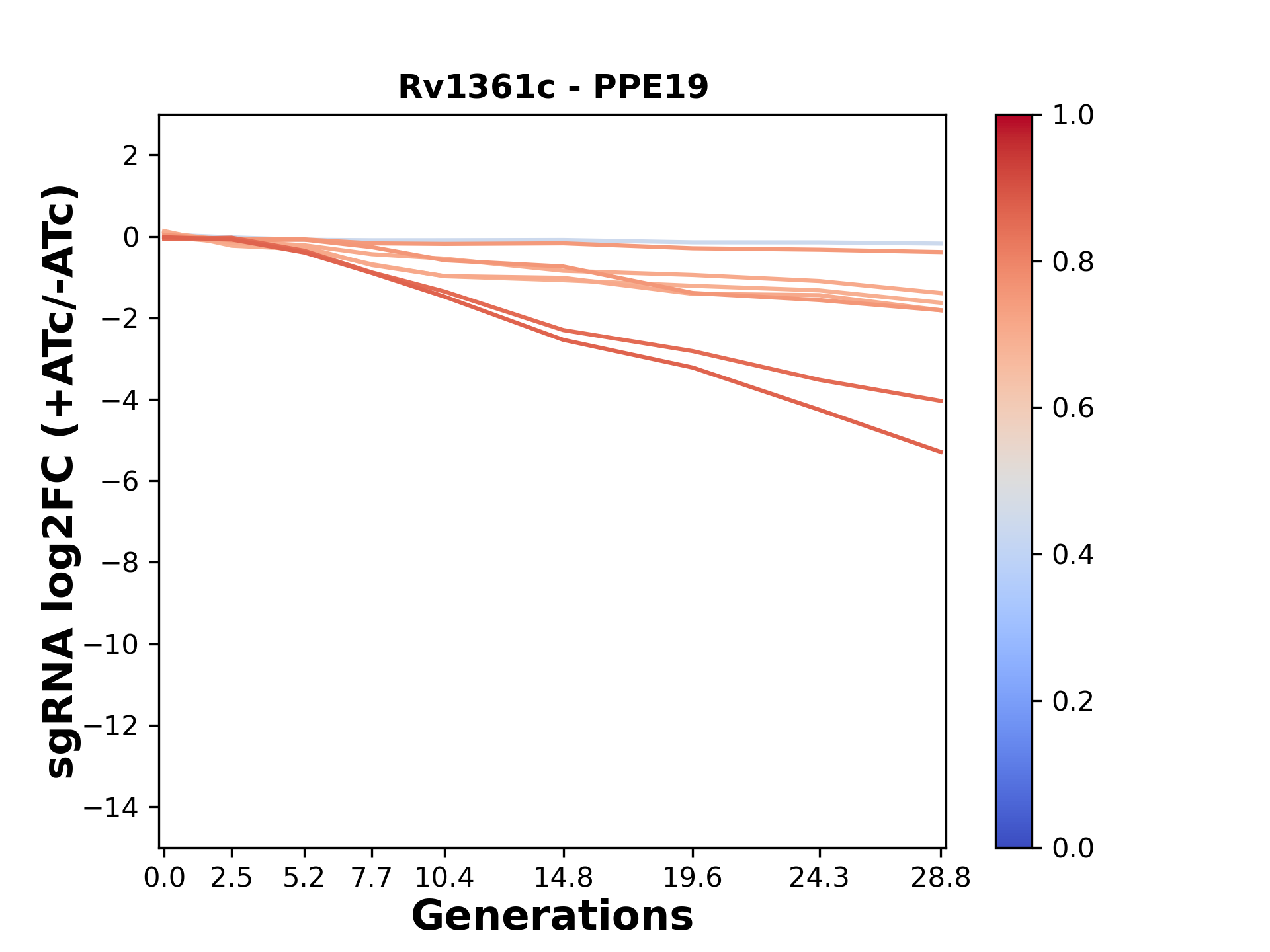 Here, we show sgRNA log2 fold-change values (L2FC) (plus versus minus ATc) over consecutive generations for sgRNAs targeting the gene you selected.