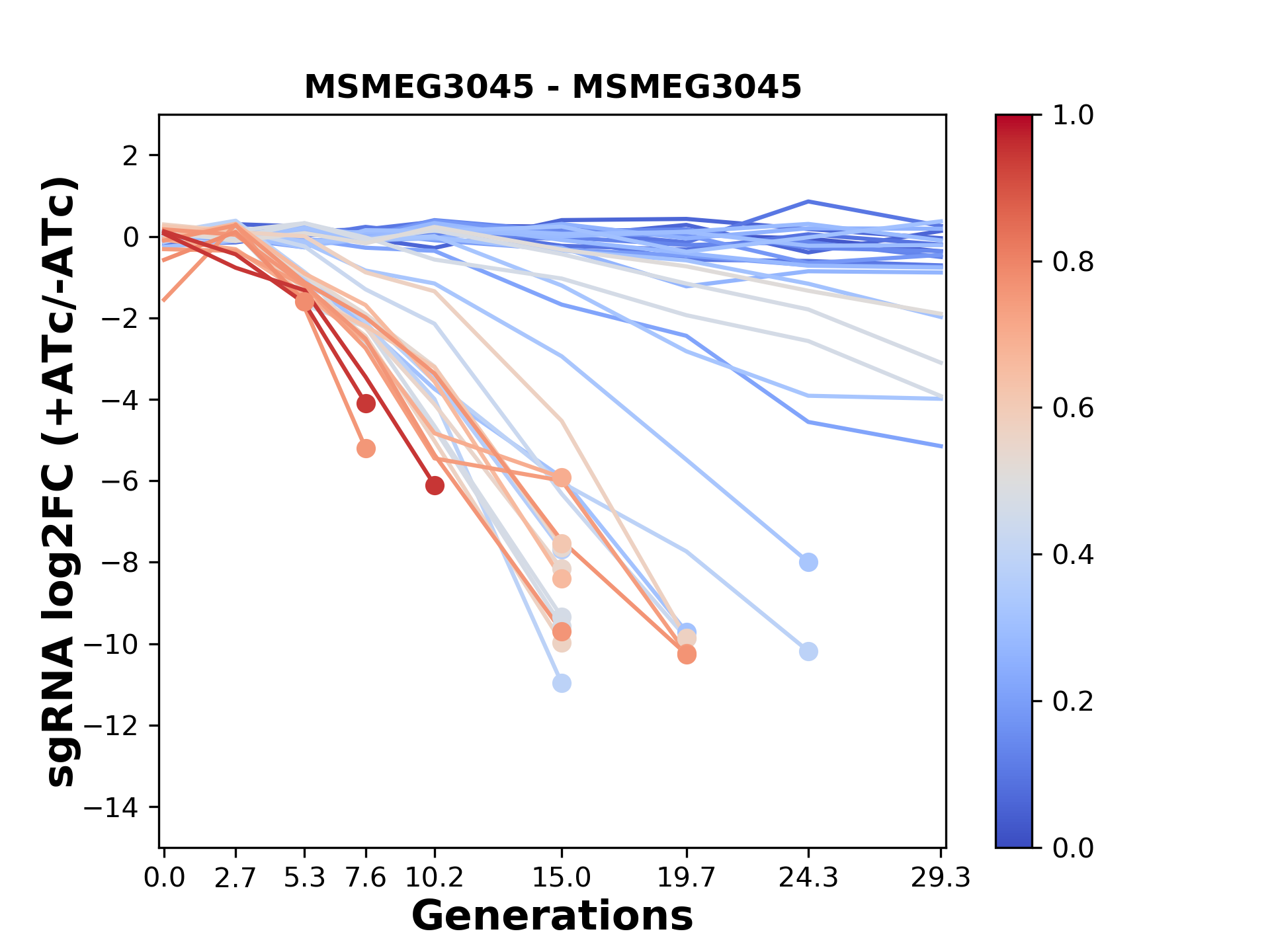 Here, we show sgRNA log2 fold-change values (L2FC) (plus versus minus ATc) over consecutive generations for sgRNAs targeting the gene you selected.