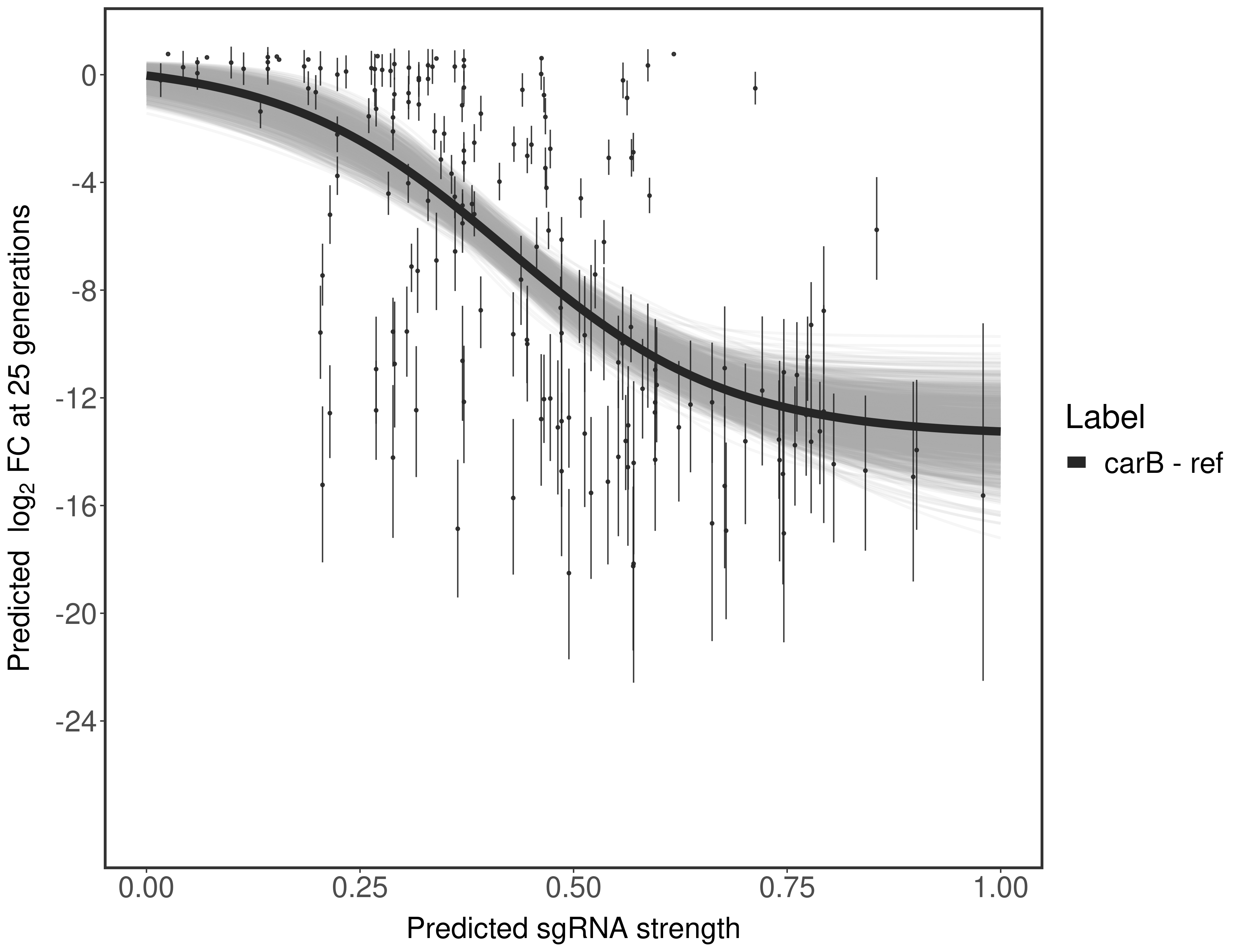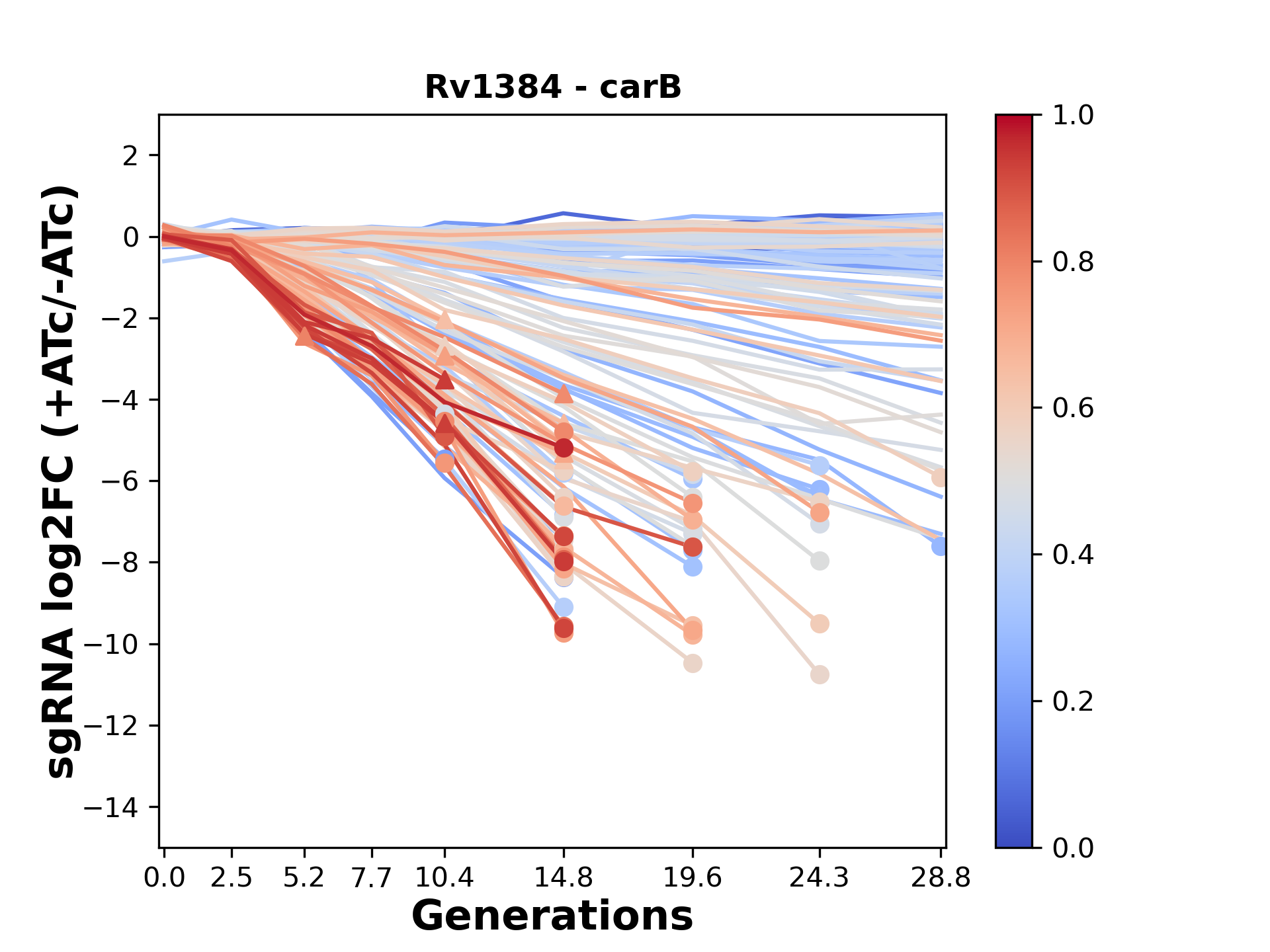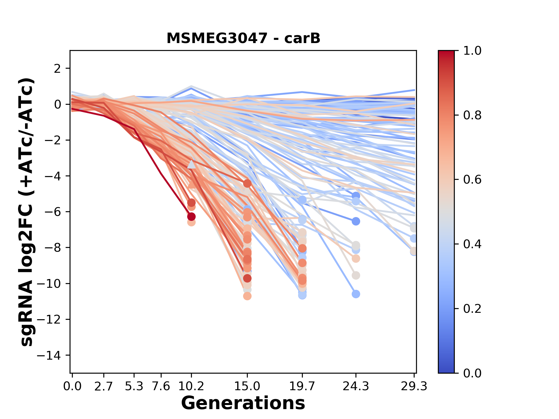 Here, we show sgRNA log2 fold-change values (L2FC) (plus versus minus ATc) over consecutive generations for sgRNAs targeting the gene you selected.