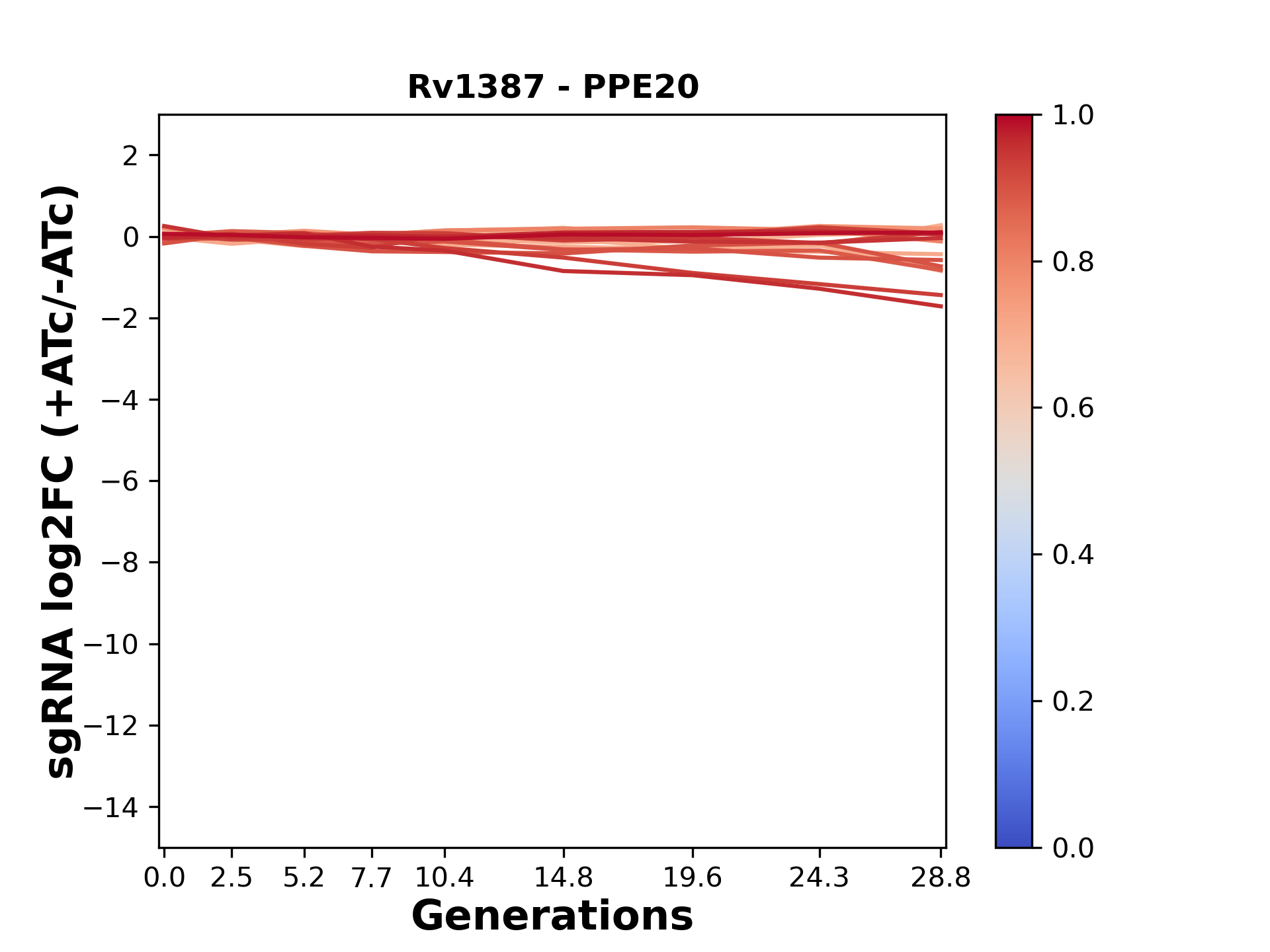 Here, we show sgRNA log2 fold-change values (L2FC) (plus versus minus ATc) over consecutive generations for sgRNAs targeting the gene you selected.
