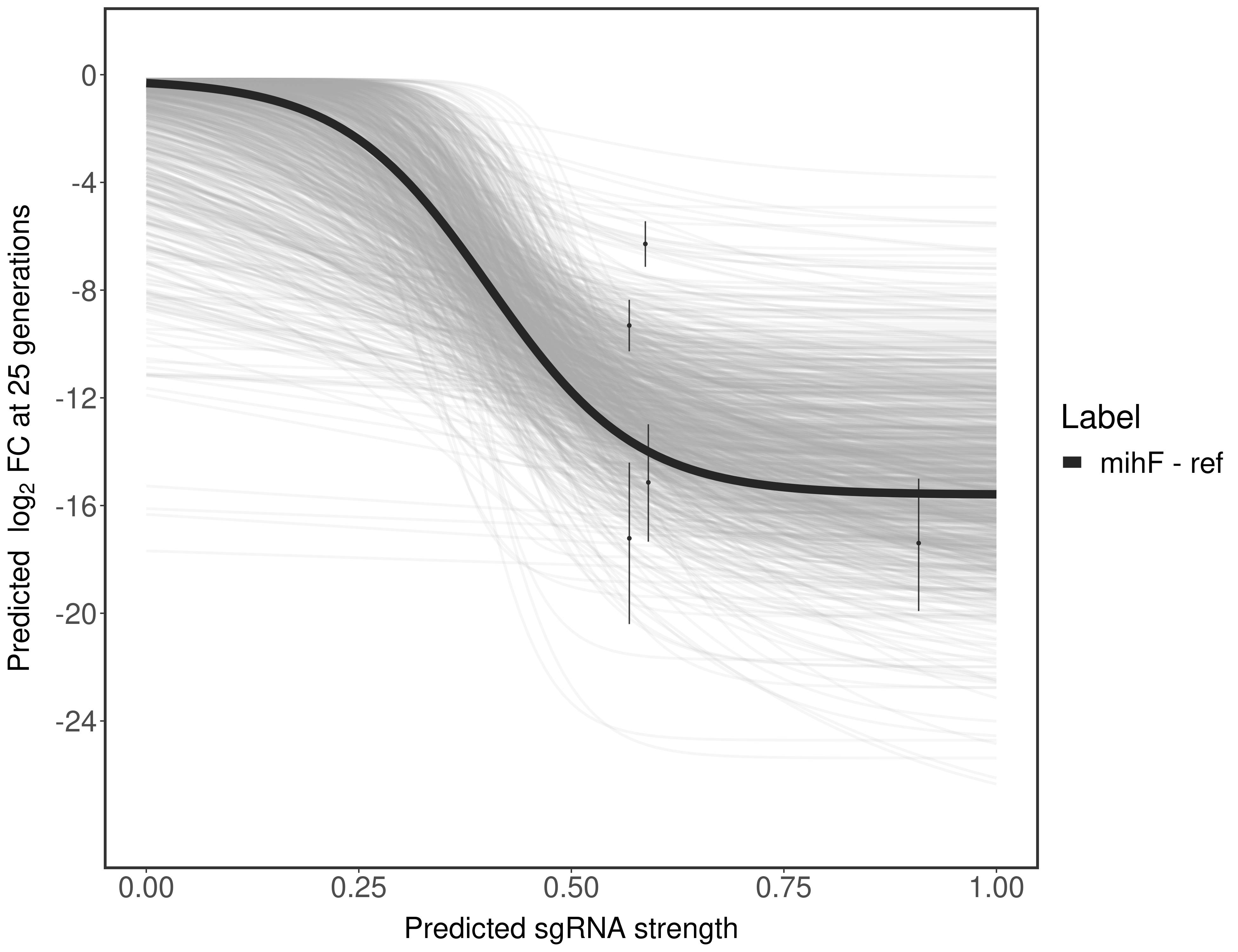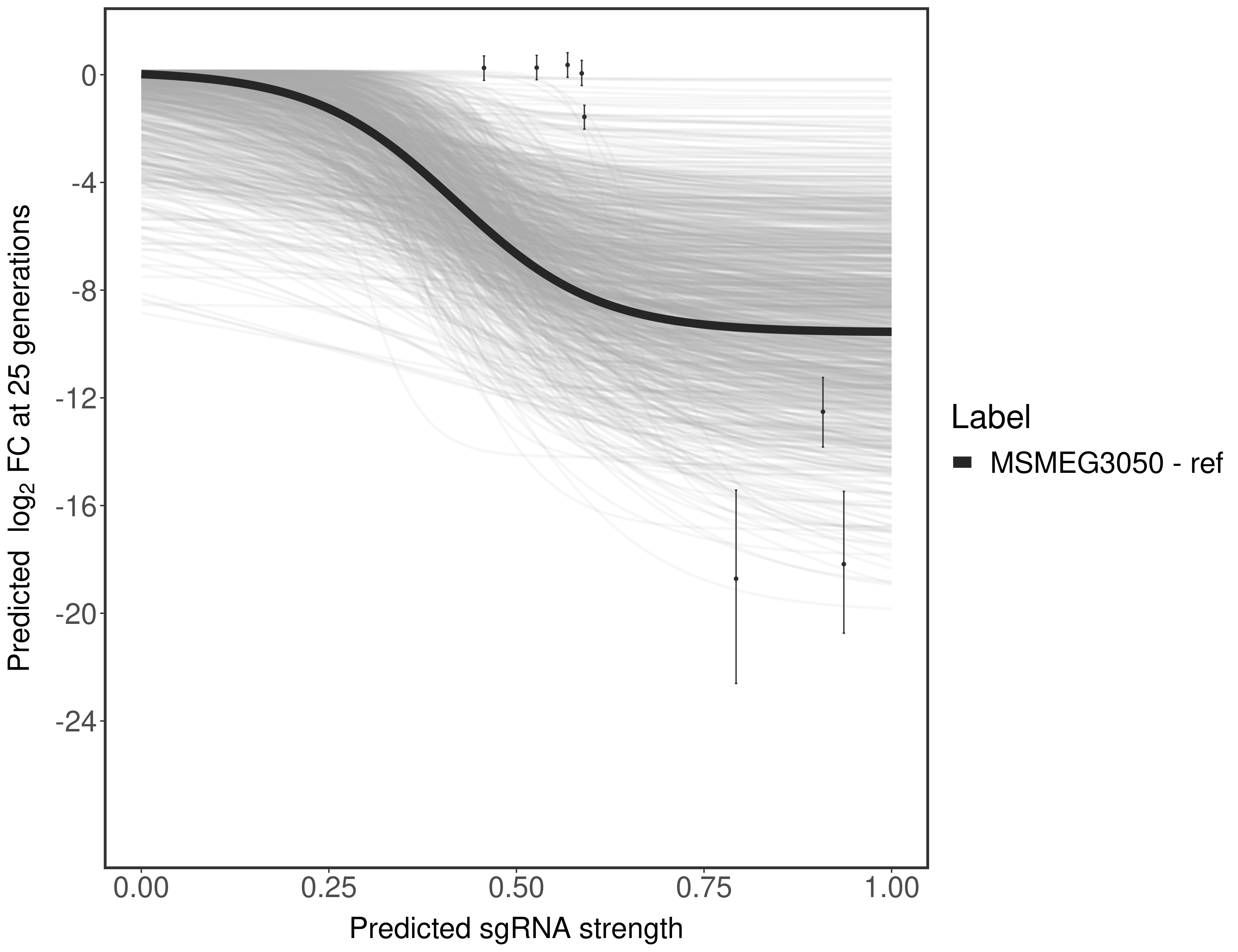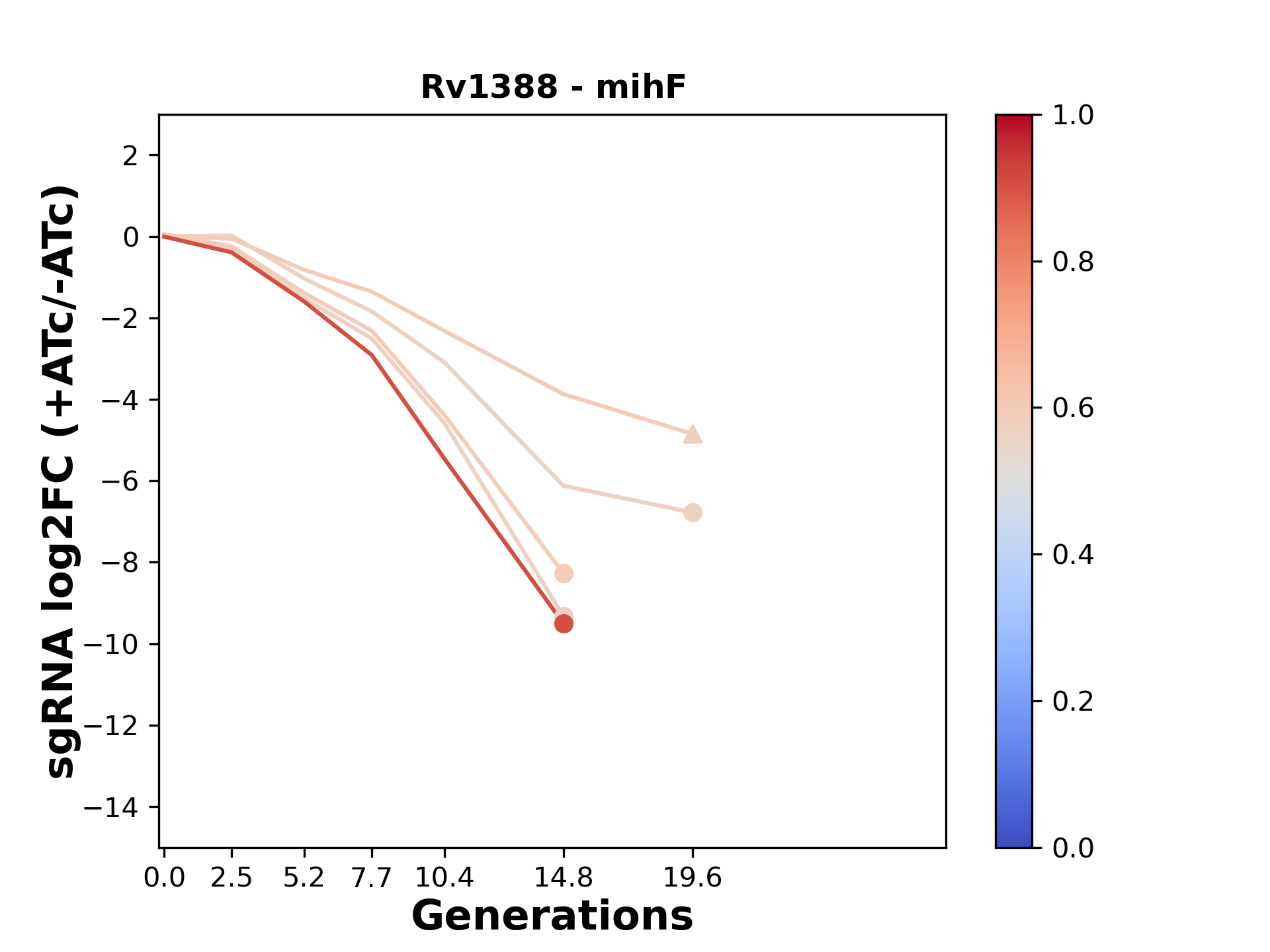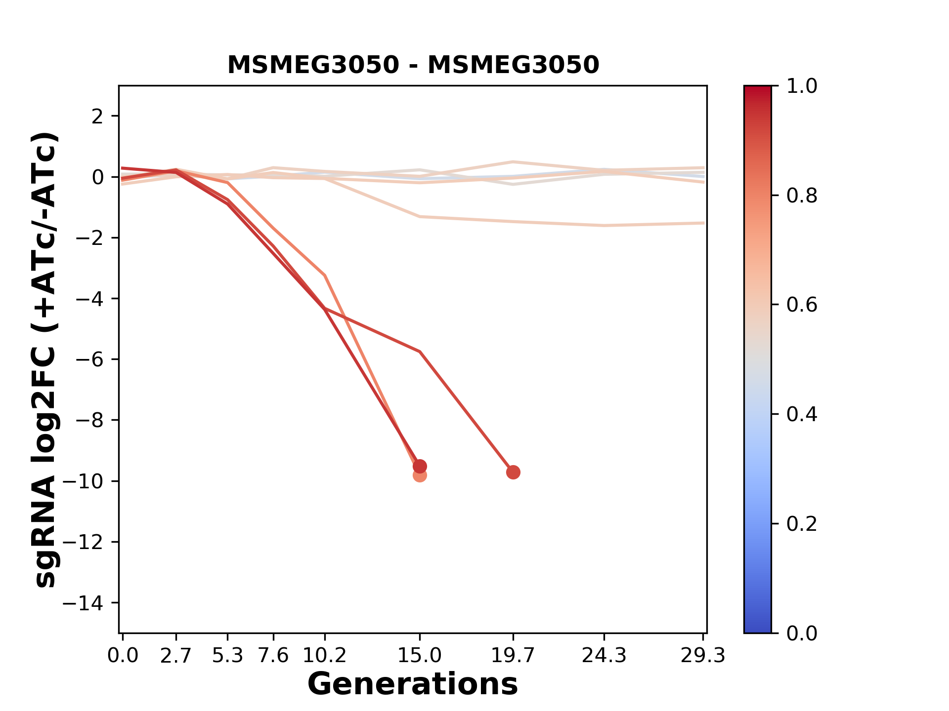 Experiment: We designed an M. tuberculosis CRISPRi library (RLC12) to target all annotated Mtb genes with single guide RNAs (sgRNAs) of varying predicted knockdown efficiencies. In parallel, we constructed a M. smegmatis CRISPRi library (RLC11) to target all annotated Msmeg genes, similar to the Mtb sgRNA library. RLC12 was transformed into M. tuberculosis H37Rv; RLC11 into M. smegmatis mc2-155. We passaged both CRISPRi libraries for nearly 30 generations in the presence or absence of the CRISPRi-inducer anhydrotetracycline (ATc). At the indicated timepoints, genomic DNA was harvested and the representation of individual sgRNAs was counted using Illumina sequencing. Here, we show sgRNA log2 fold-change values (L2FC) (plus versus minus ATc) over consecutive generations for sgRNAs targeting the gene you selected. sgRNAs are color-coded based on their predicted strength from blue (strength=0; weak) to red (strength=1; strong).