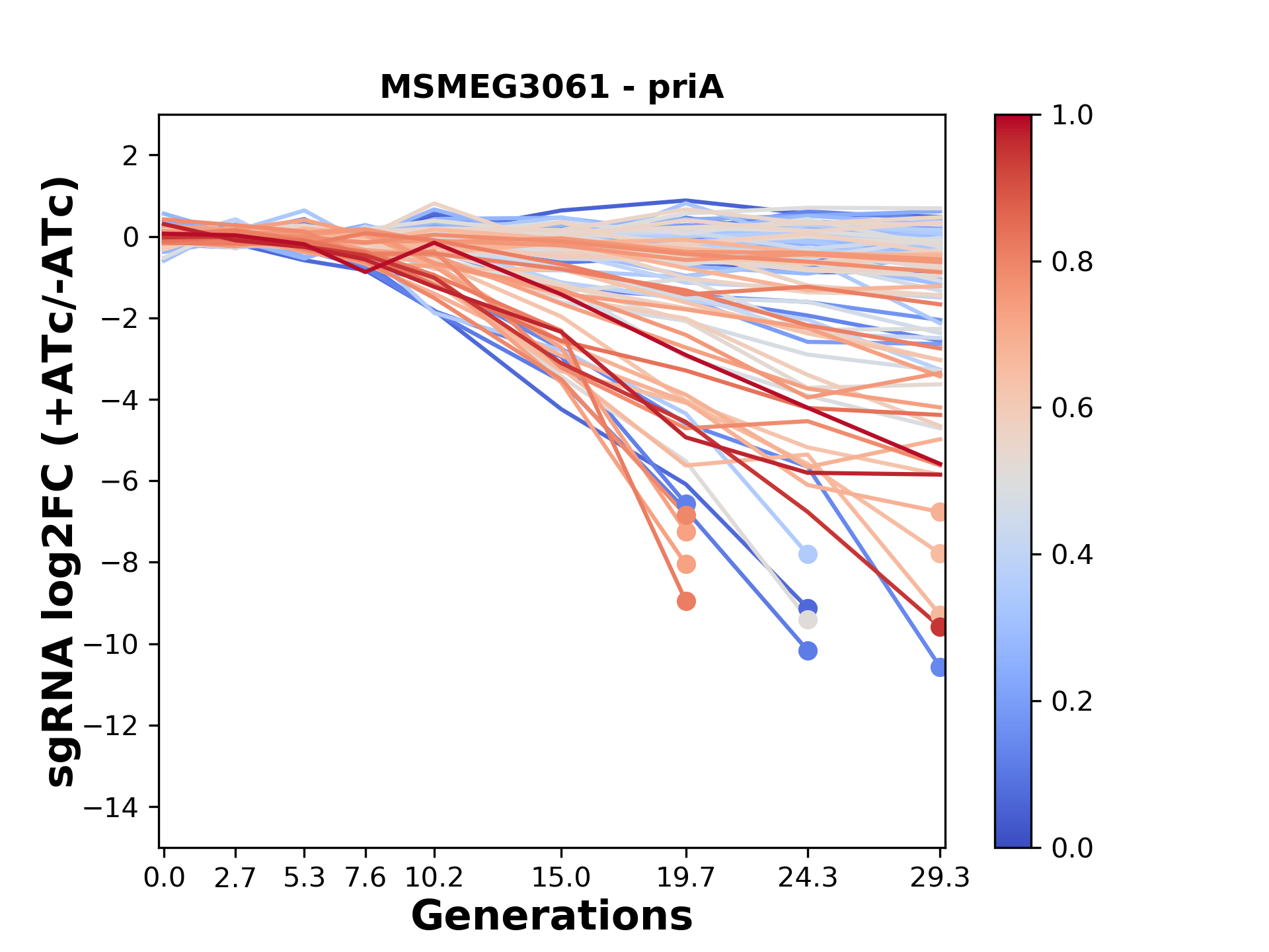 Here, we show sgRNA log2 fold-change values (L2FC) (plus versus minus ATc) over consecutive generations for sgRNAs targeting the gene you selected.