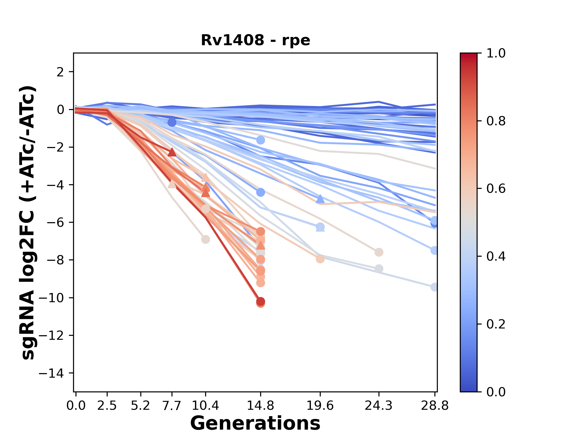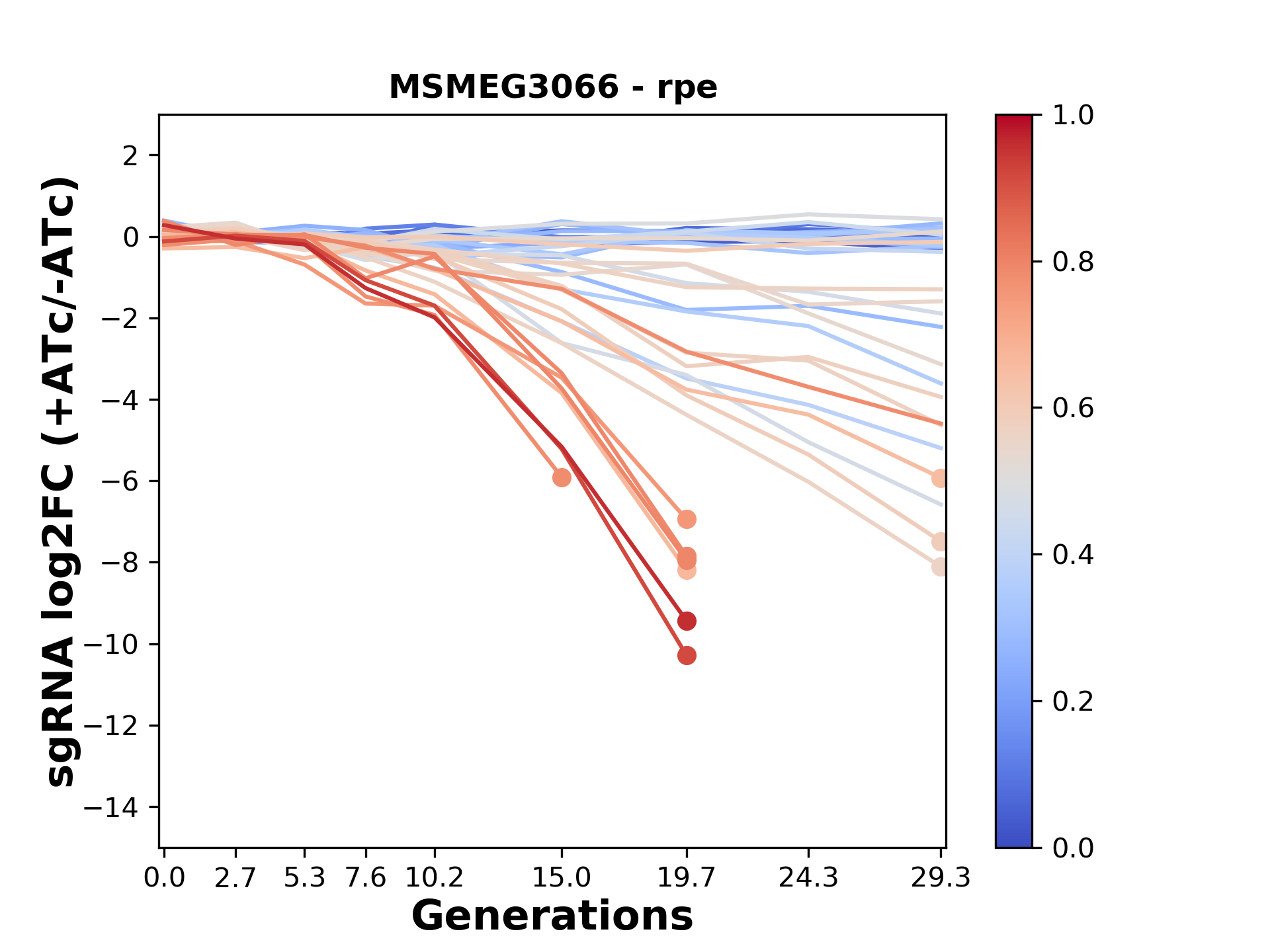 Experiment: We designed an M. tuberculosis CRISPRi library (RLC12) to target all annotated Mtb genes with single guide RNAs (sgRNAs) of varying predicted knockdown efficiencies. In parallel, we constructed a M. smegmatis CRISPRi library (RLC11) to target all annotated Msmeg genes, similar to the Mtb sgRNA library. RLC12 was transformed into M. tuberculosis H37Rv; RLC11 into M. smegmatis mc2-155. We passaged both CRISPRi libraries for nearly 30 generations in the presence or absence of the CRISPRi-inducer anhydrotetracycline (ATc). At the indicated timepoints, genomic DNA was harvested and the representation of individual sgRNAs was counted using Illumina sequencing. Here, we show sgRNA log2 fold-change values (L2FC) (plus versus minus ATc) over consecutive generations for sgRNAs targeting the gene you selected. sgRNAs are color-coded based on their predicted strength from blue (strength=0; weak) to red (strength=1; strong).