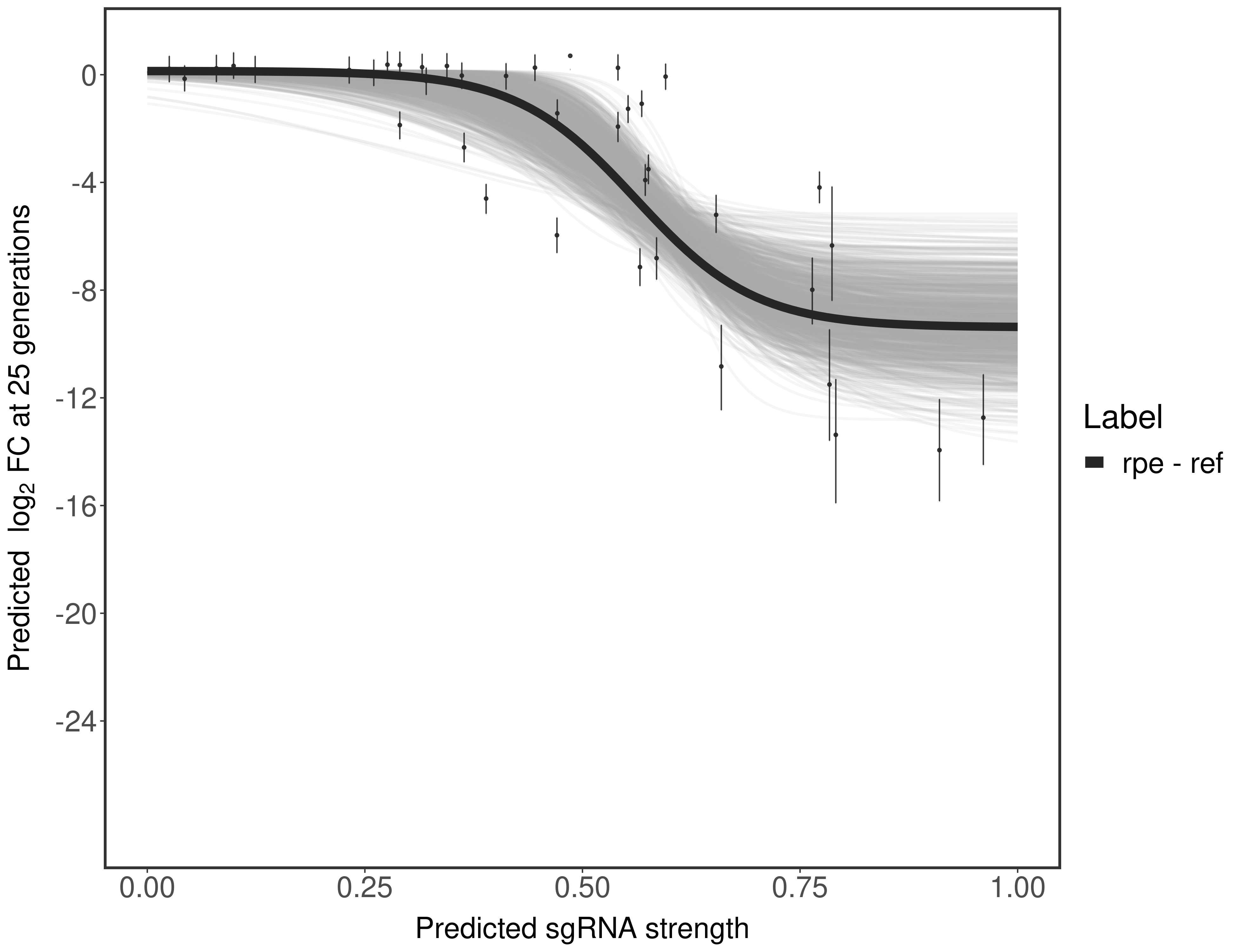 In order to quantify gene vulnerability, data were subsequently analyzed with a hierarchical model at the sgRNA level (two-line model) and gene level (Hill curve). The vulnerability quantification is shown below. [More information]