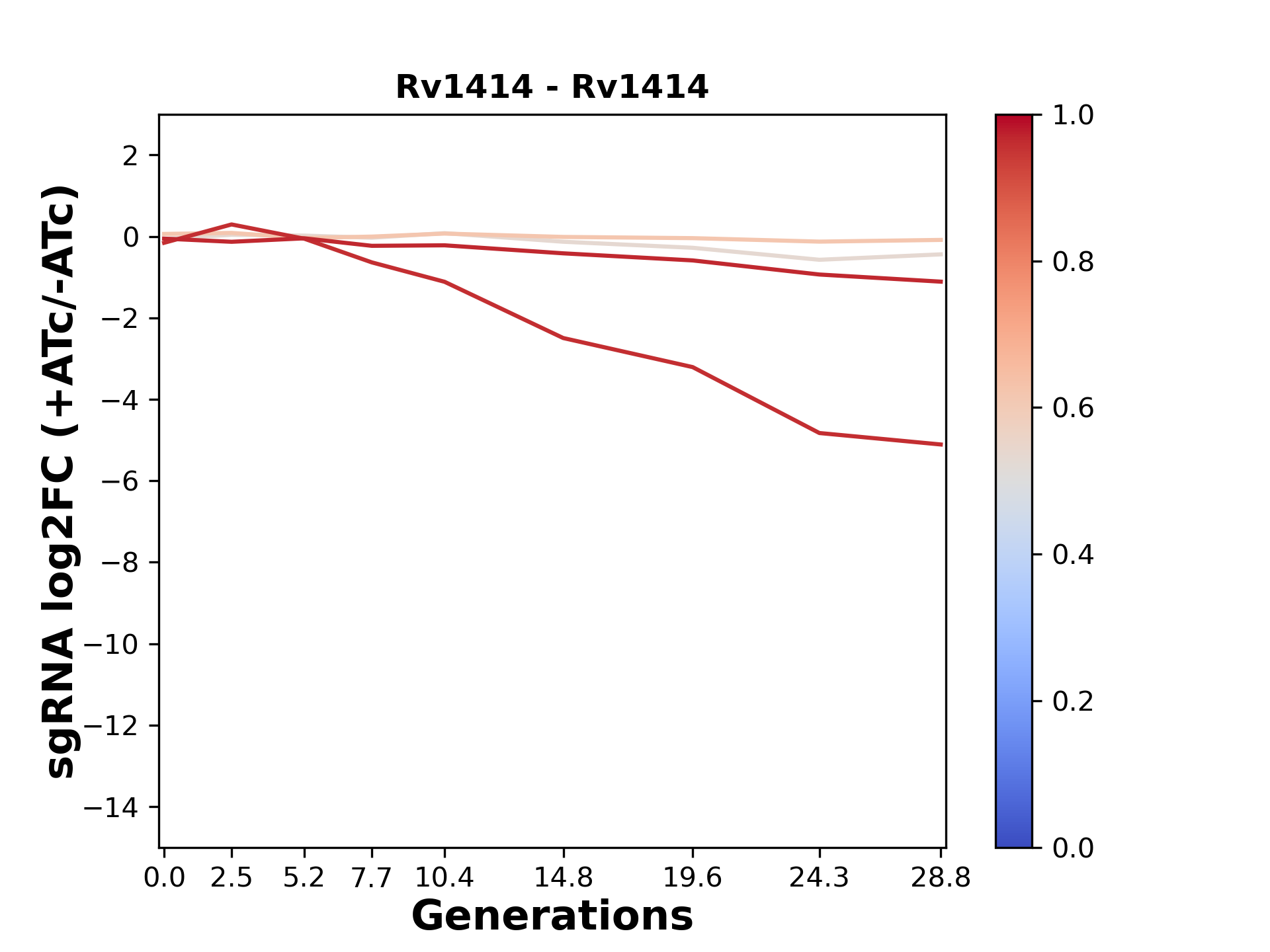 Experiment: We designed an M. tuberculosis CRISPRi library (RLC12) to target all annotated Mtb genes with single guide RNAs (sgRNAs) of varying predicted knockdown efficiencies. In parallel, we constructed a M. smegmatis CRISPRi library (RLC11) to target all annotated Msmeg genes, similar to the Mtb sgRNA library. RLC12 was transformed into M. tuberculosis H37Rv; RLC11 into M. smegmatis mc2-155. We passaged both CRISPRi libraries for nearly 30 generations in the presence or absence of the CRISPRi-inducer anhydrotetracycline (ATc). At the indicated timepoints, genomic DNA was harvested and the representation of individual sgRNAs was counted using Illumina sequencing. Here, we show sgRNA log2 fold-change values (L2FC) (plus versus minus ATc) over consecutive generations for sgRNAs targeting the gene you selected. sgRNAs are color-coded based on their predicted strength from blue (strength=0; weak) to red (strength=1; strong).