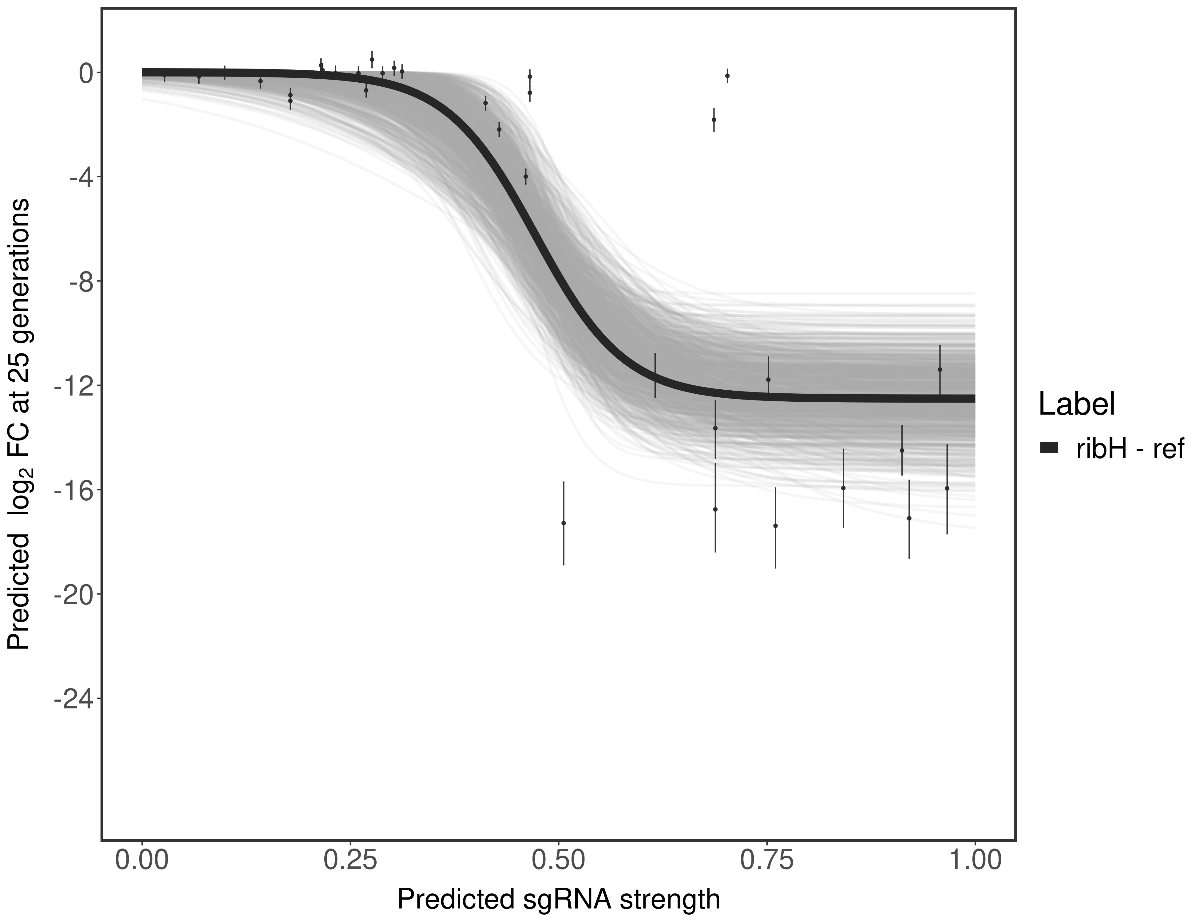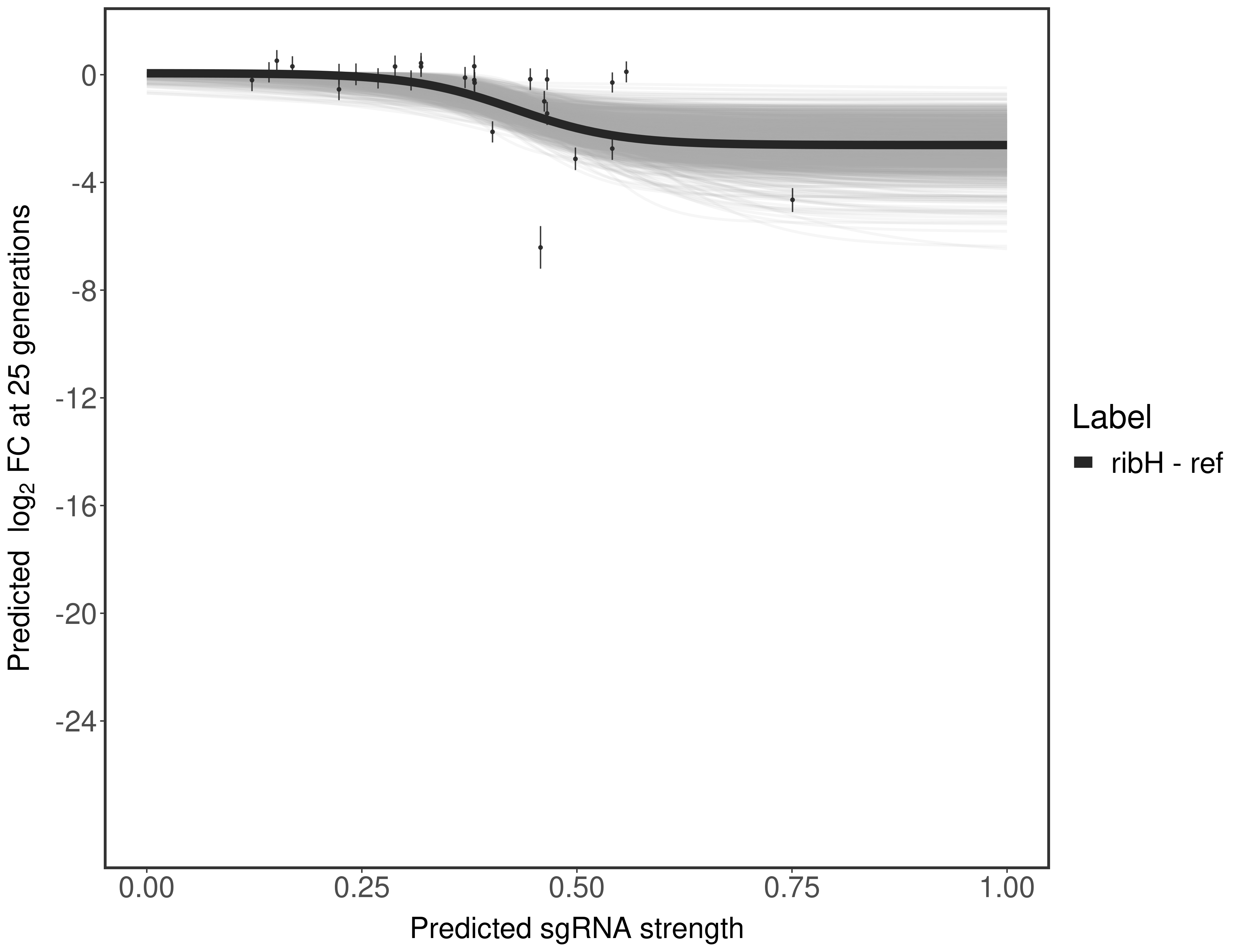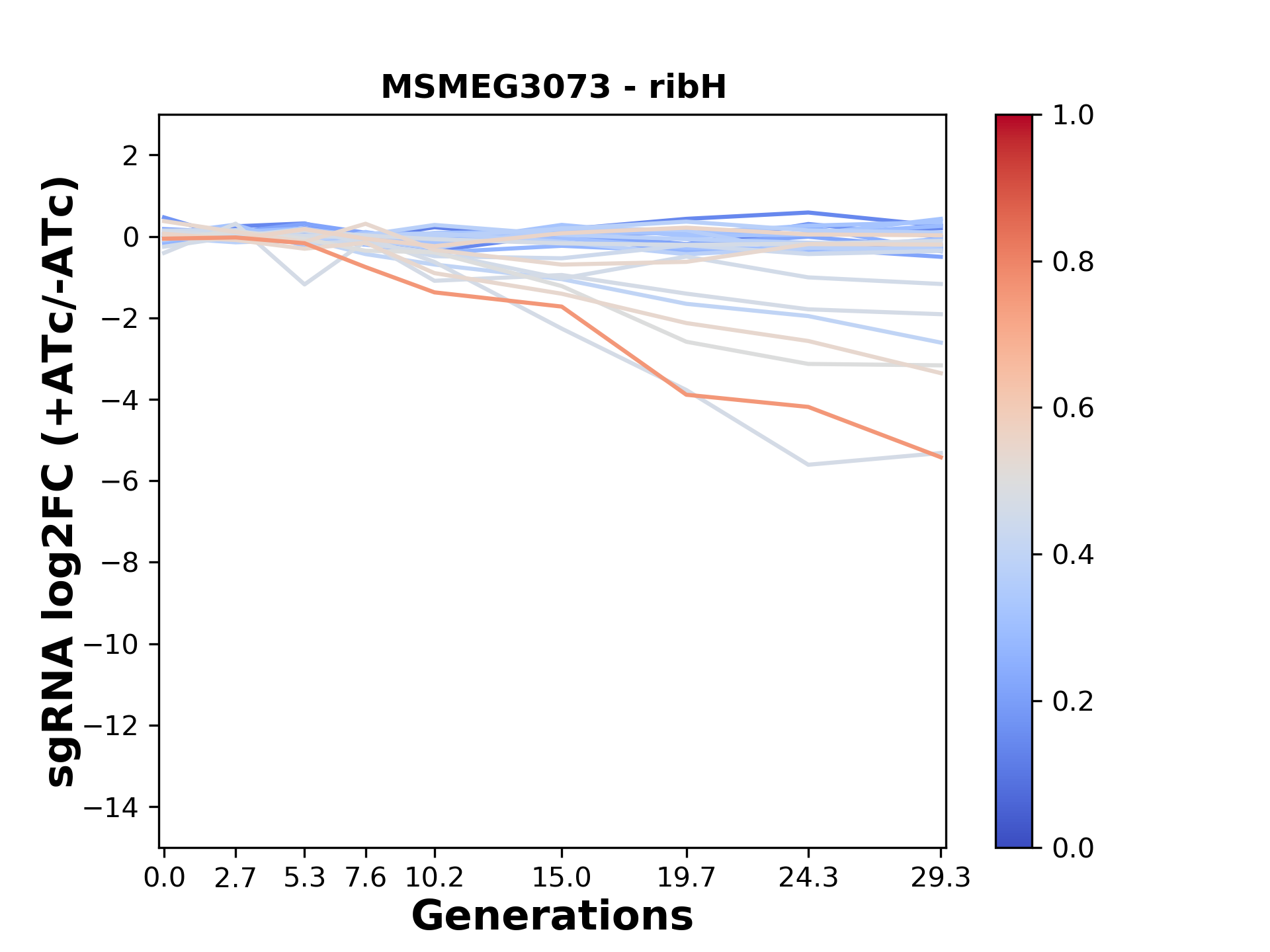 Here, we show sgRNA log2 fold-change values (L2FC) (plus versus minus ATc) over consecutive generations for sgRNAs targeting the gene you selected.