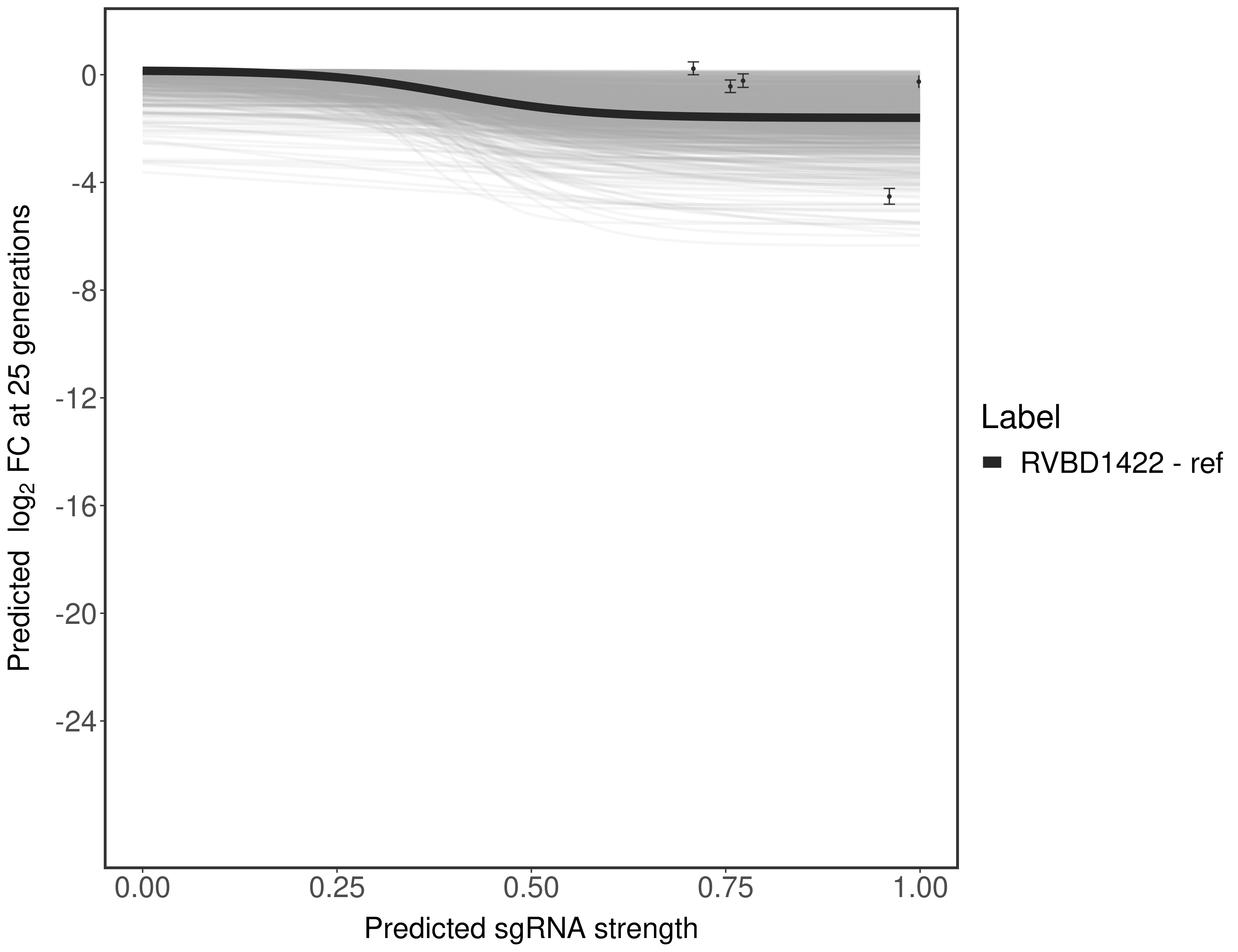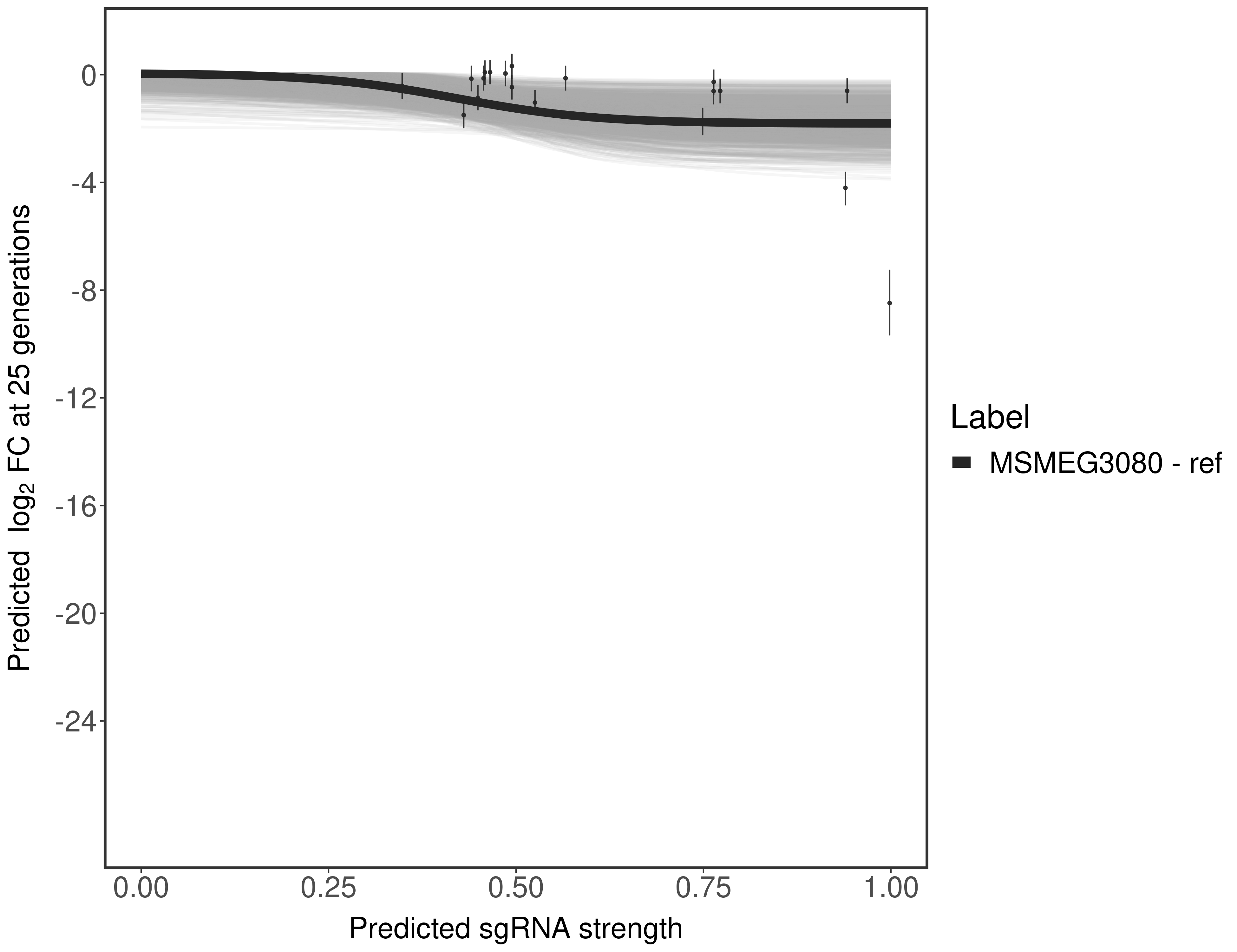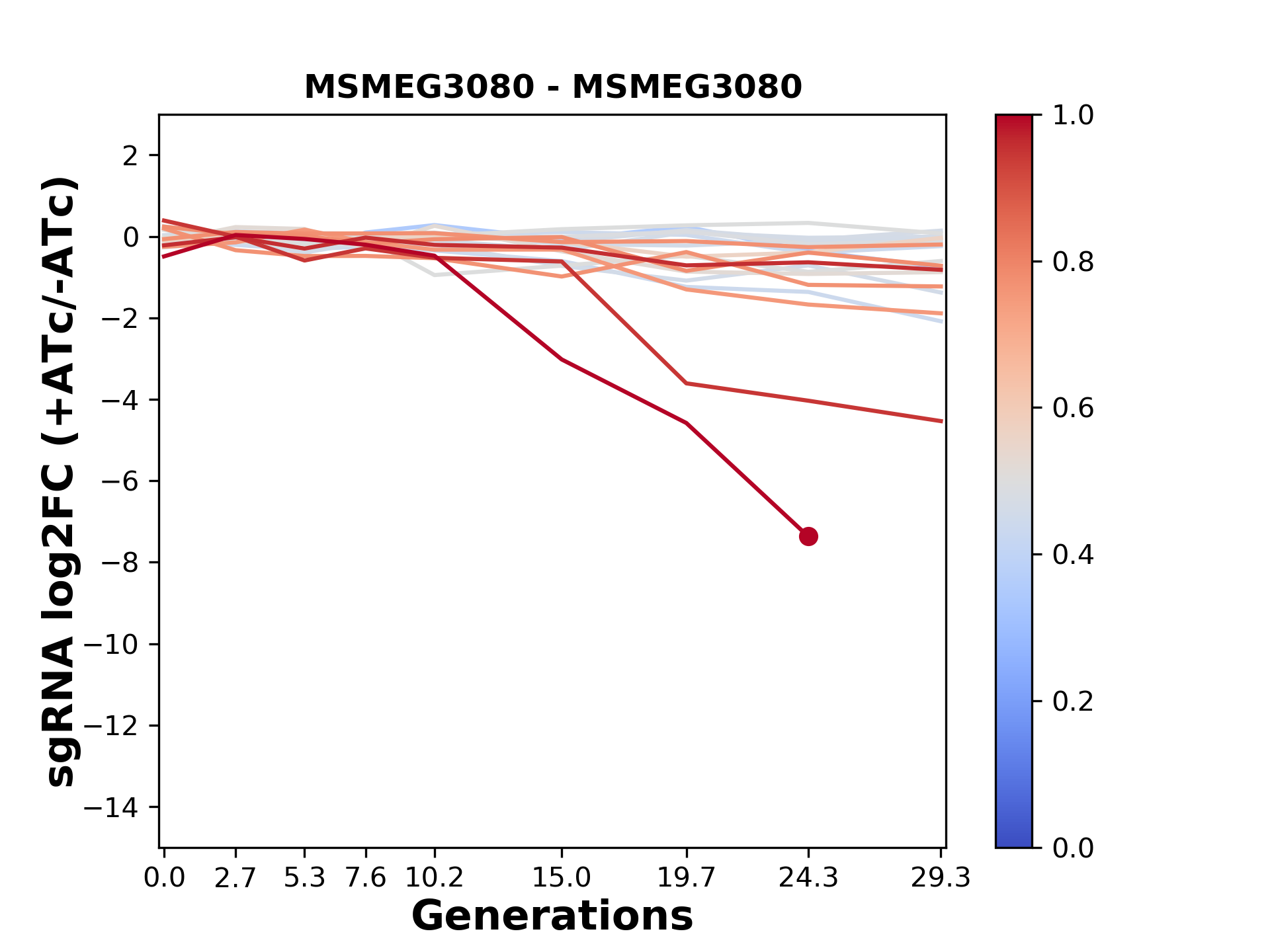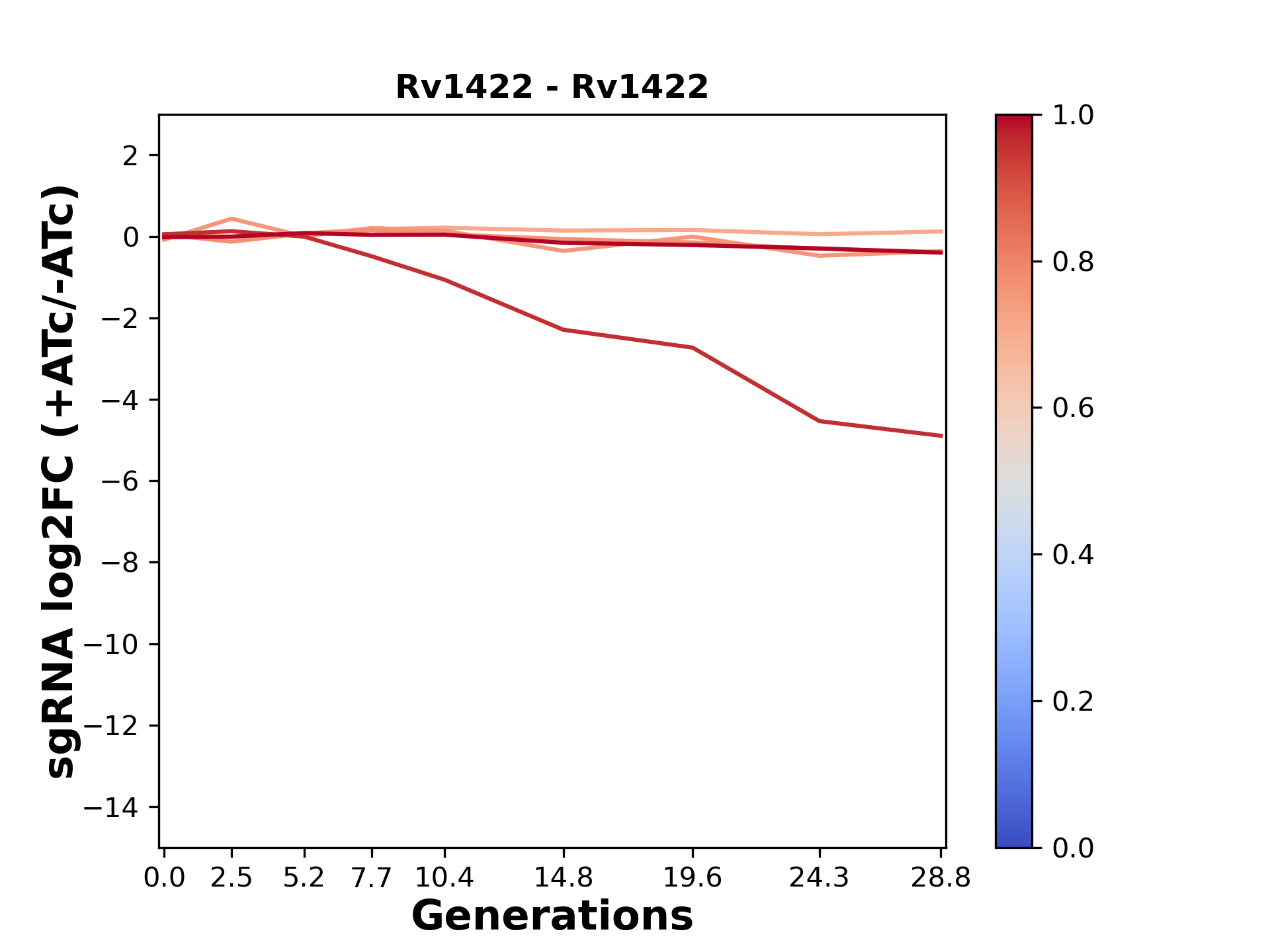 Experiment: We designed an M. tuberculosis CRISPRi library (RLC12) to target all annotated Mtb genes with single guide RNAs (sgRNAs) of varying predicted knockdown efficiencies. In parallel, we constructed a M. smegmatis CRISPRi library (RLC11) to target all annotated Msmeg genes, similar to the Mtb sgRNA library. RLC12 was transformed into M. tuberculosis H37Rv; RLC11 into M. smegmatis mc2-155. We passaged both CRISPRi libraries for nearly 30 generations in the presence or absence of the CRISPRi-inducer anhydrotetracycline (ATc). At the indicated timepoints, genomic DNA was harvested and the representation of individual sgRNAs was counted using Illumina sequencing. Here, we show sgRNA log2 fold-change values (L2FC) (plus versus minus ATc) over consecutive generations for sgRNAs targeting the gene you selected. sgRNAs are color-coded based on their predicted strength from blue (strength=0; weak) to red (strength=1; strong).