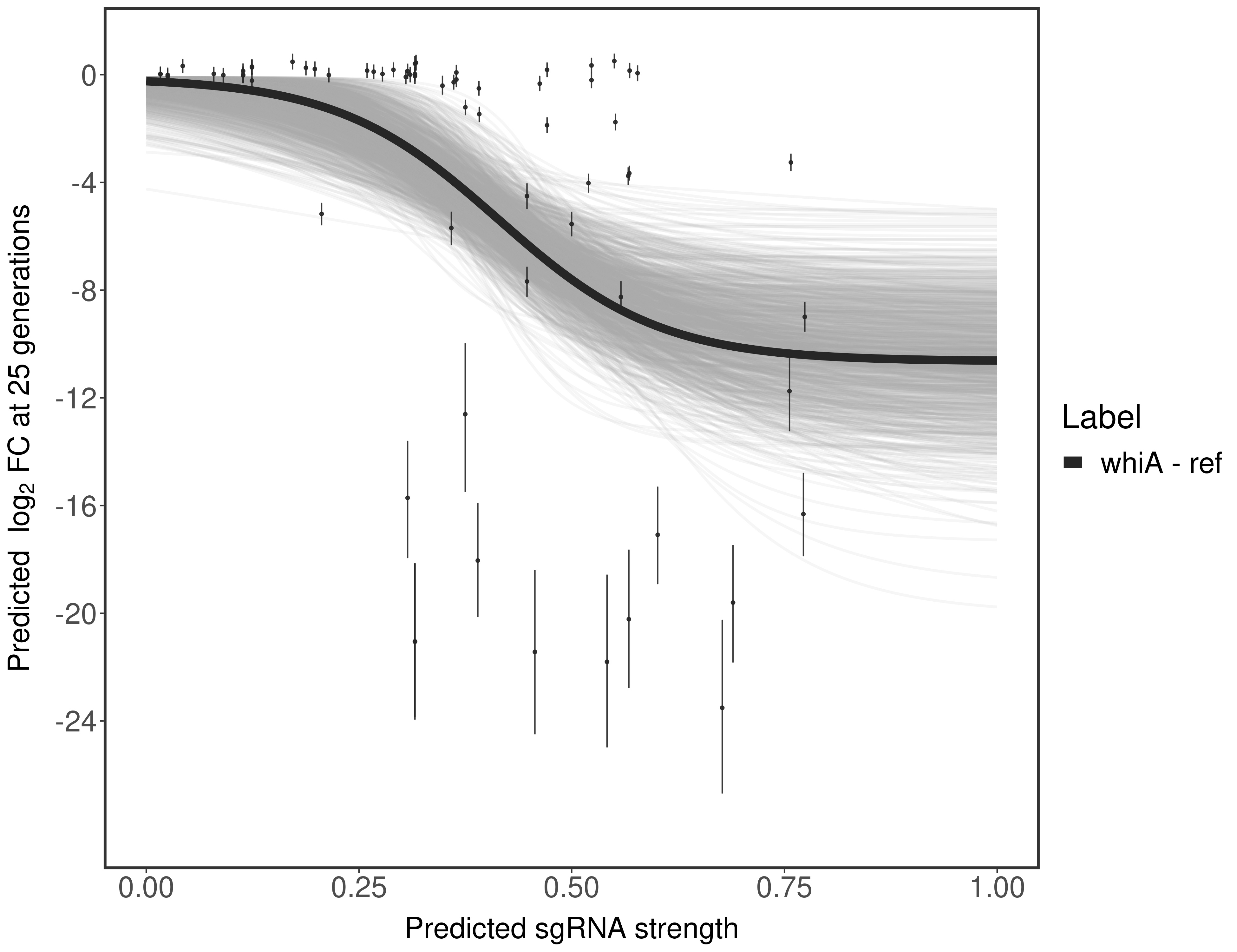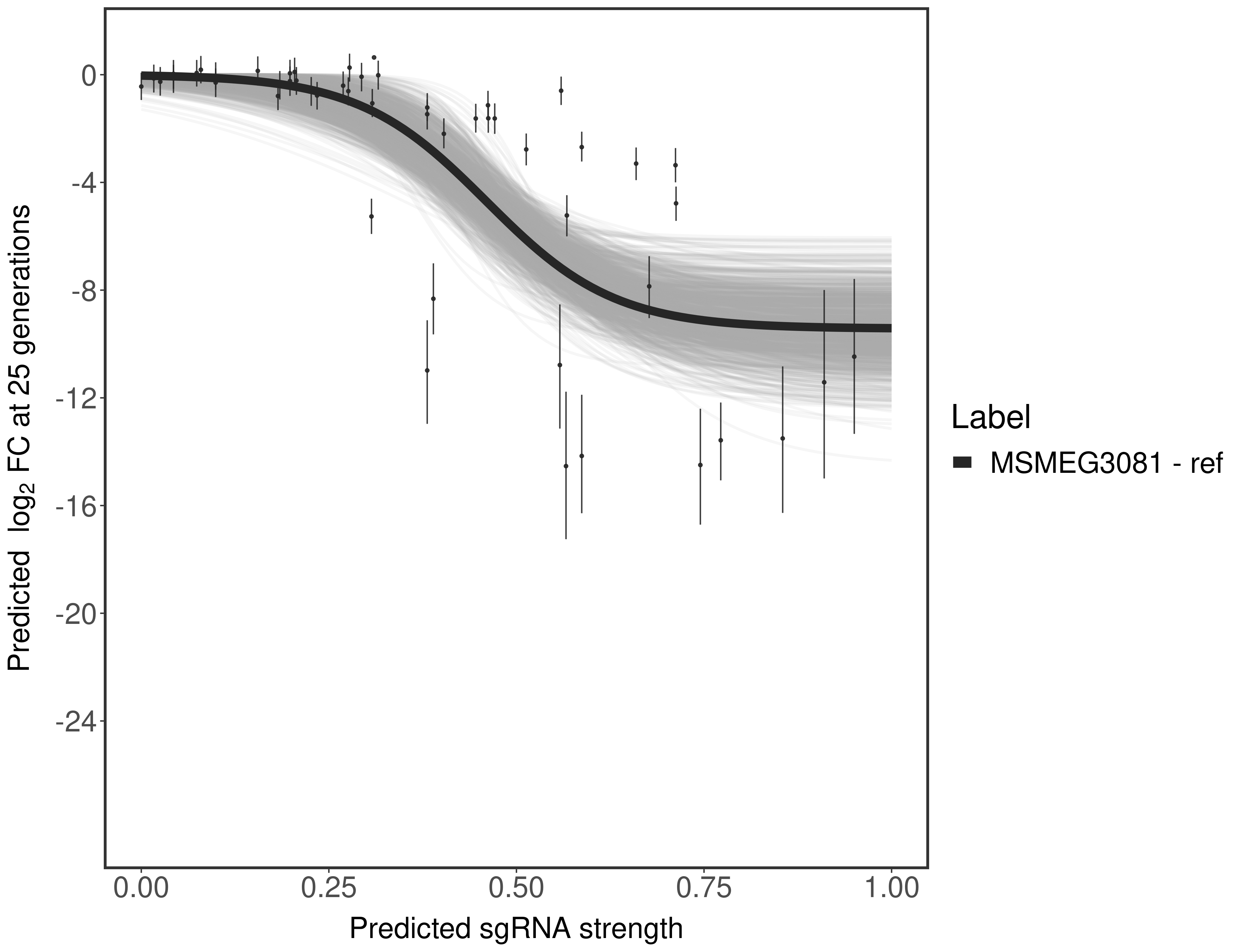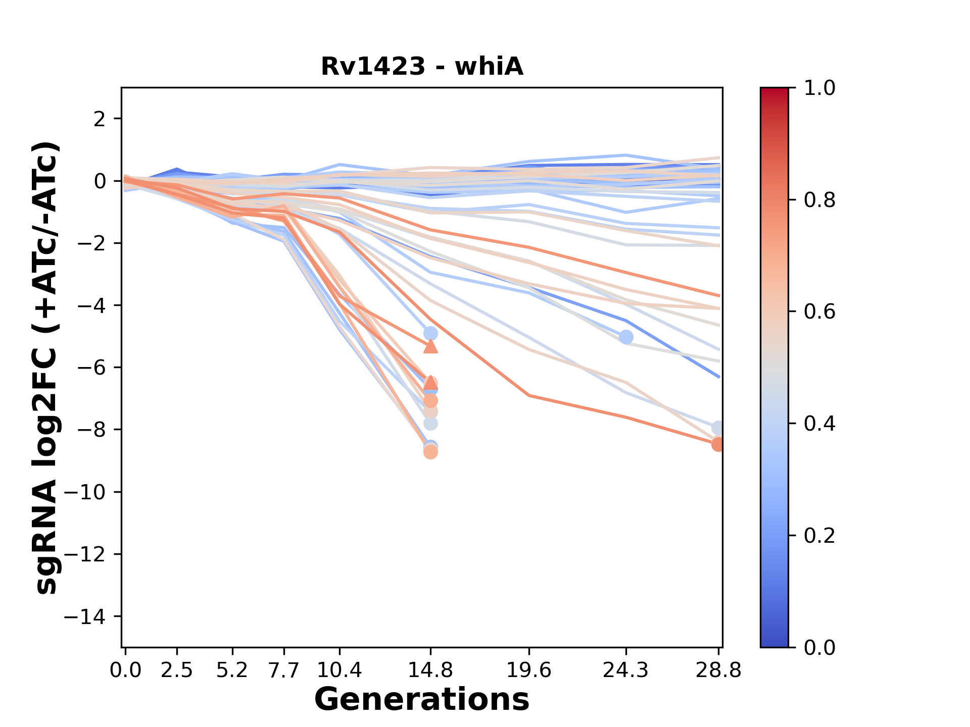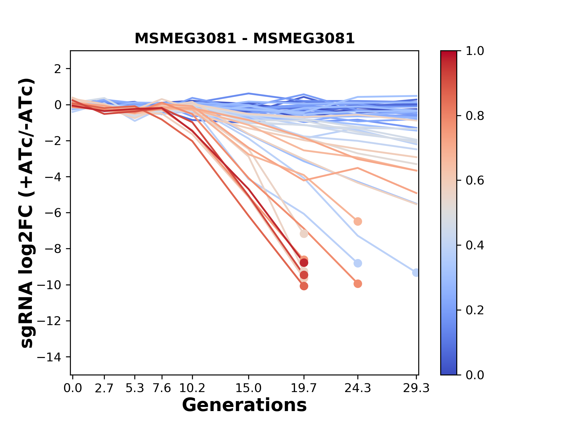 Experiment: We designed an M. tuberculosis CRISPRi library (RLC12) to target all annotated Mtb genes with single guide RNAs (sgRNAs) of varying predicted knockdown efficiencies. In parallel, we constructed a M. smegmatis CRISPRi library (RLC11) to target all annotated Msmeg genes, similar to the Mtb sgRNA library. RLC12 was transformed into M. tuberculosis H37Rv; RLC11 into M. smegmatis mc2-155. We passaged both CRISPRi libraries for nearly 30 generations in the presence or absence of the CRISPRi-inducer anhydrotetracycline (ATc). At the indicated timepoints, genomic DNA was harvested and the representation of individual sgRNAs was counted using Illumina sequencing. Here, we show sgRNA log2 fold-change values (L2FC) (plus versus minus ATc) over consecutive generations for sgRNAs targeting the gene you selected. sgRNAs are color-coded based on their predicted strength from blue (strength=0; weak) to red (strength=1; strong).