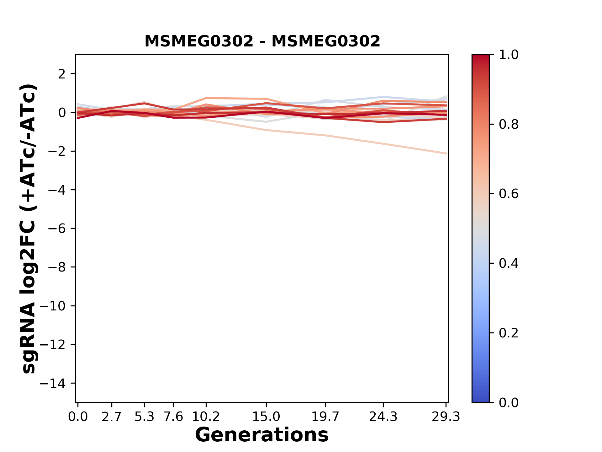 Here, we show sgRNA log2 fold-change values (L2FC) (plus versus minus ATc) over consecutive generations for sgRNAs targeting the gene you selected.