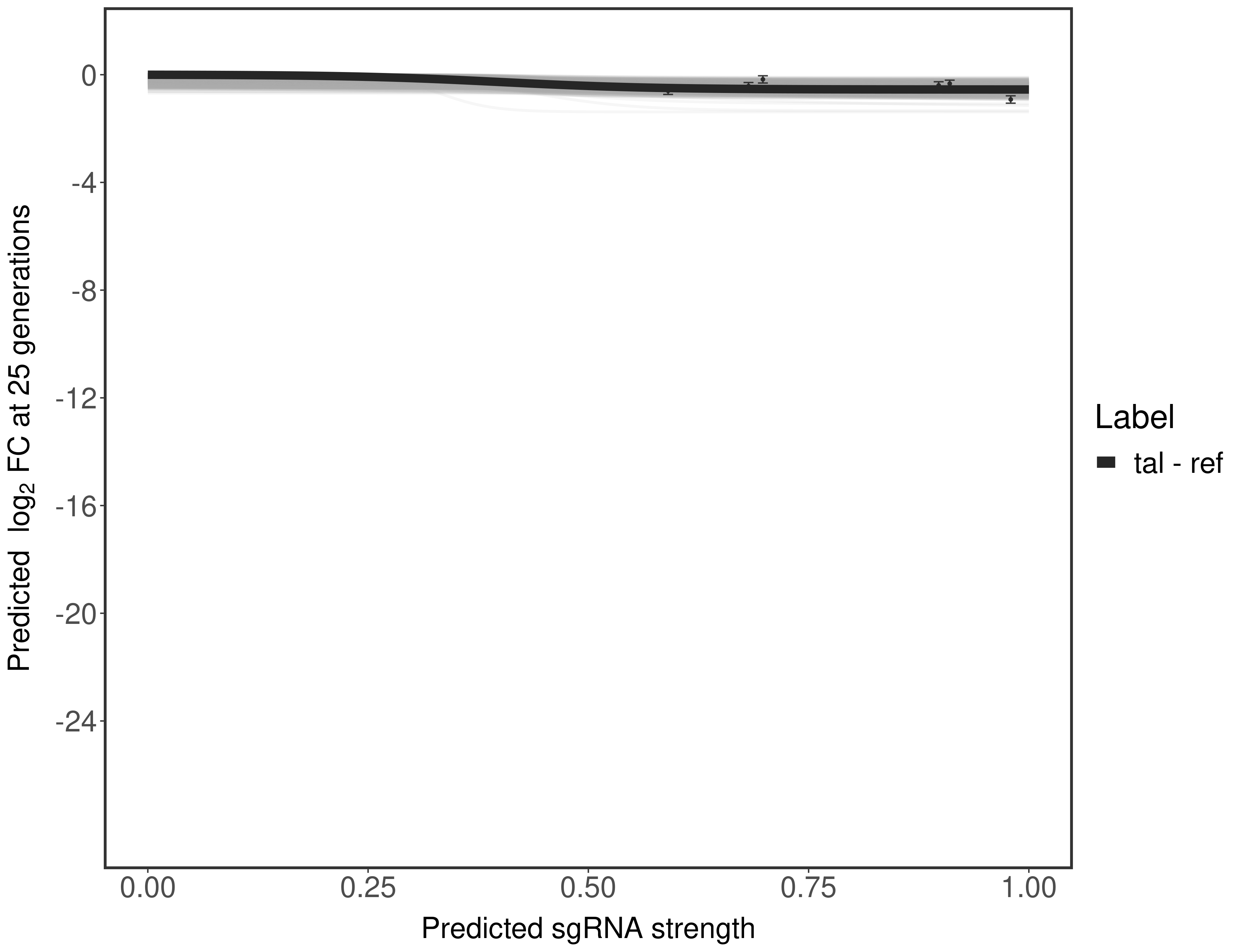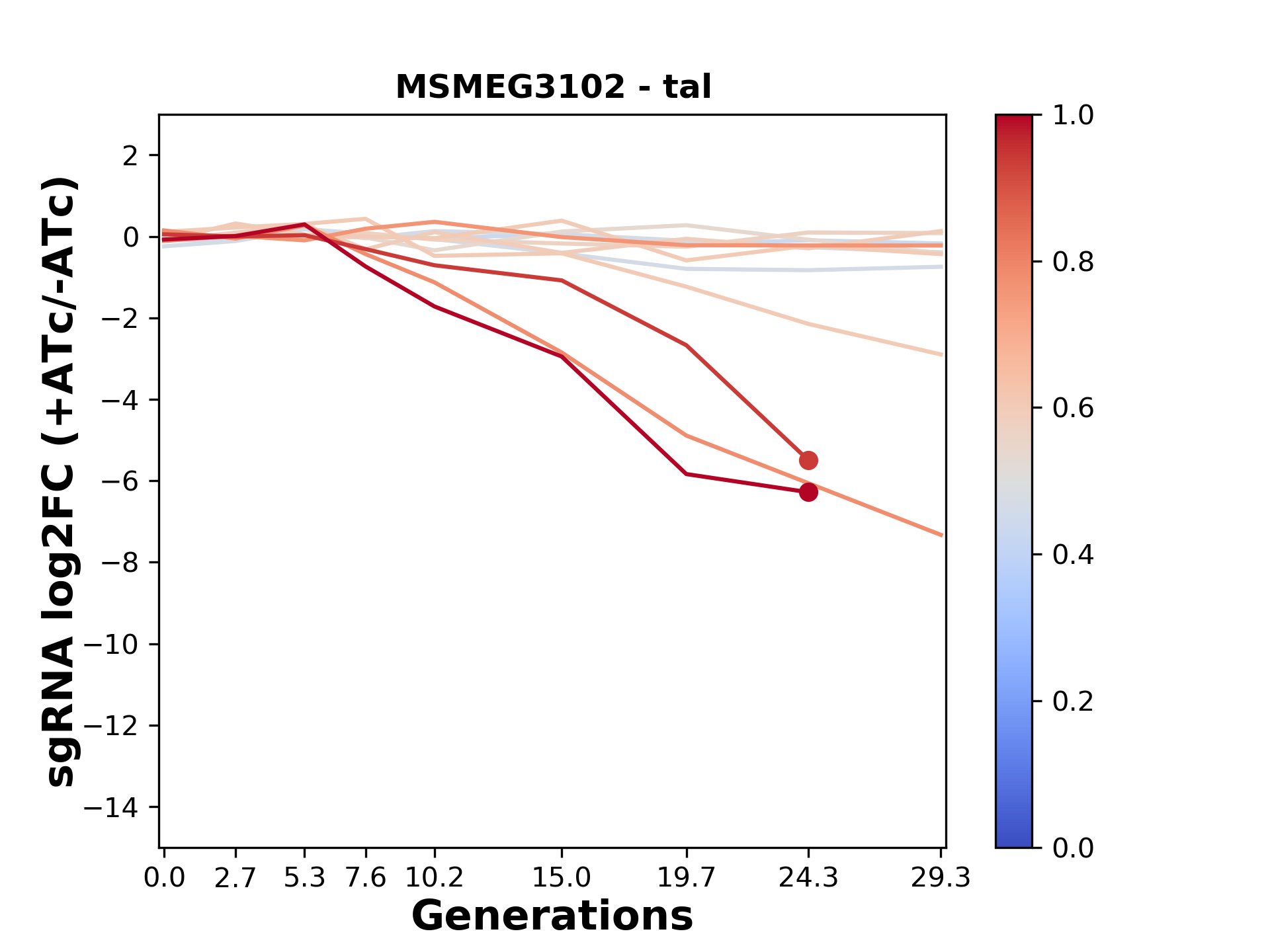 Here, we show sgRNA log2 fold-change values (L2FC) (plus versus minus ATc) over consecutive generations for sgRNAs targeting the gene you selected.