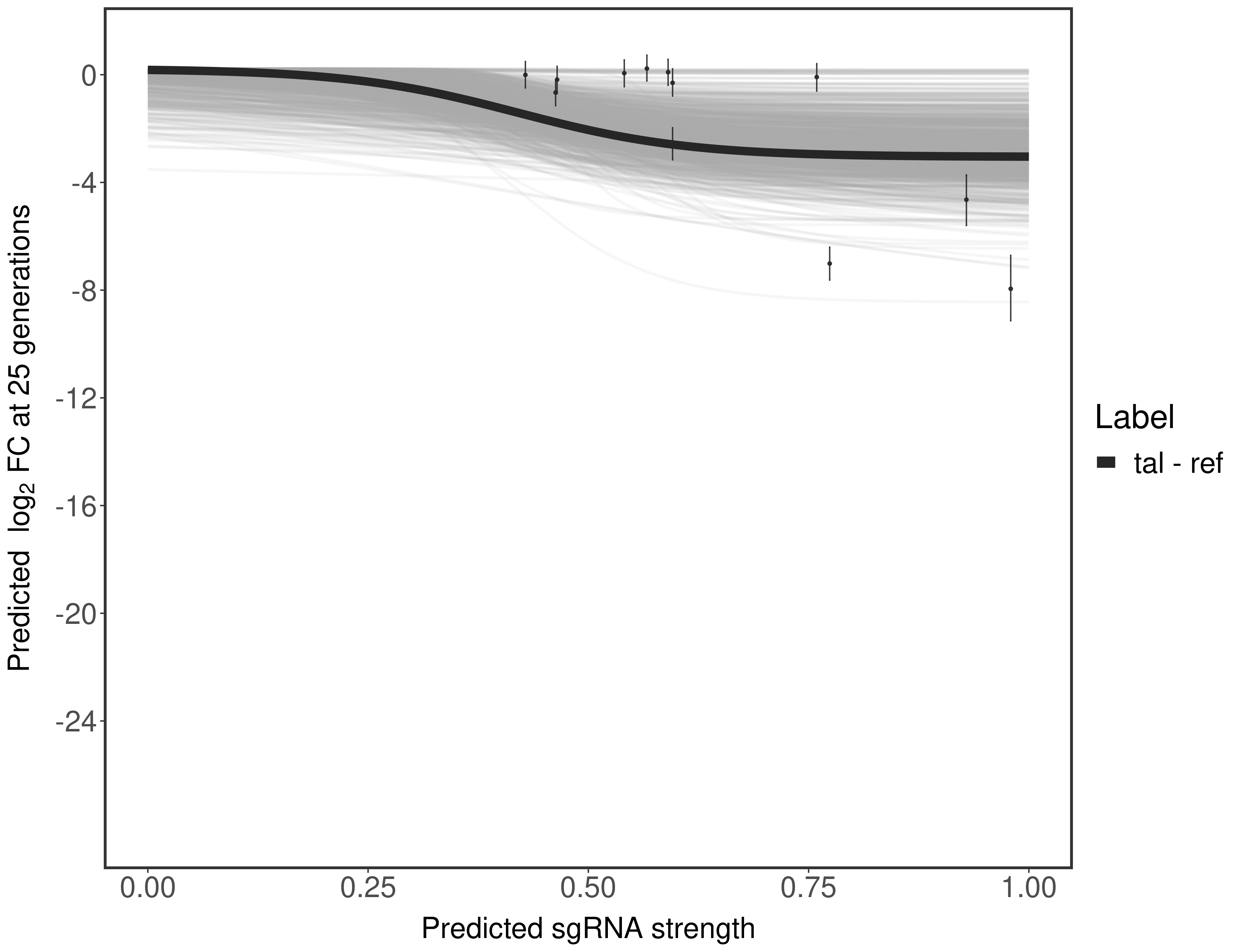 In order to quantify gene vulnerability, data were subsequently analyzed with a hierarchical model at the sgRNA level (two-line model) and gene level (Hill curve). The vulnerability quantification is shown below. [More information]