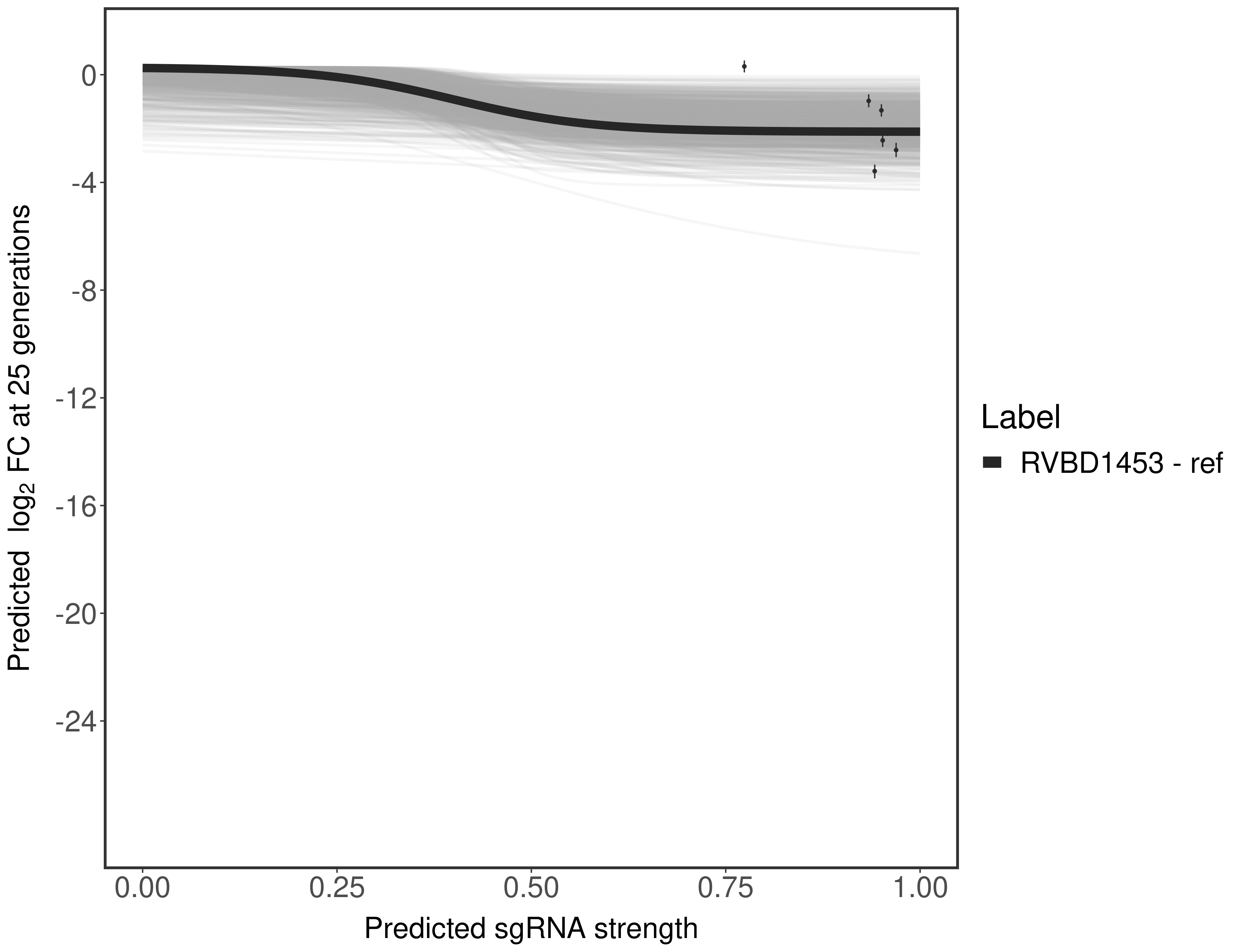 Experiment: We designed an M. tuberculosis CRISPRi library (RLC12) to target all annotated Mtb genes with single guide RNAs (sgRNAs) of varying predicted knockdown efficiencies. In parallel, we constructed a M. smegmatis CRISPRi library (RLC11) to target all annotated Msmeg genes, similar to the Mtb sgRNA library. RLC12 was transformed into M. tuberculosis H37Rv; RLC11 into M. smegmatis mc2-155. We passaged both CRISPRi libraries for nearly 30 generations in the presence or absence of the CRISPRi-inducer anhydrotetracycline (ATc). At the indicated timepoints, genomic DNA was harvested and the representation of individual sgRNAs was counted using Illumina sequencing. Here, we show sgRNA log2 fold-change values (L2FC) (plus versus minus ATc) over consecutive generations for sgRNAs targeting the gene you selected. sgRNAs are color-coded based on their predicted strength from blue (strength=0; weak) to red (strength=1; strong).