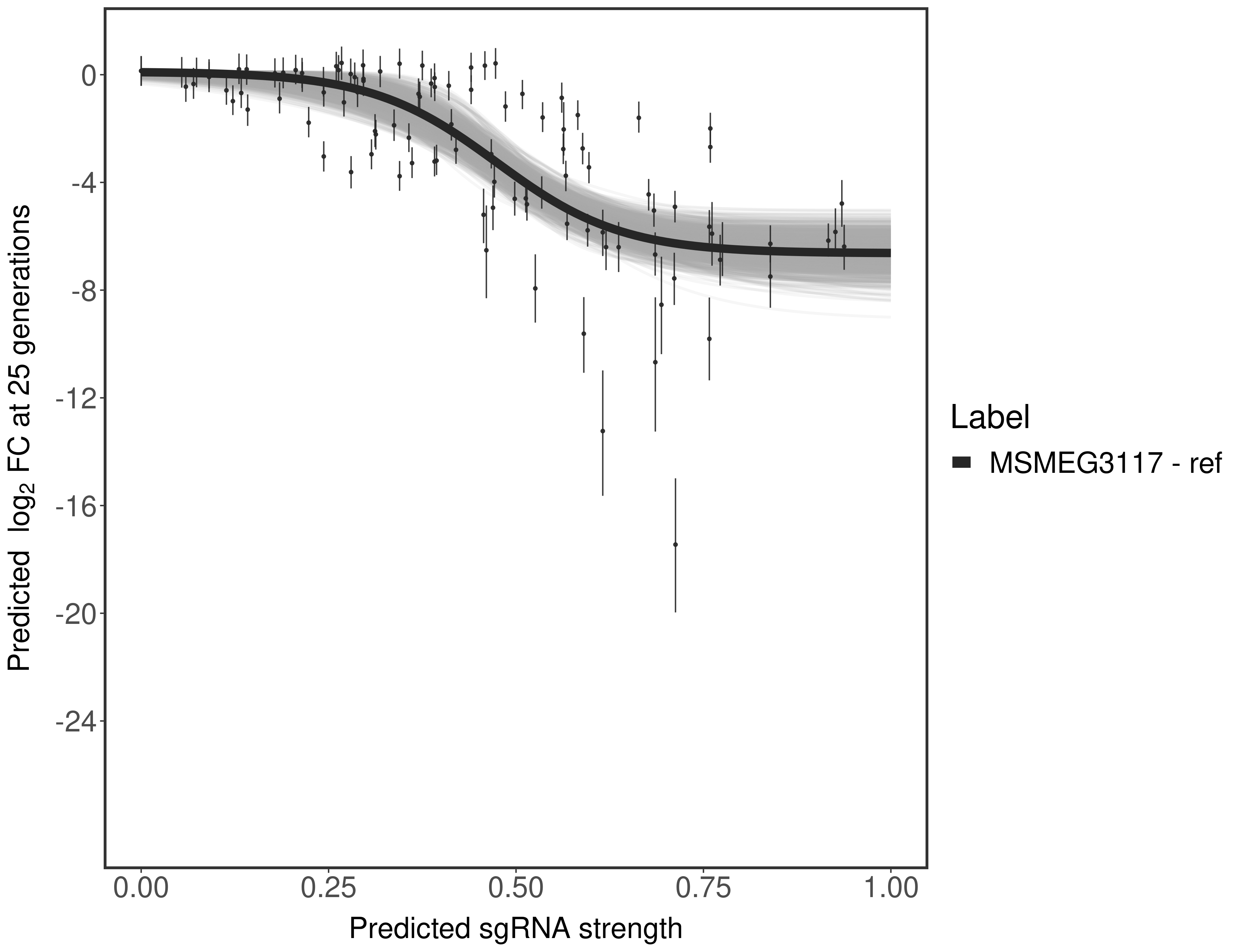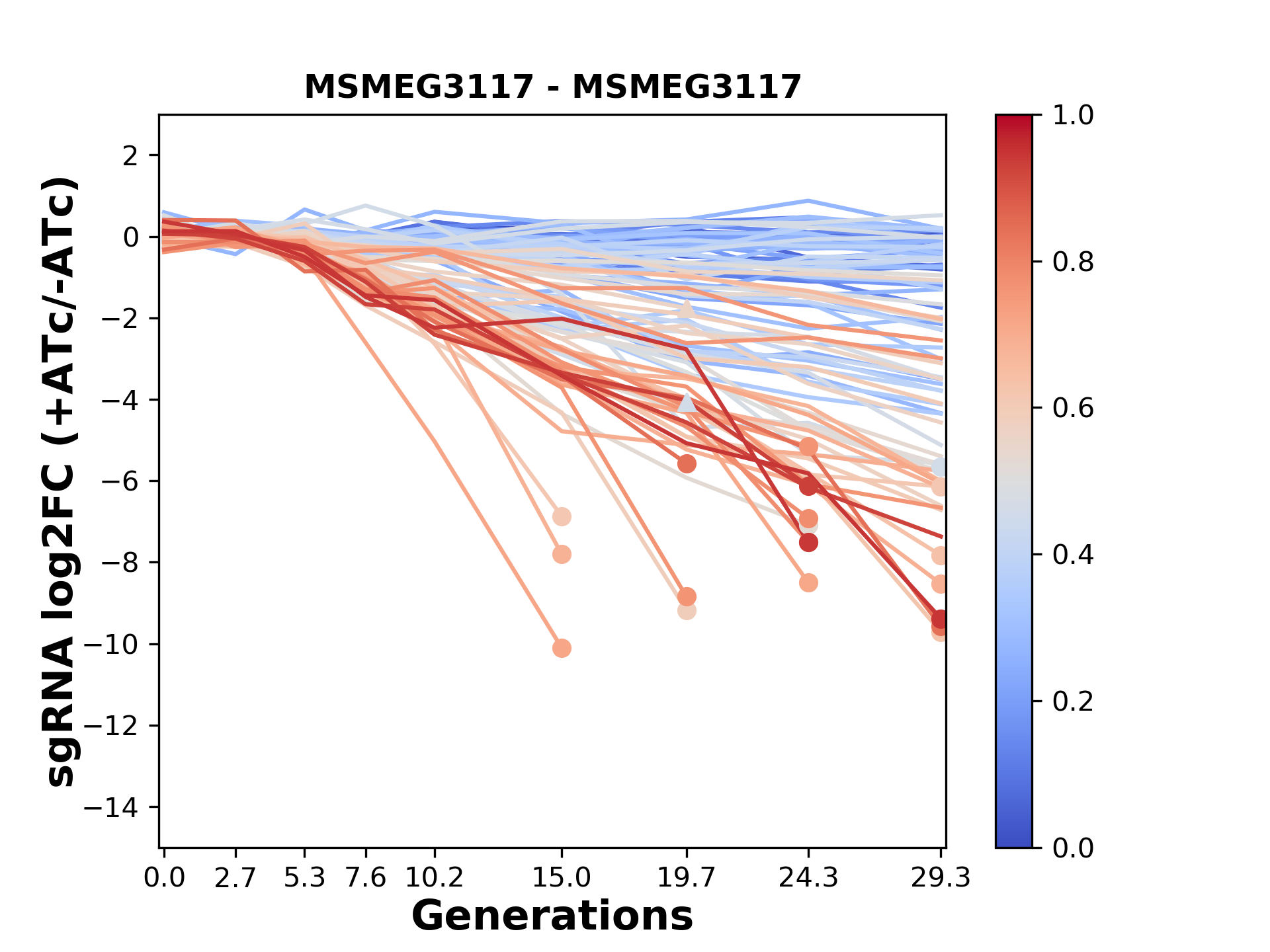 Experiment: We designed an M. tuberculosis CRISPRi library (RLC12) to target all annotated Mtb genes with single guide RNAs (sgRNAs) of varying predicted knockdown efficiencies. In parallel, we constructed a M. smegmatis CRISPRi library (RLC11) to target all annotated Msmeg genes, similar to the Mtb sgRNA library. RLC12 was transformed into M. tuberculosis H37Rv; RLC11 into M. smegmatis mc2-155. We passaged both CRISPRi libraries for nearly 30 generations in the presence or absence of the CRISPRi-inducer anhydrotetracycline (ATc). At the indicated timepoints, genomic DNA was harvested and the representation of individual sgRNAs was counted using Illumina sequencing. Here, we show sgRNA log2 fold-change values (L2FC) (plus versus minus ATc) over consecutive generations for sgRNAs targeting the gene you selected. sgRNAs are color-coded based on their predicted strength from blue (strength=0; weak) to red (strength=1; strong).