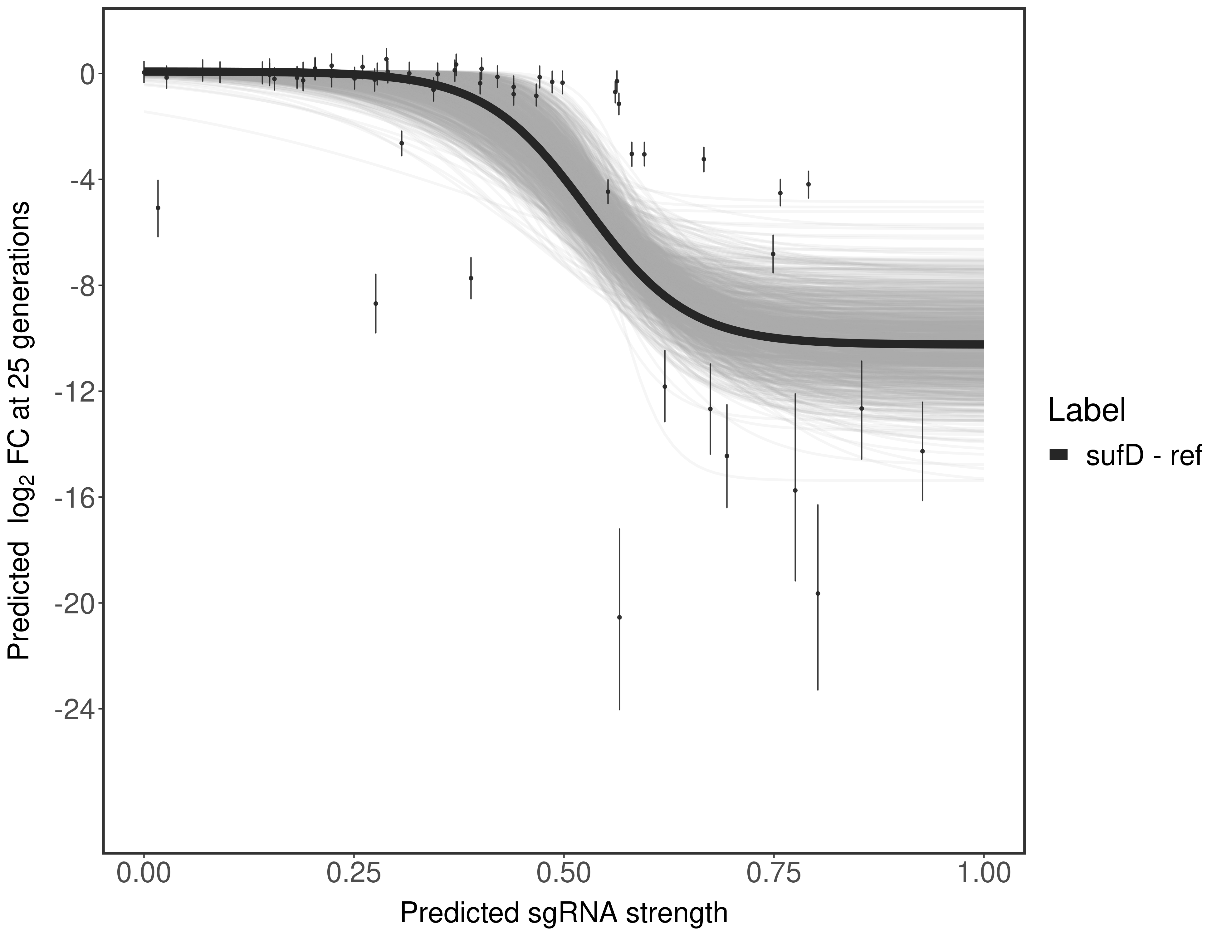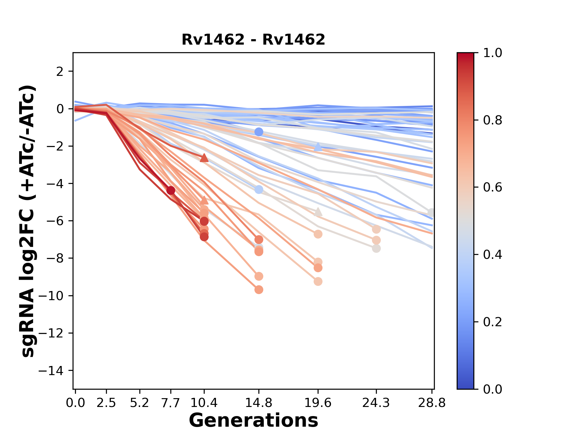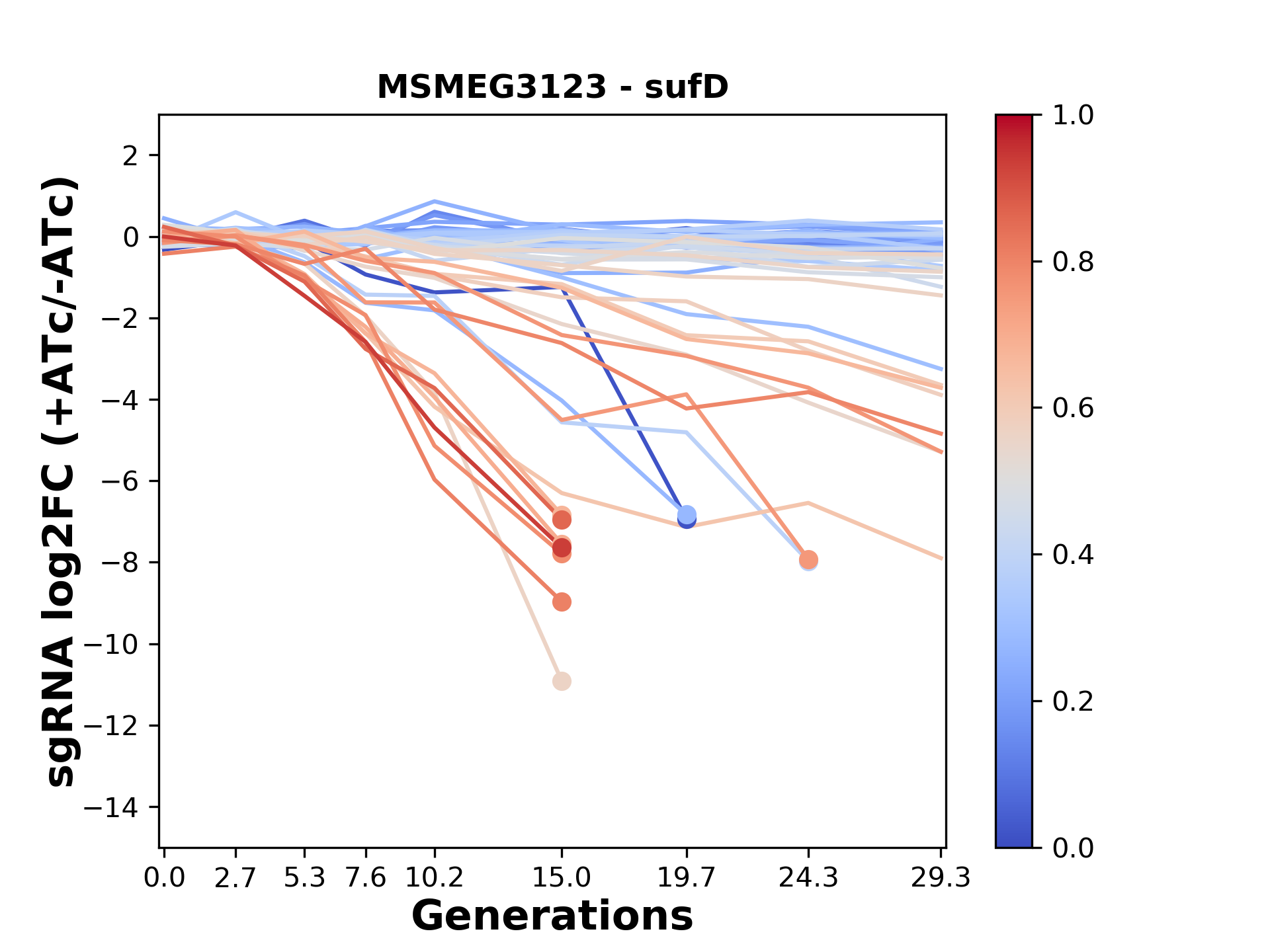 Here, we show sgRNA log2 fold-change values (L2FC) (plus versus minus ATc) over consecutive generations for sgRNAs targeting the gene you selected.