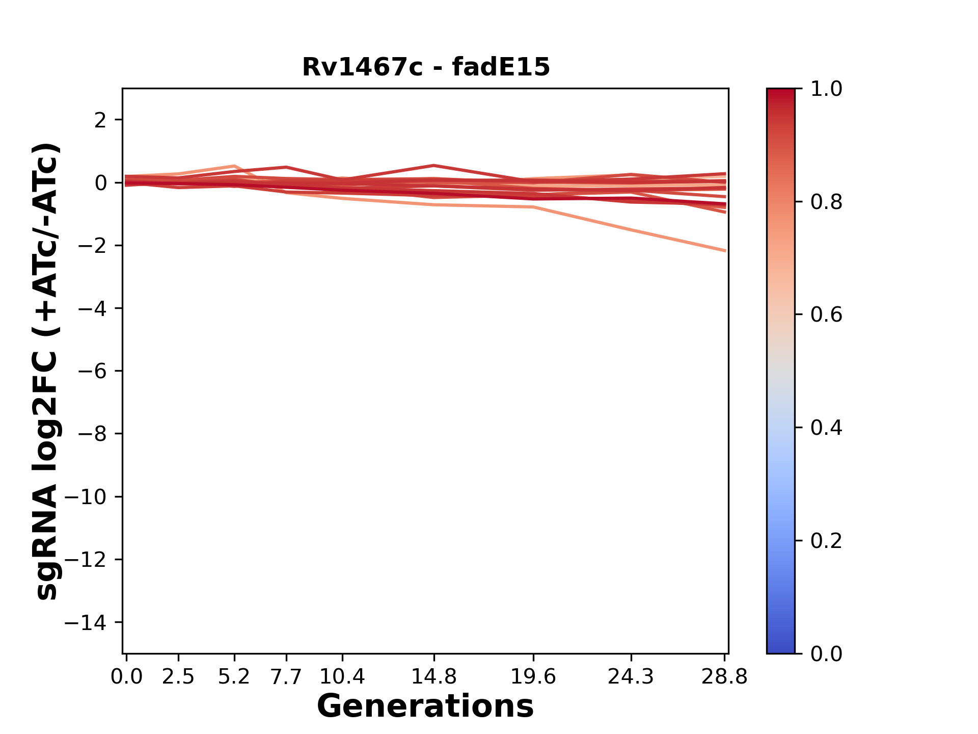 Here, we show sgRNA log2 fold-change values (L2FC) (plus versus minus ATc) over consecutive generations for sgRNAs targeting the gene you selected.