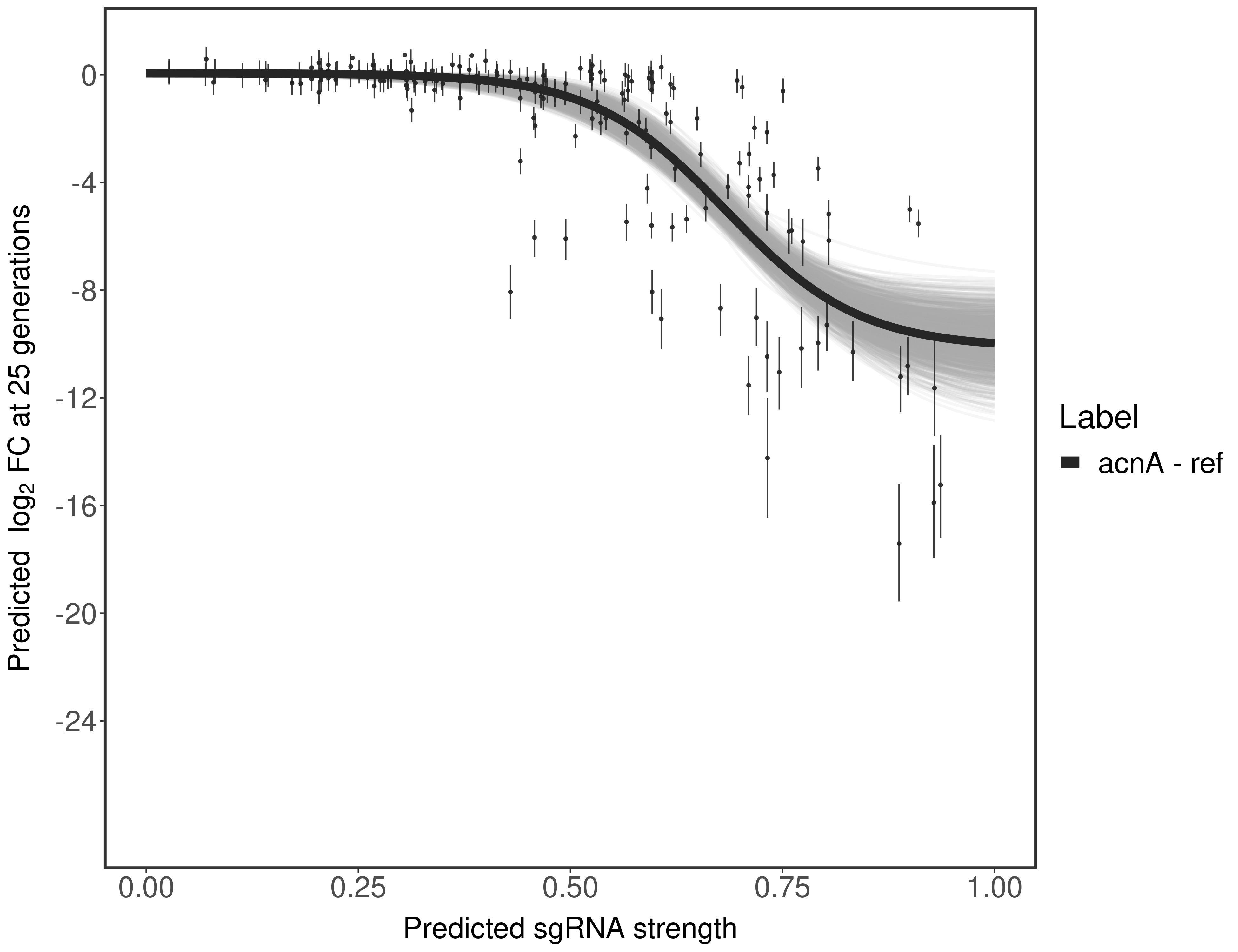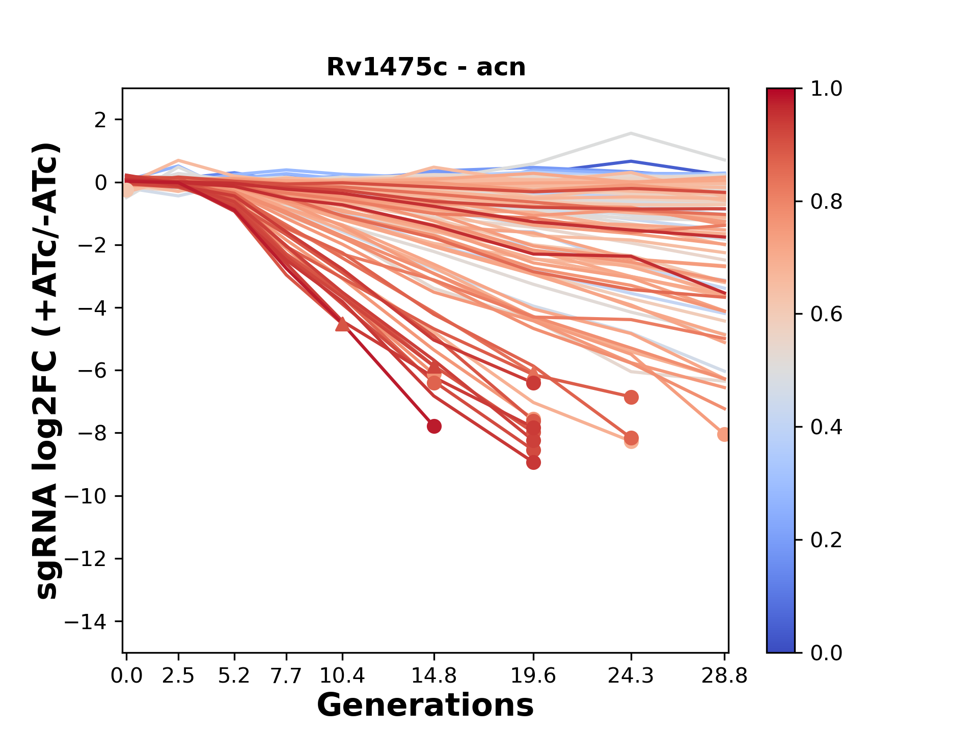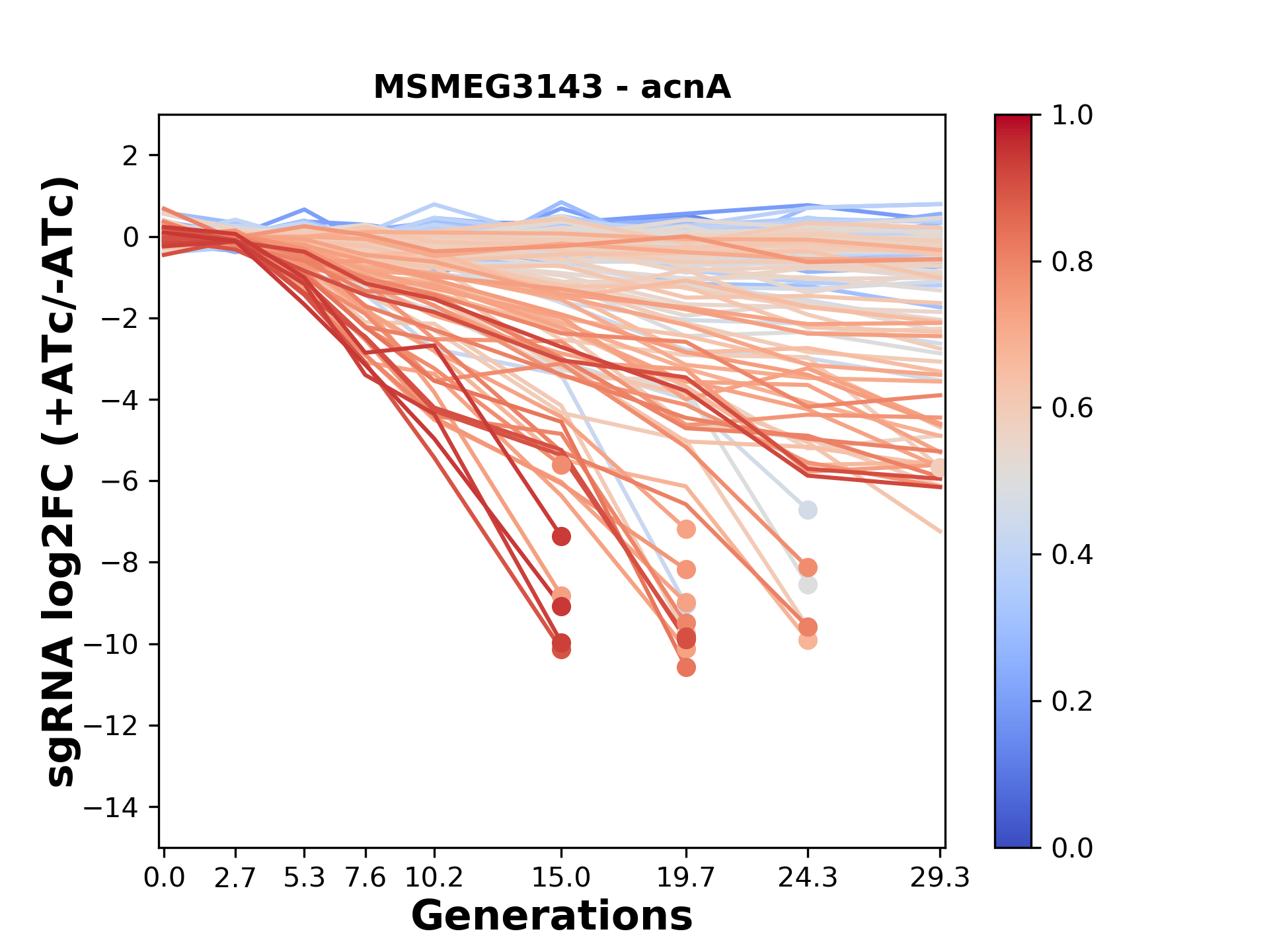 Experiment: We designed an M. tuberculosis CRISPRi library (RLC12) to target all annotated Mtb genes with single guide RNAs (sgRNAs) of varying predicted knockdown efficiencies. In parallel, we constructed a M. smegmatis CRISPRi library (RLC11) to target all annotated Msmeg genes, similar to the Mtb sgRNA library. RLC12 was transformed into M. tuberculosis H37Rv; RLC11 into M. smegmatis mc2-155. We passaged both CRISPRi libraries for nearly 30 generations in the presence or absence of the CRISPRi-inducer anhydrotetracycline (ATc). At the indicated timepoints, genomic DNA was harvested and the representation of individual sgRNAs was counted using Illumina sequencing. Here, we show sgRNA log2 fold-change values (L2FC) (plus versus minus ATc) over consecutive generations for sgRNAs targeting the gene you selected. sgRNAs are color-coded based on their predicted strength from blue (strength=0; weak) to red (strength=1; strong).